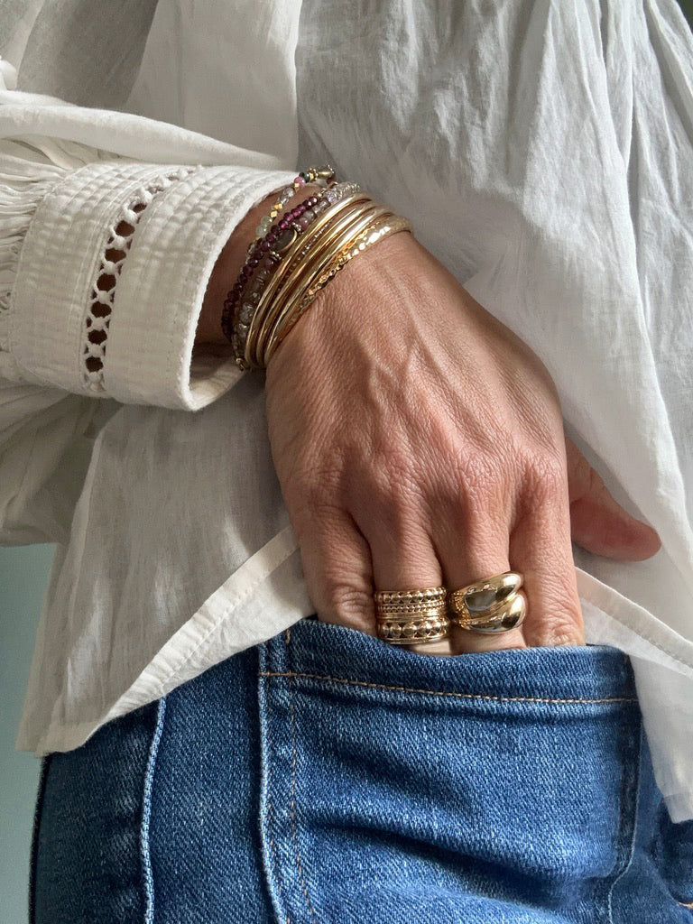 La bague aux allures géométriques ponctué de pastilles rondes. Il est en laiton plaqué or 18 carats 750/000 - 3 microns.