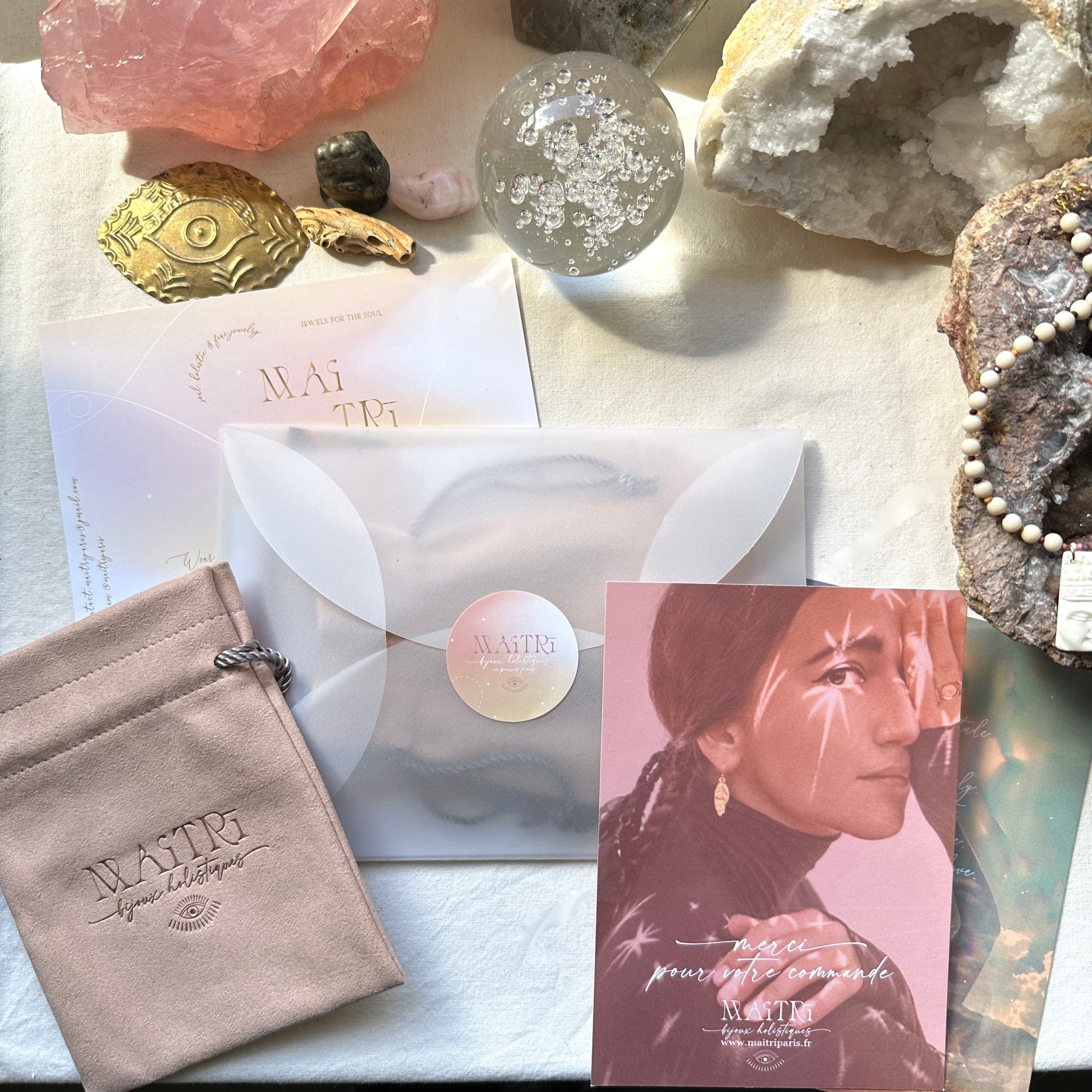 La bague SUZIE sera livrée dans un écrin Maitri Blush avec 3 cartes de la marque et emballé dans une délicate pochette translucide prête à offrir.