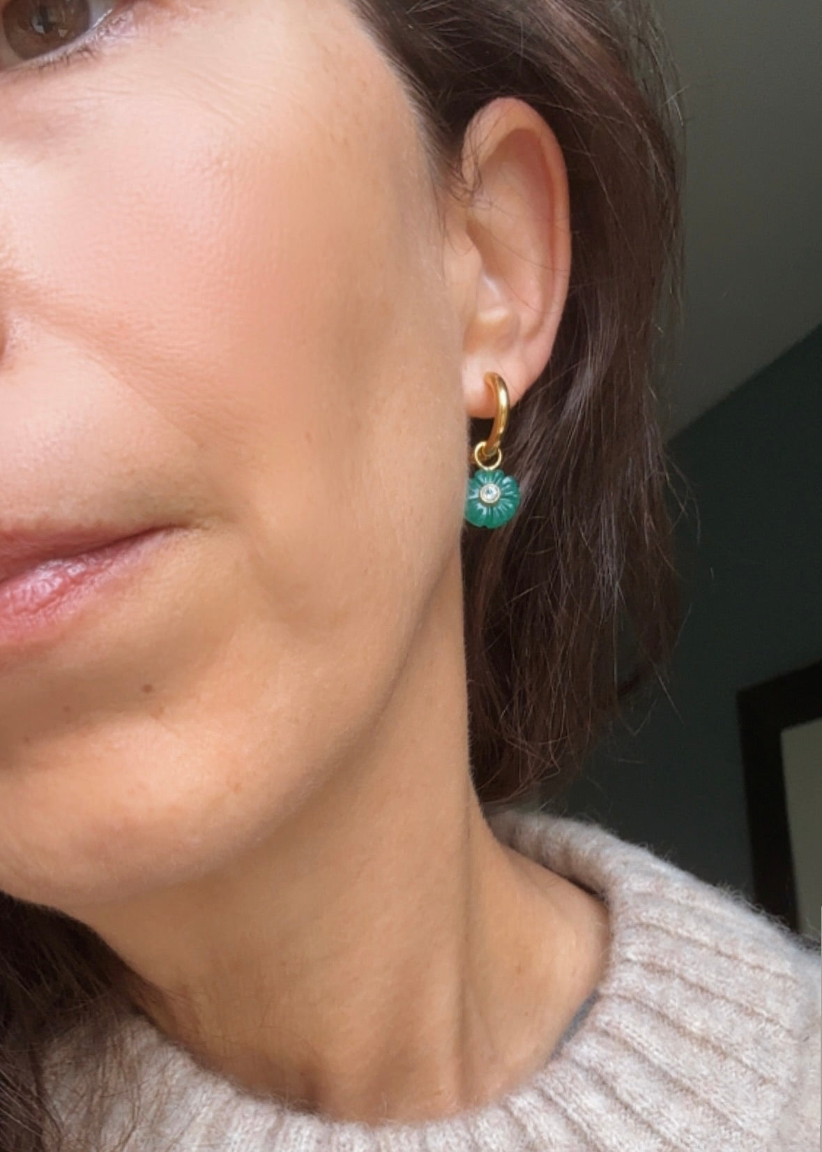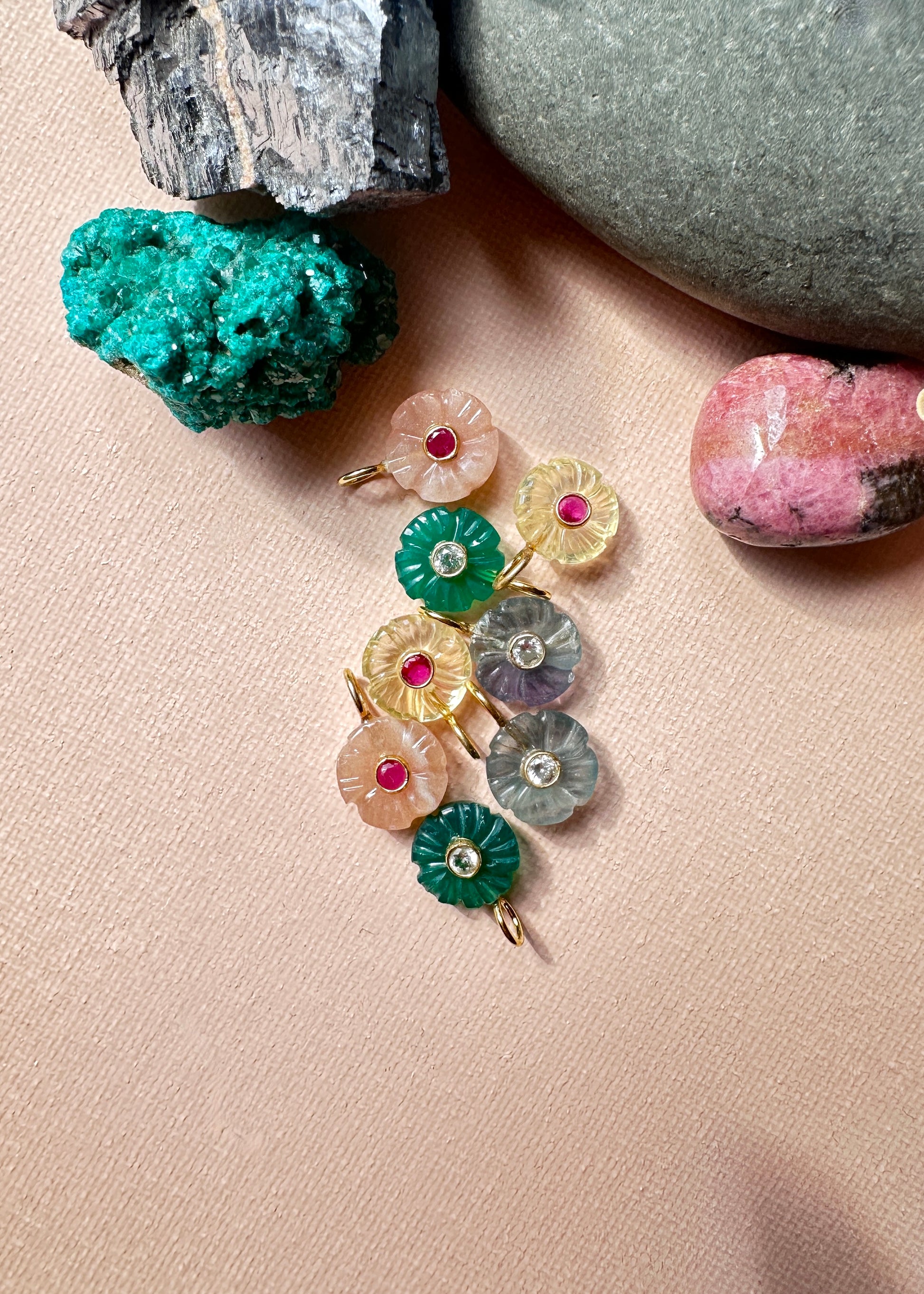 Les fleurs se déclinent en quatre pierres fines : sunstone (orange doux), onyx vert, citrine (jaune pâle) et fluorite (bleu/violet les variations rayées de la pierre). Adoptez-les pour une alliance subtile de poésie et d’originalité maîtrisée.