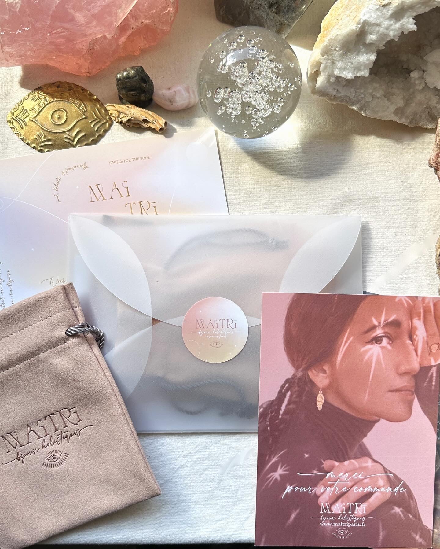 Chaque paire sera livrée dans un écrin Maitri Blush avec 3 cartes de la marque, le tout enveloppé dans une pochette translucide prête à offrir.