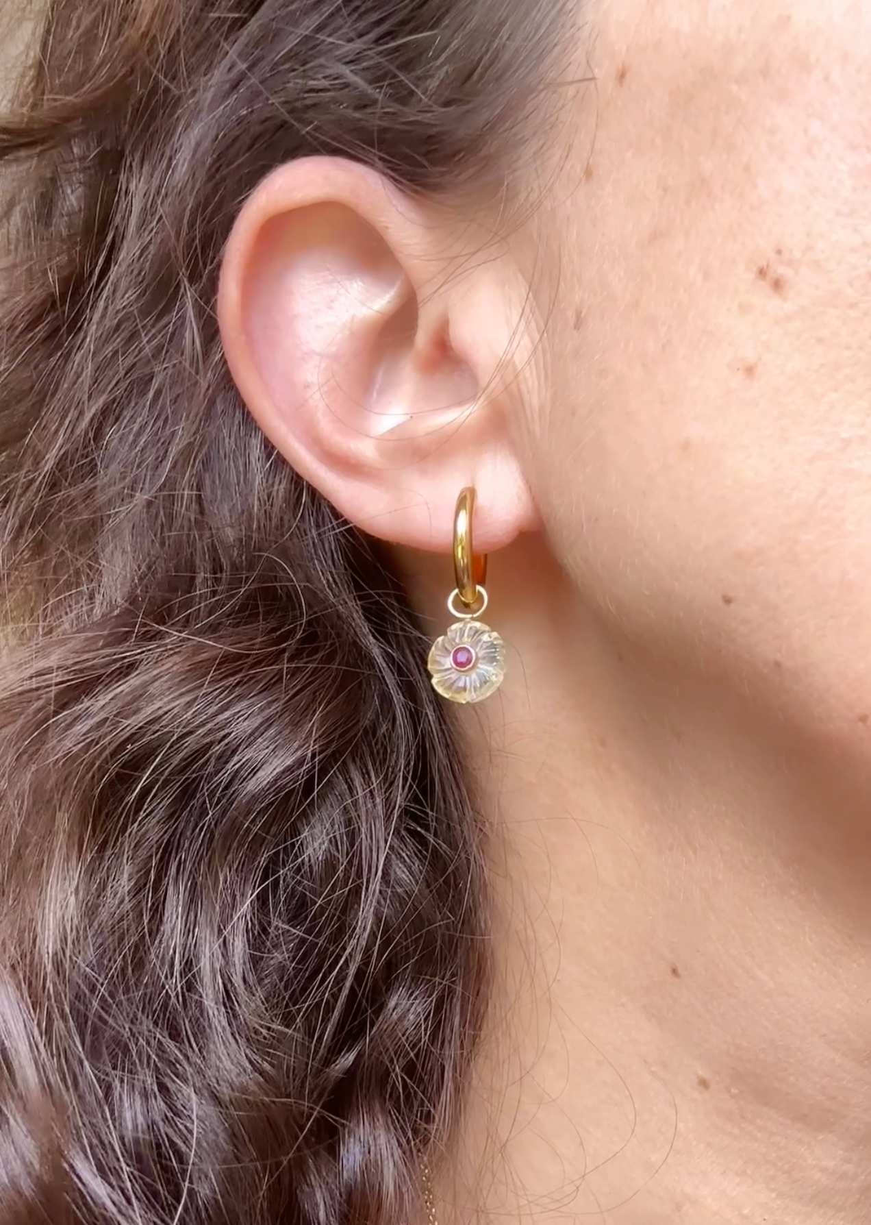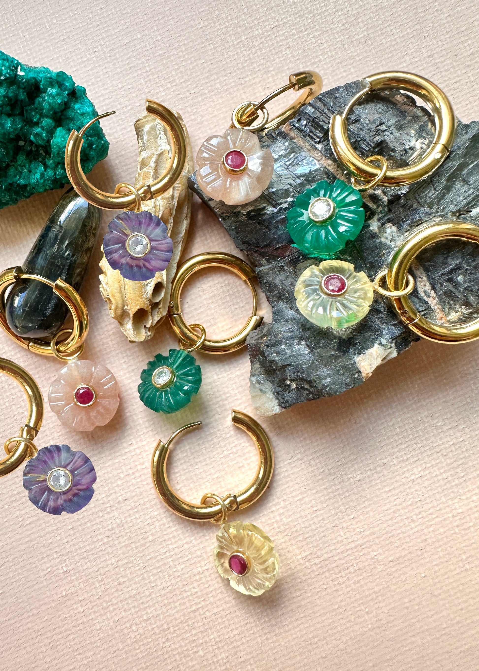 Les boucles d’oreilles Ada imagent une fleur en pierre naturelle, minutieusement gravée à la main et ornée d’un insert en rubis ou zircon blanc. La fleur est le symbole de la renaissance et de l'espérance et incarne la résilience face à la maladie.