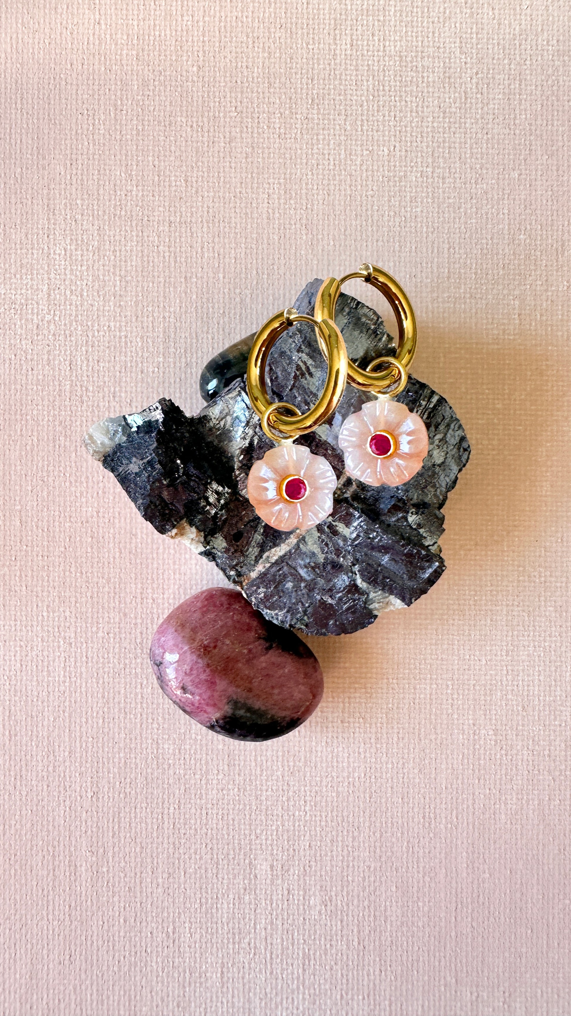 Créoles 17mm en acier inoxydable. Fleur en pierre naturelle gravée avec insert rubis ou zircon blanc.