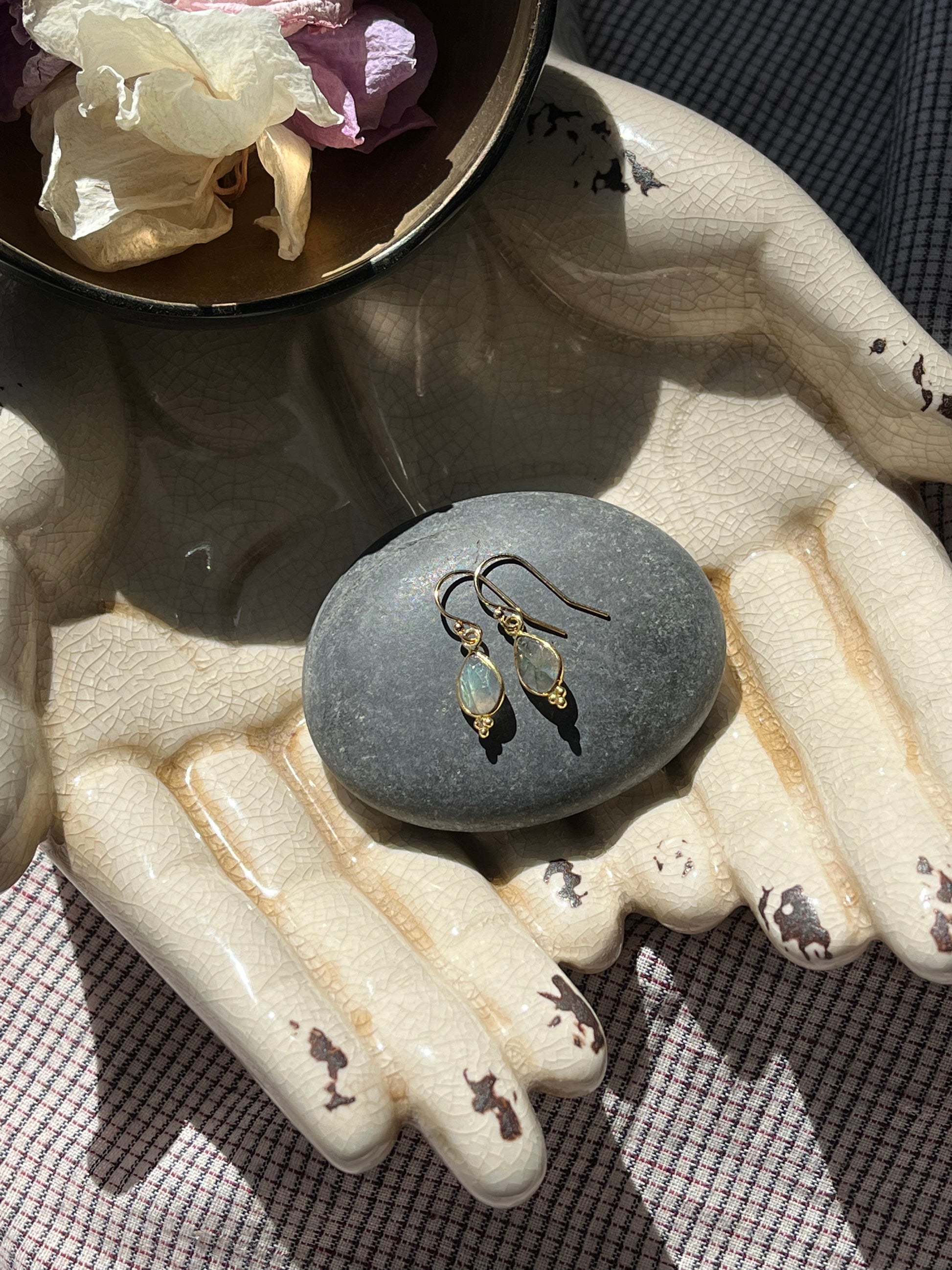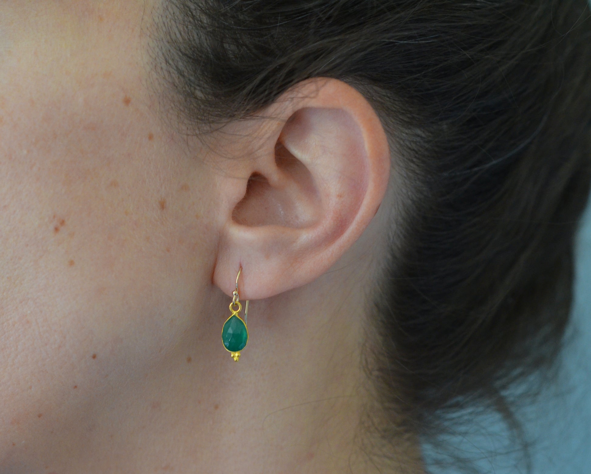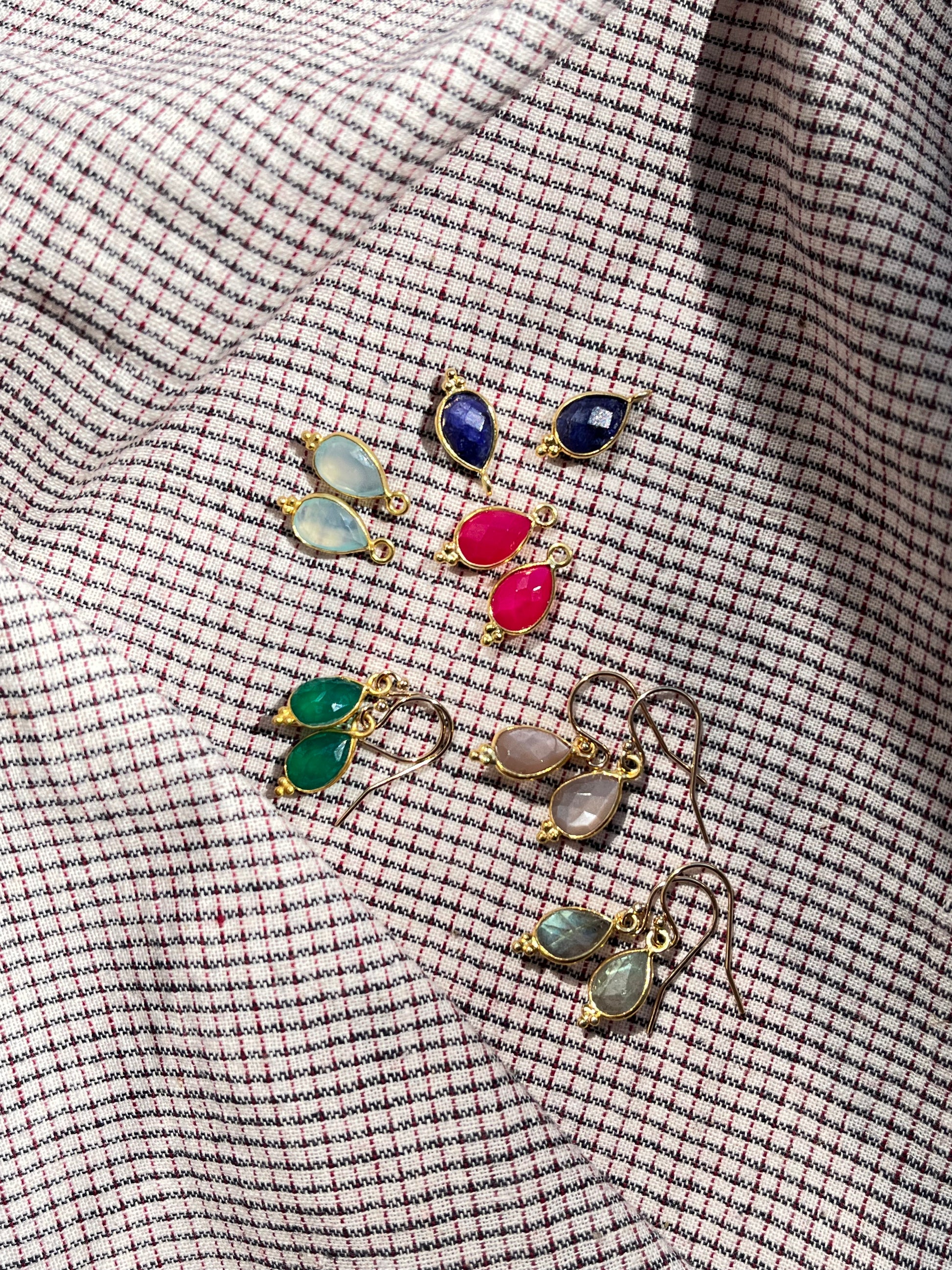 Des petites poires facetées en pierre semi-précieuses avec un crochet en plaqué or gold filled 14 carats hypoallergénique pour des boucles d'oreilles légères, colorées et faciles à porter au quotidien.