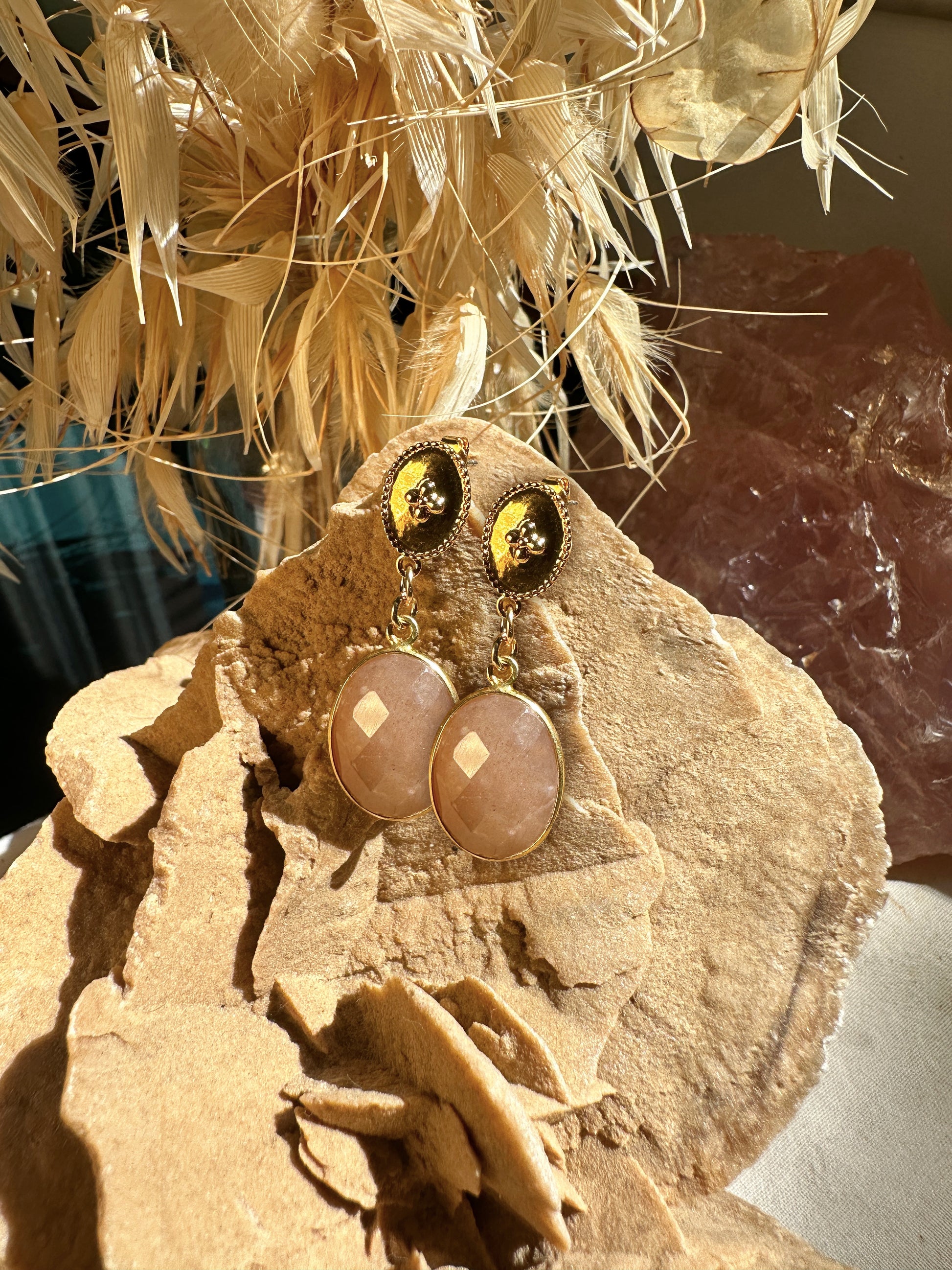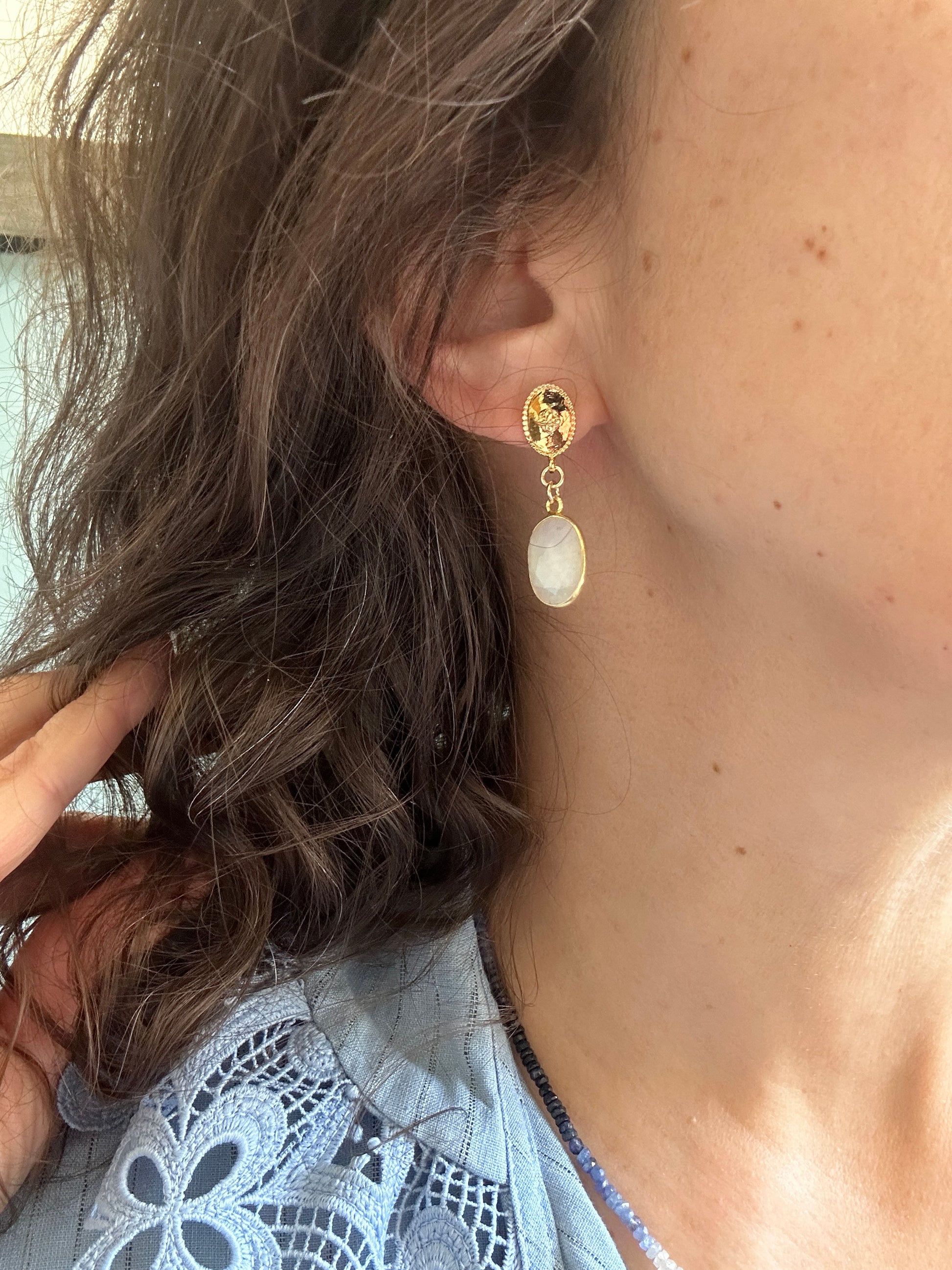 •Motif ovale ORA ciselé 8x11mm (hors anneaux) plaqué or 24K 1 micron / tige oreilles percées+papillon. La tige n'est pas traitée en or, c'est tout à fait normal car cela évite les allergies. Pierres naturelles serties en argent 925 plaquée 1 micron. Anneaux en or gold filled 14K.