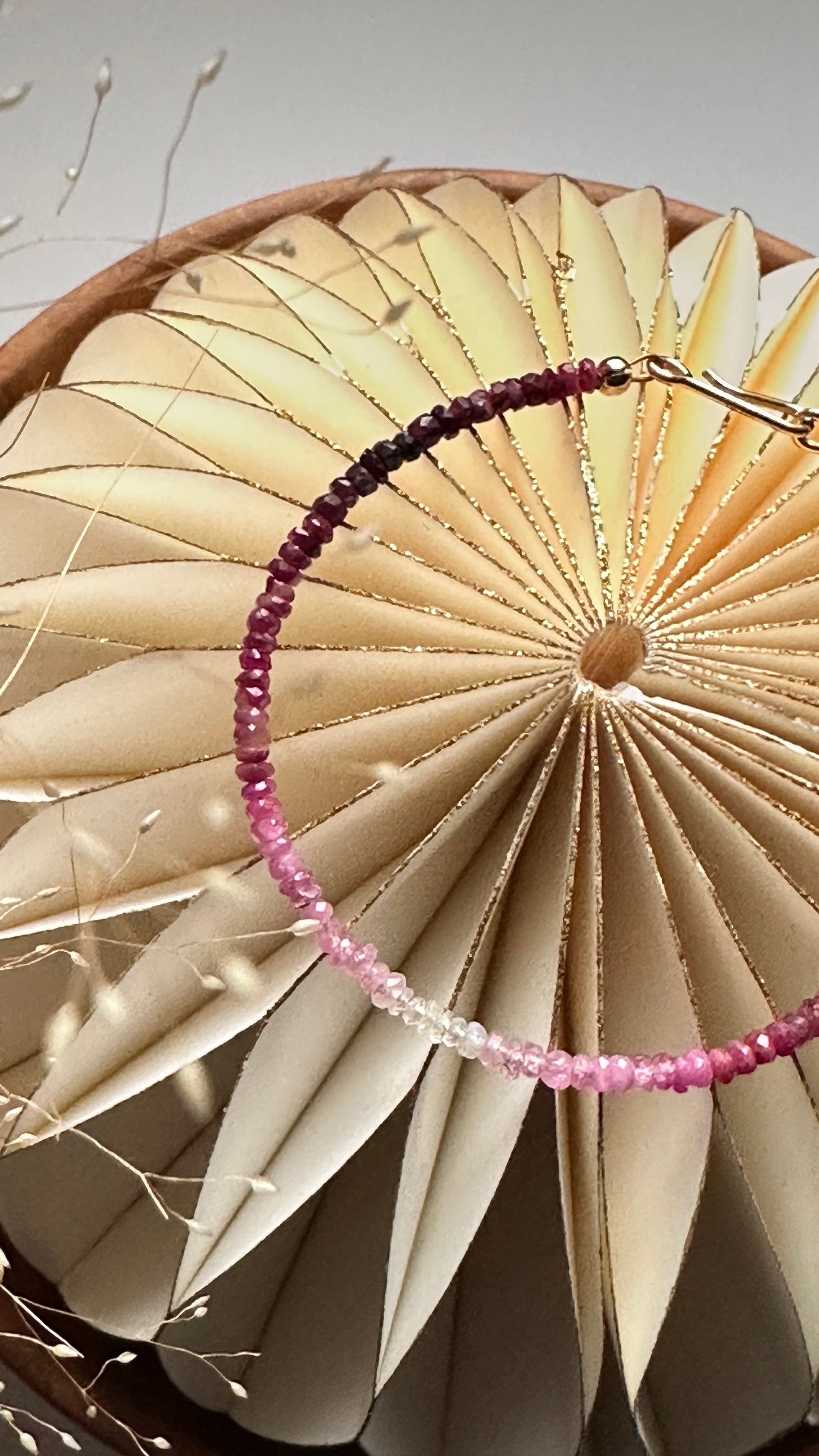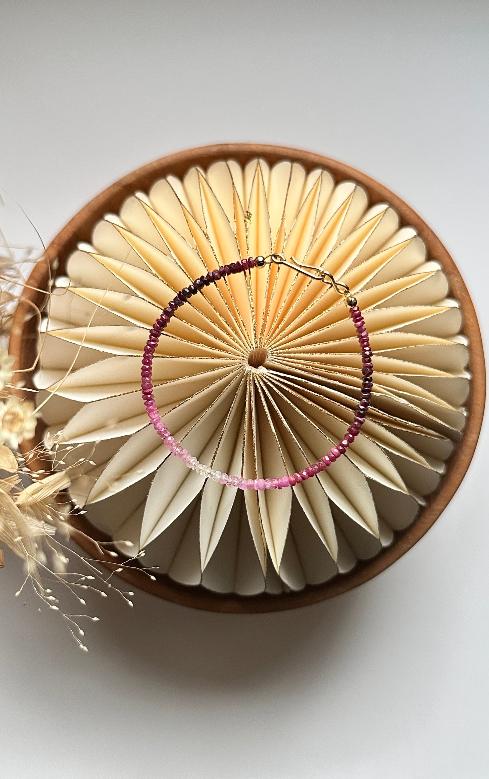 Un bracelet avec un dégradé de rubis ( du blanc, rose pale au grenat) et notre fermoir signature Infinite avec crochet et motif Infini en plaqué or Gold Filled 14 carats.