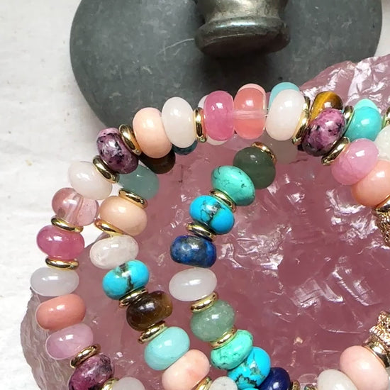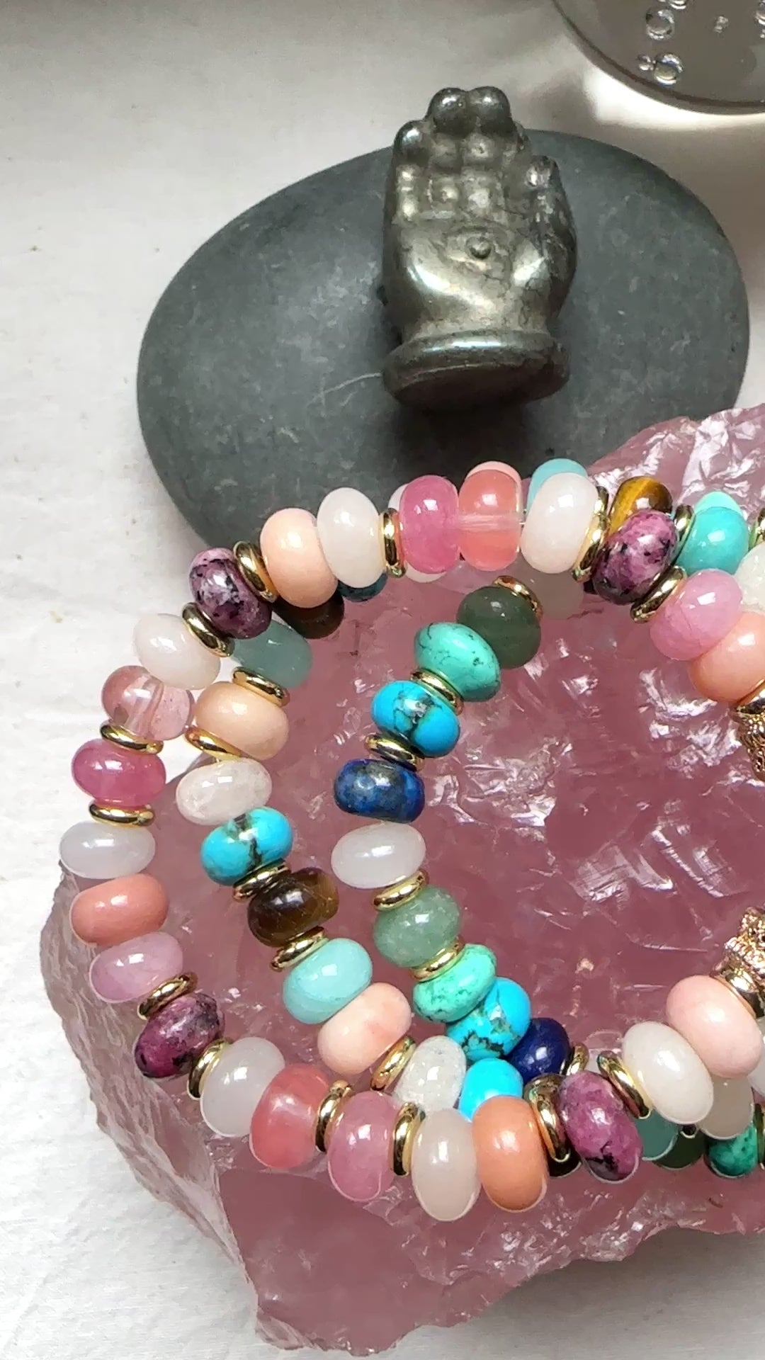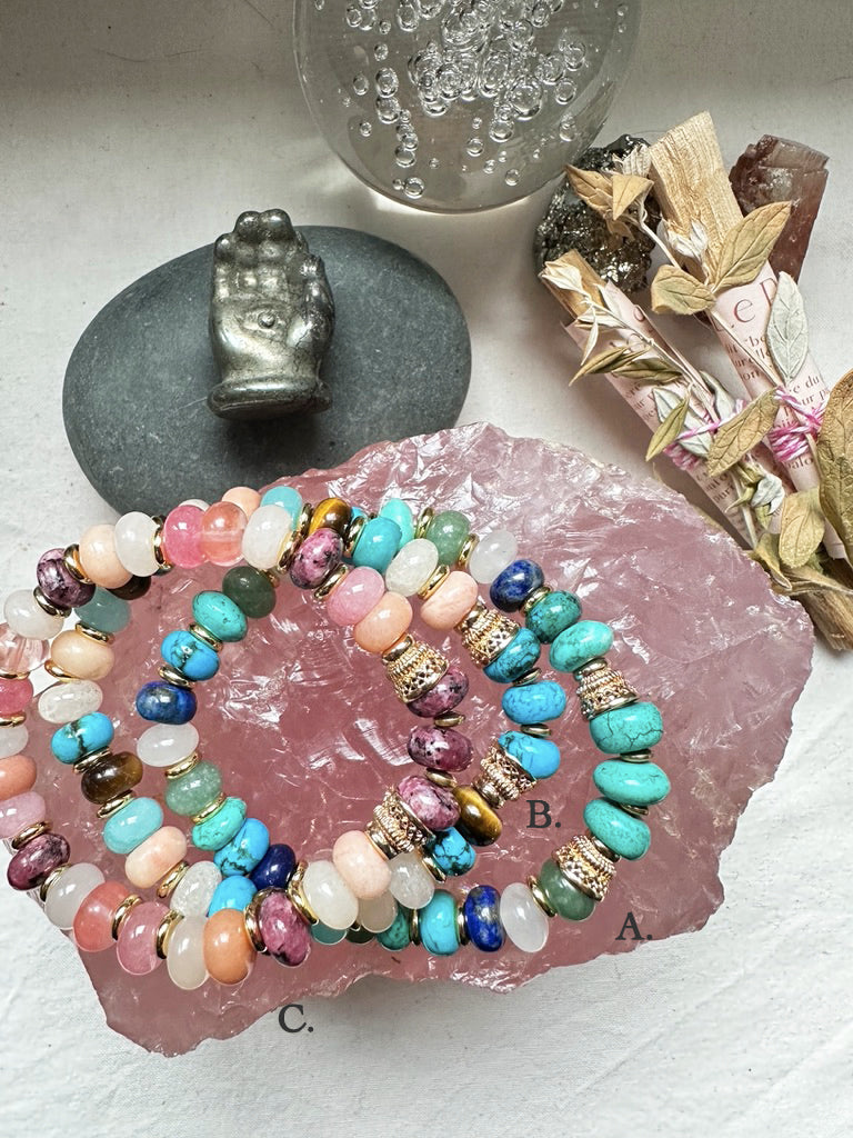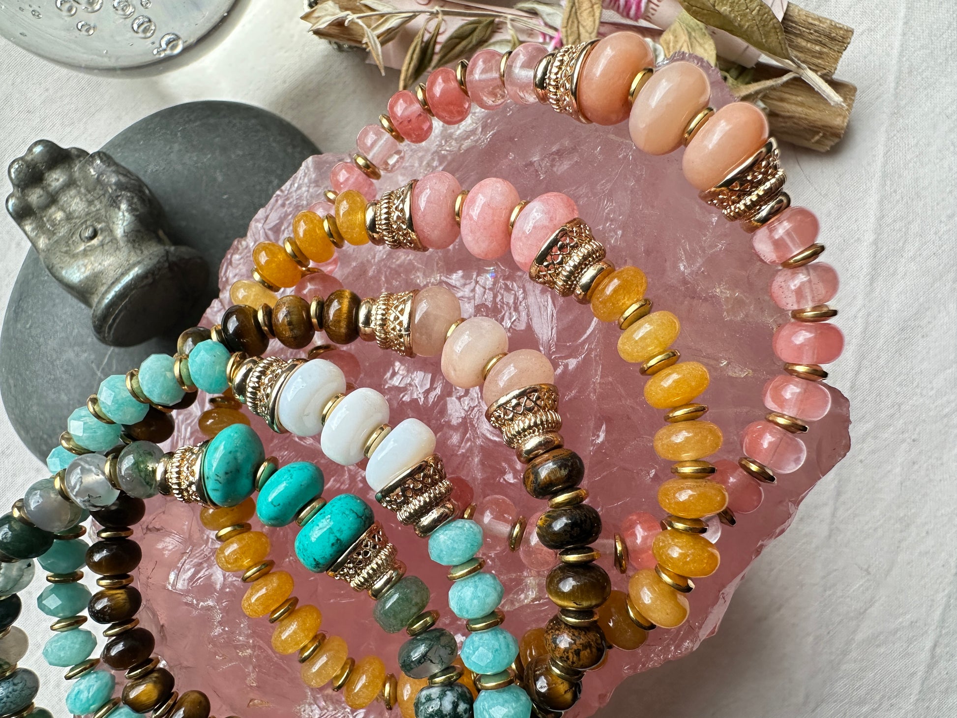 Bracelet B : Perles Aventurine pêche, Quartz blanc, Turquoises, Calcédoines bleue, Oeil de tigre / Turquoises au centre