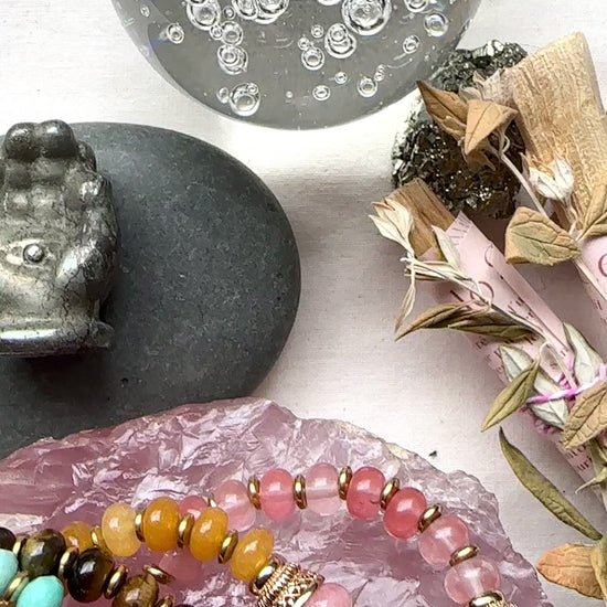 Bracelet 2 : Perles Calcite miel / Quartz rose au centre