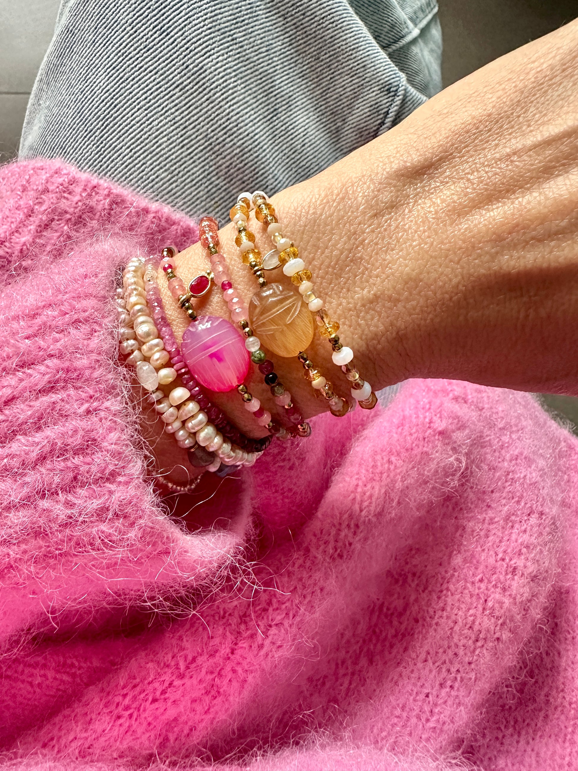 Des bracelets double-tour en mix de perles fines et de quelques perles de verre pour des bracelets lumineux et colorés à porter au quotidien. Chaque bracelet s'accompagne aussi d'une pierre fine sertie en forme de poire, d'œil ou de petite goutte.