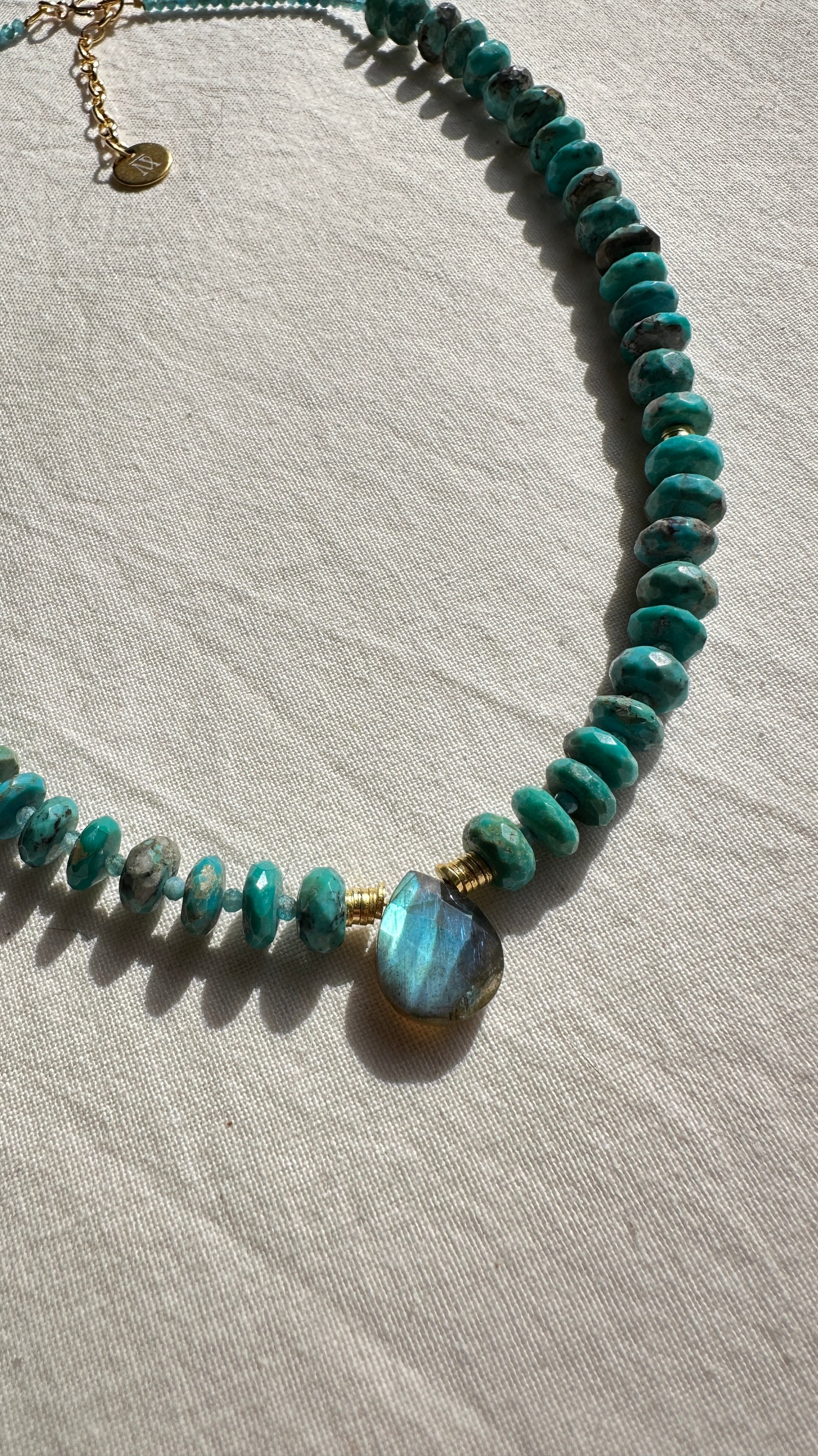 Toute la beauté des turquoises naturelles taillées main accompagnées d'une goutte en labradorite pleine de feu et de minuscules apatites bleues pour apporter protection, équilibre et confiance.