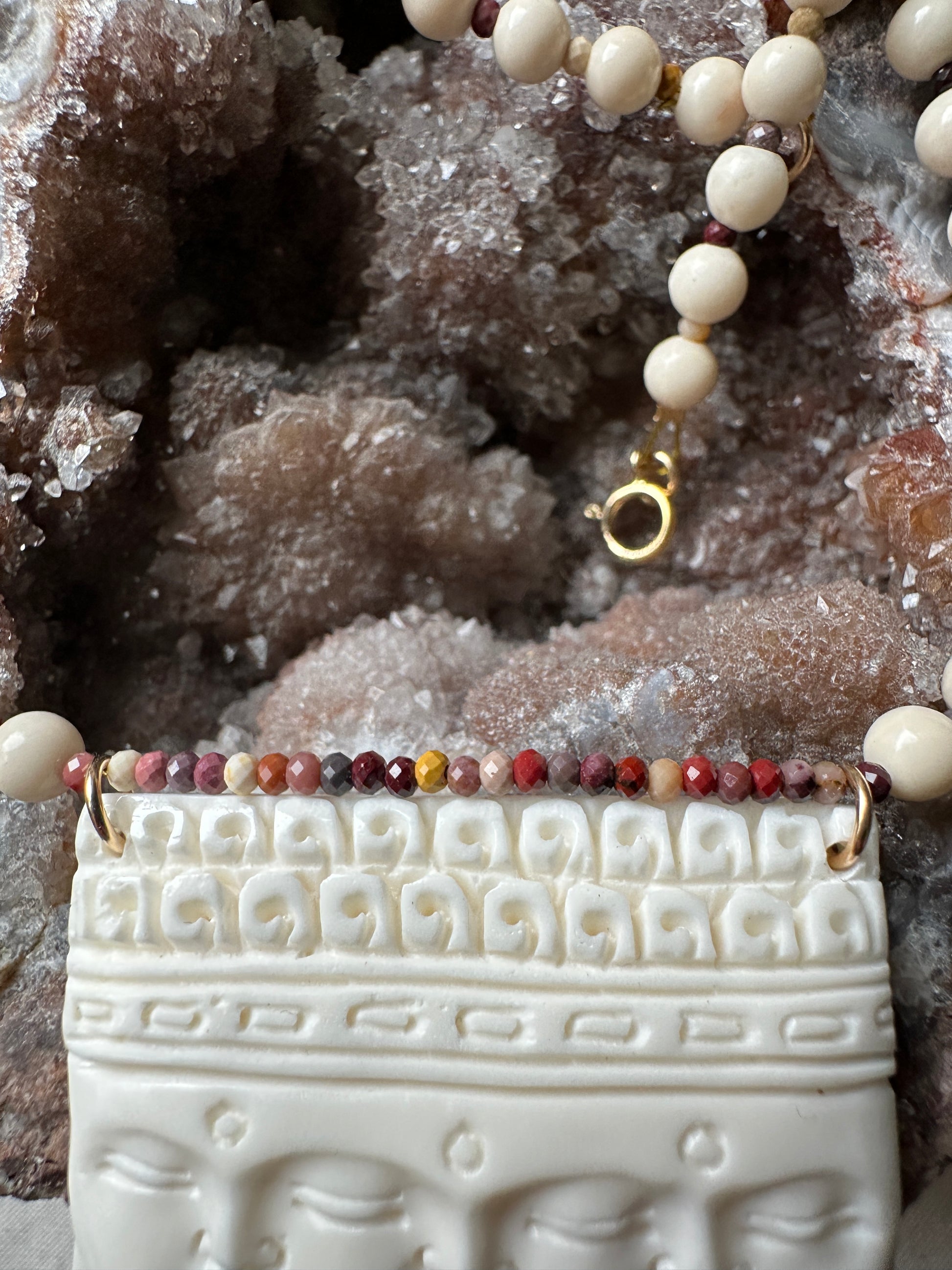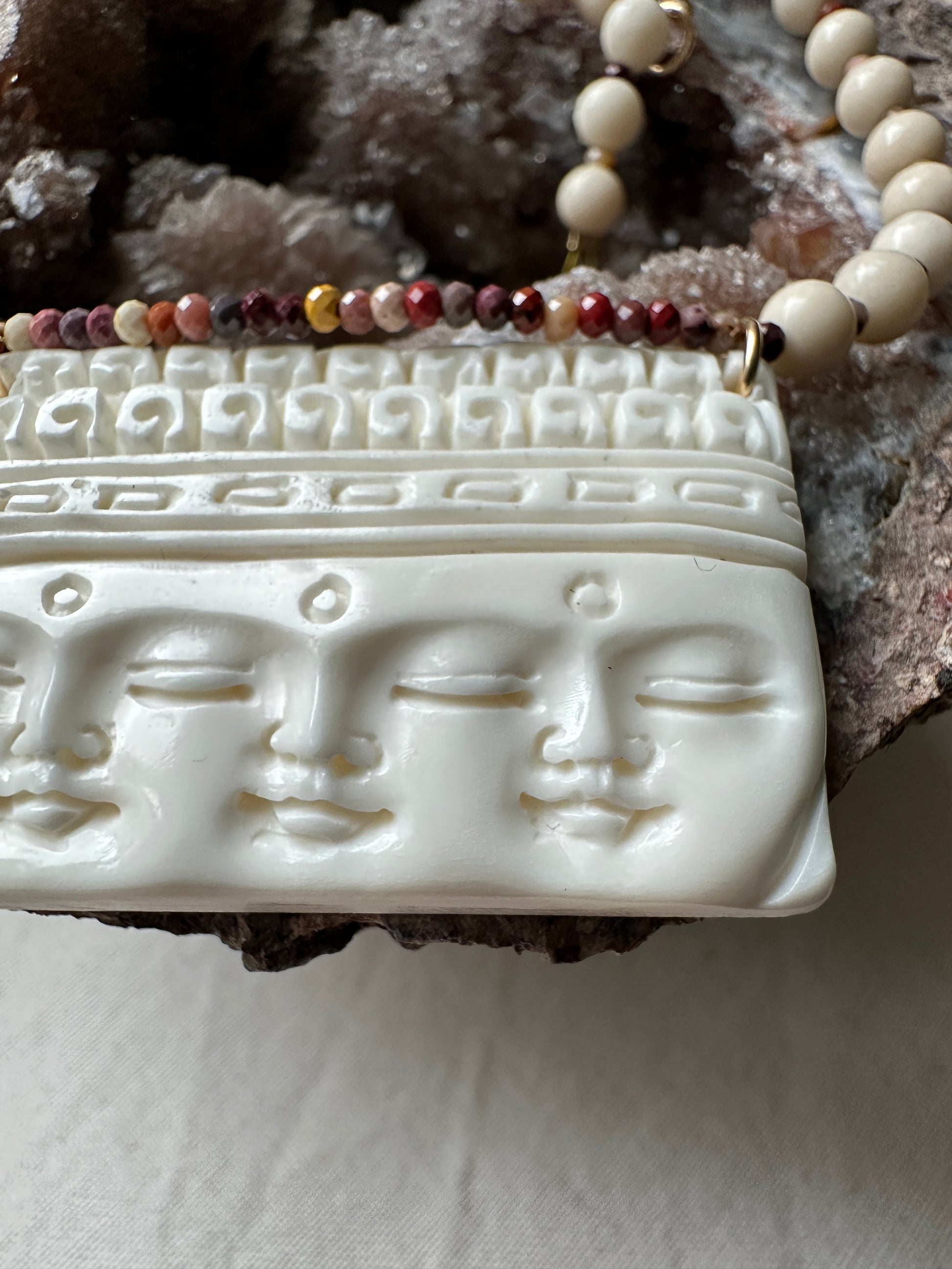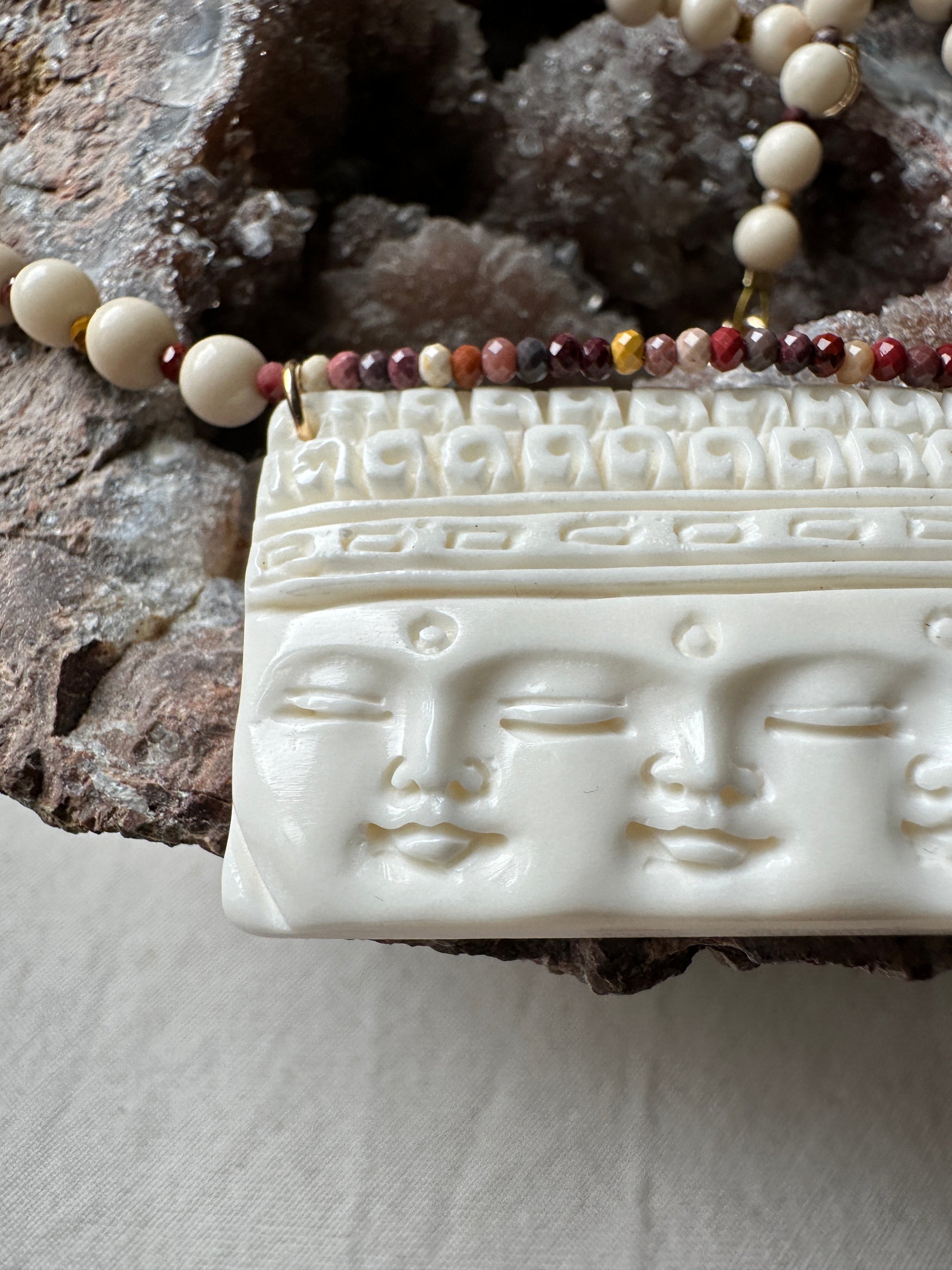 Le collier le plus zen que j'ai jamais crée. La pièce principale a été gravée dans de l'os de buffle par un artisan Balinais aux mains d'or. Elle représente 3 visages de bouddhas méditant avec le point Ajna ( 3ème oeil) gravé entre les 2 yeux.