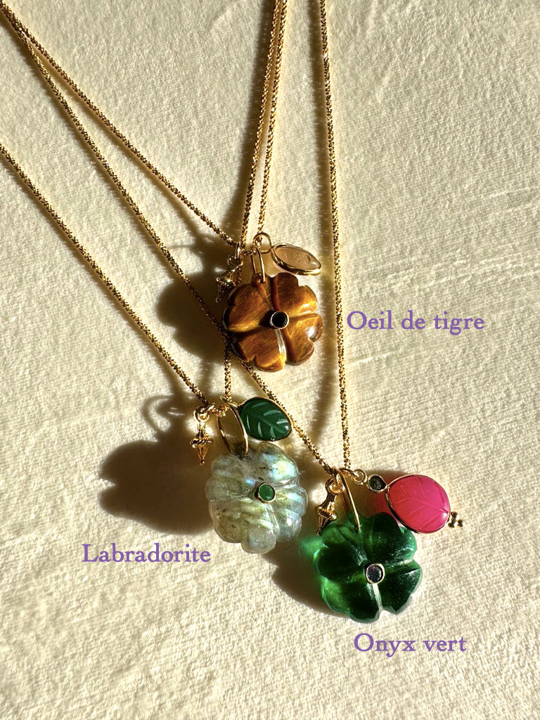 Tout étant fait sur mesure, vous pouvez choisir la pierre du Trèfle (labradorite, oeil de tigre ou onyx vert), des petites feuilles (onyx vert, sunstone, oeil de tigre) et des grandes feuilles ( améthyste, agate rose, calcédoine verte).