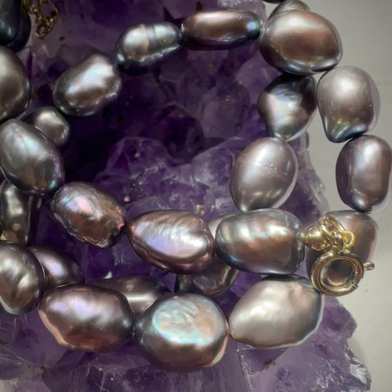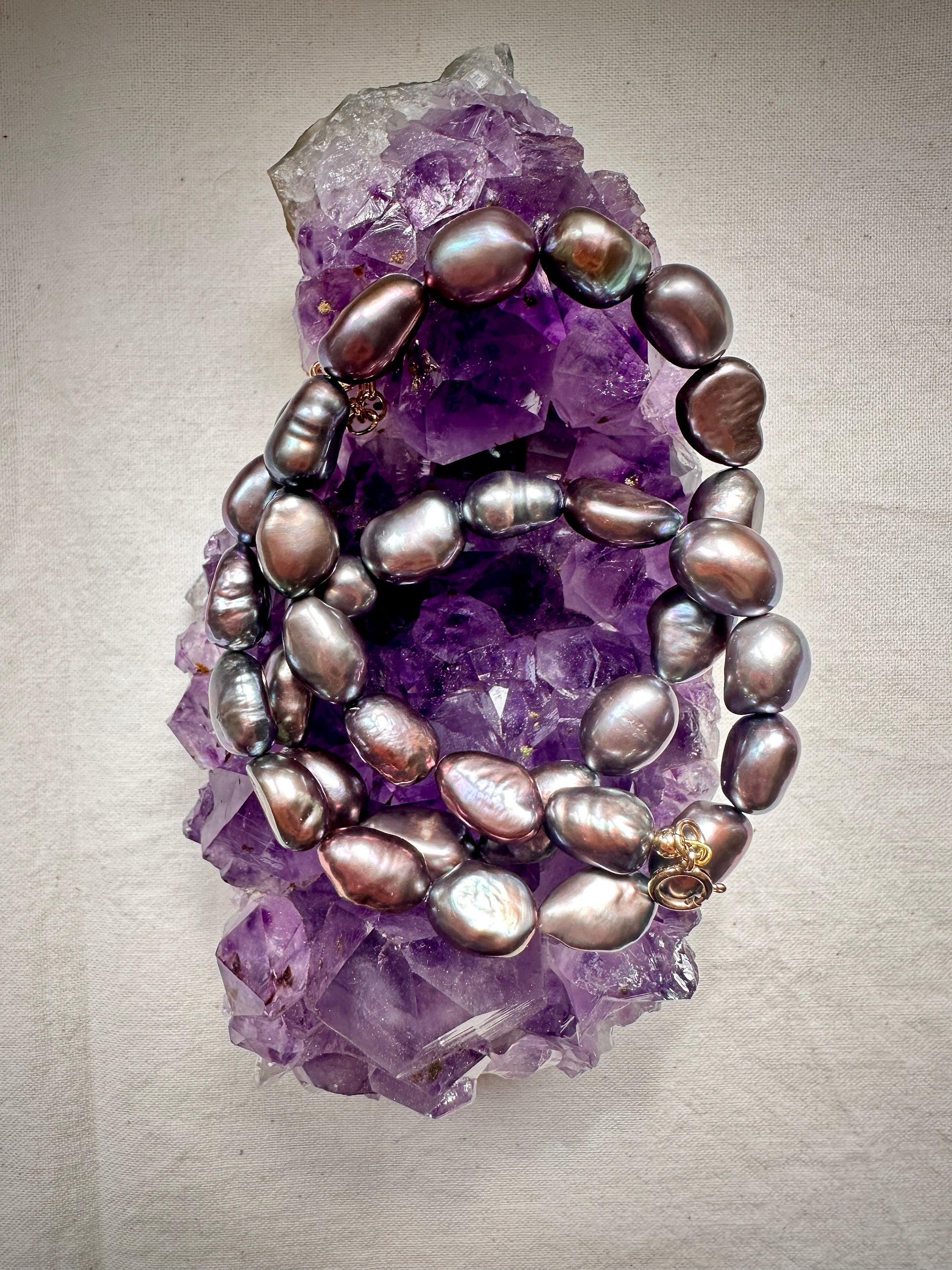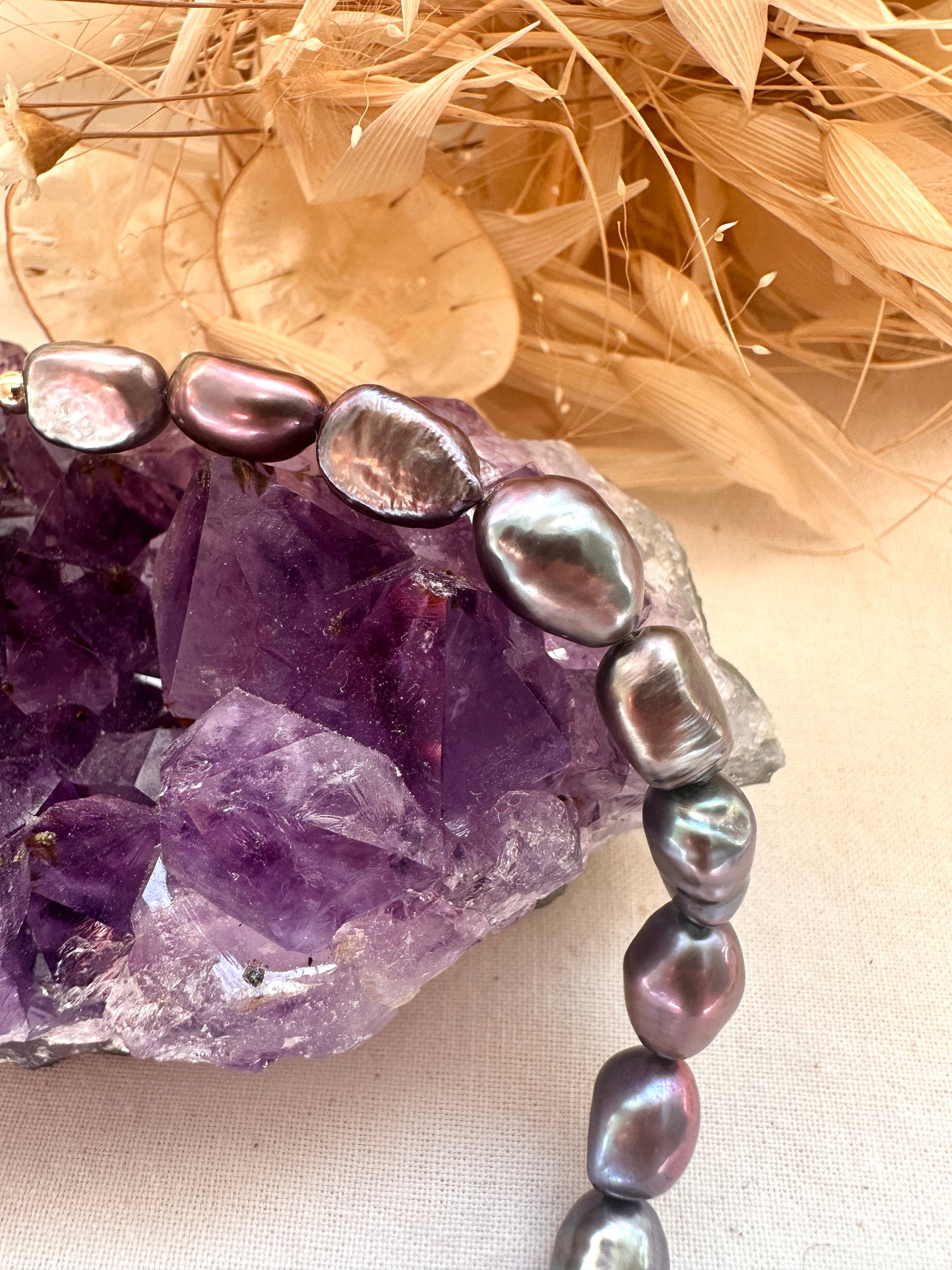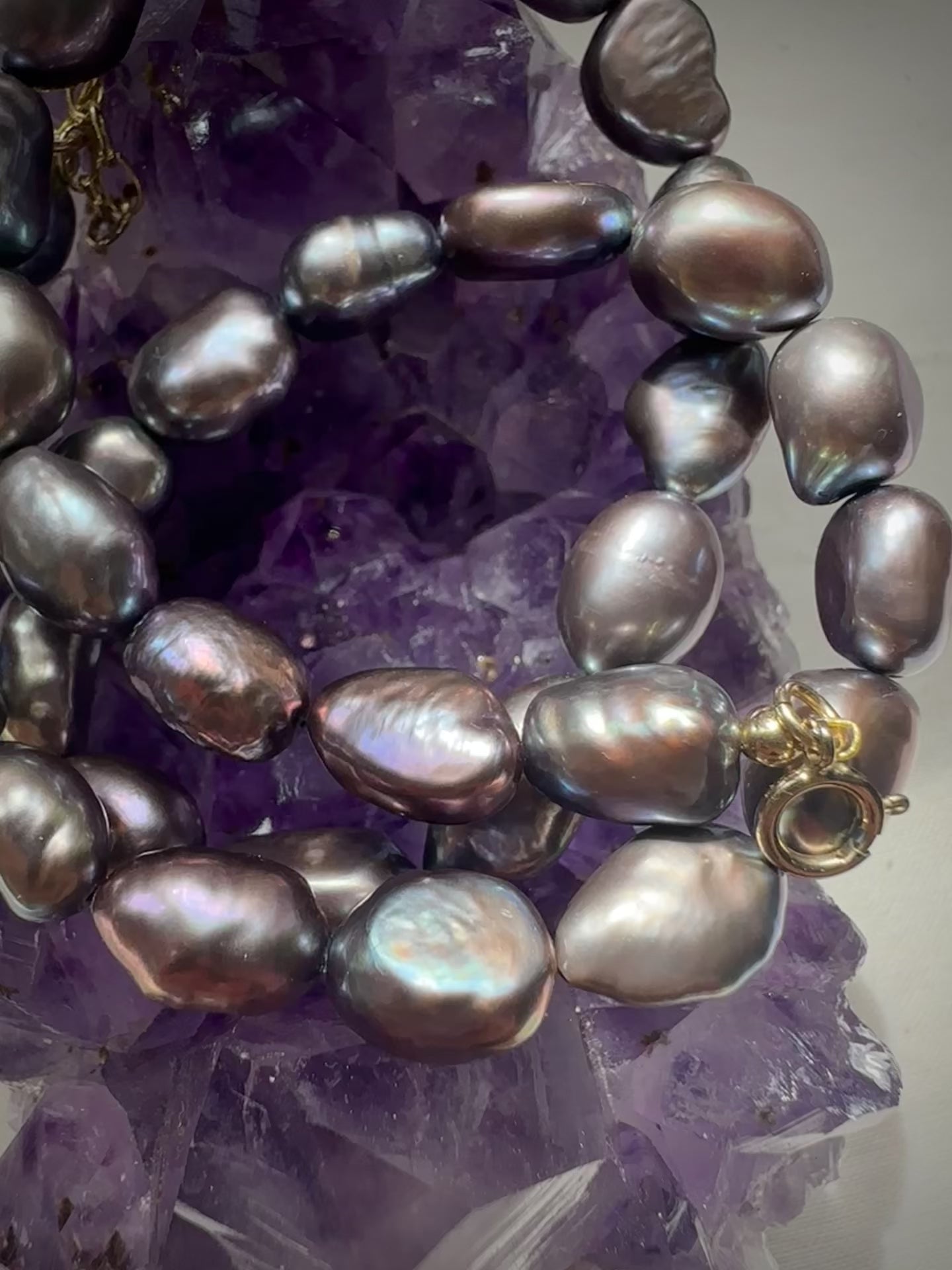 Toute la beauté irisée de magnifiques perles grises aux reflets violines et mordorés incroyables, les colliers Anora se déclinent en 2 versions :