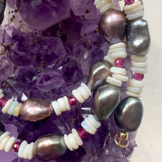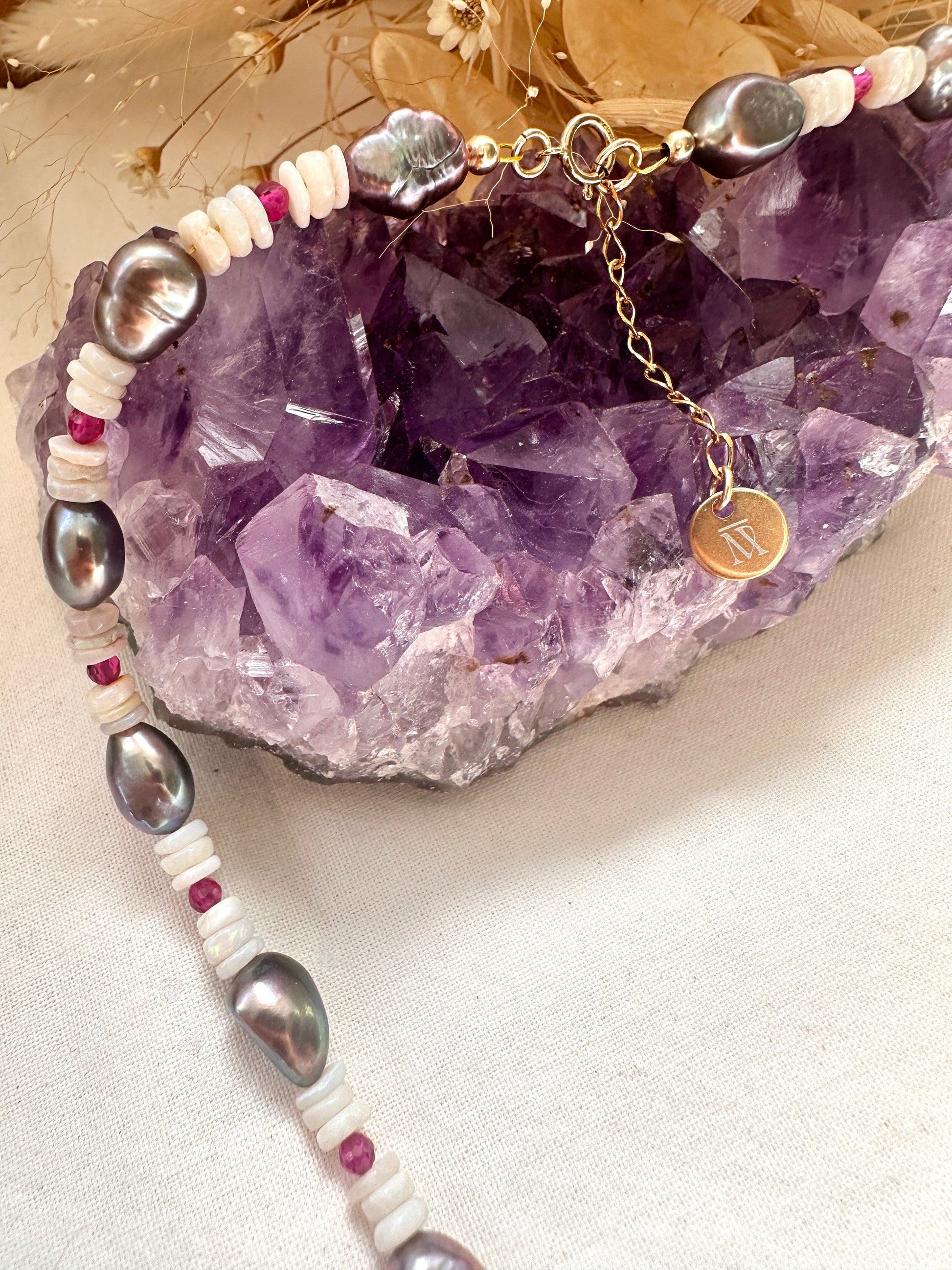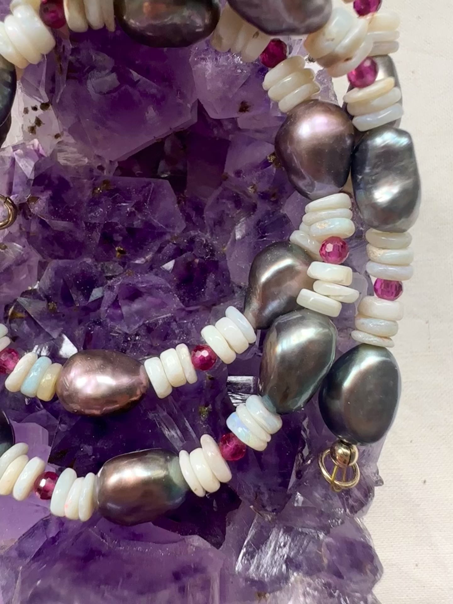 *perles grises, opales blanches et rubellites fushia .L44cm +3cm de chaine réglable