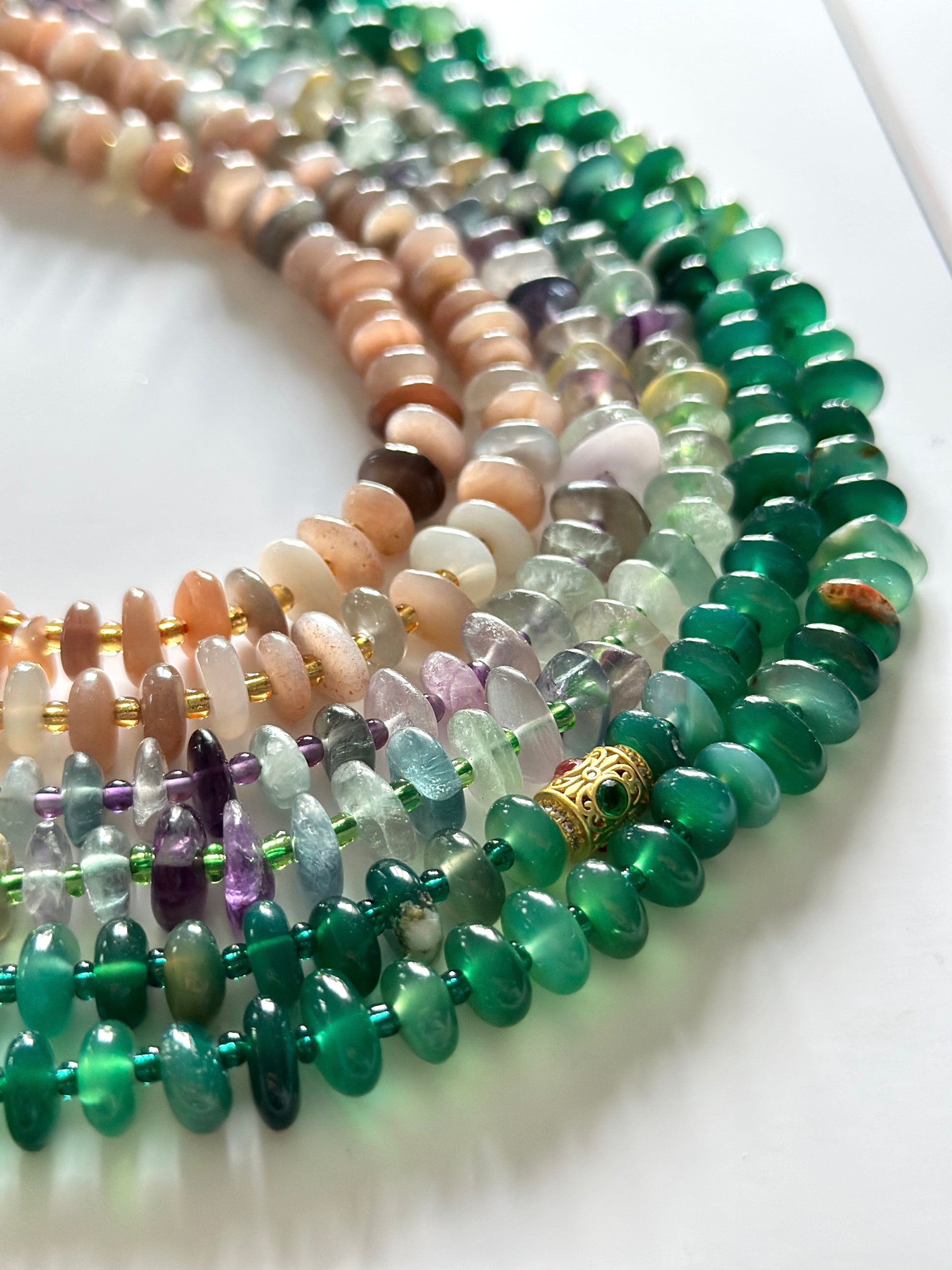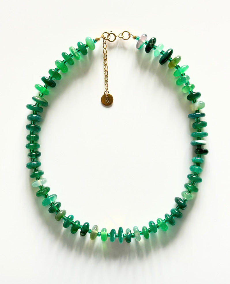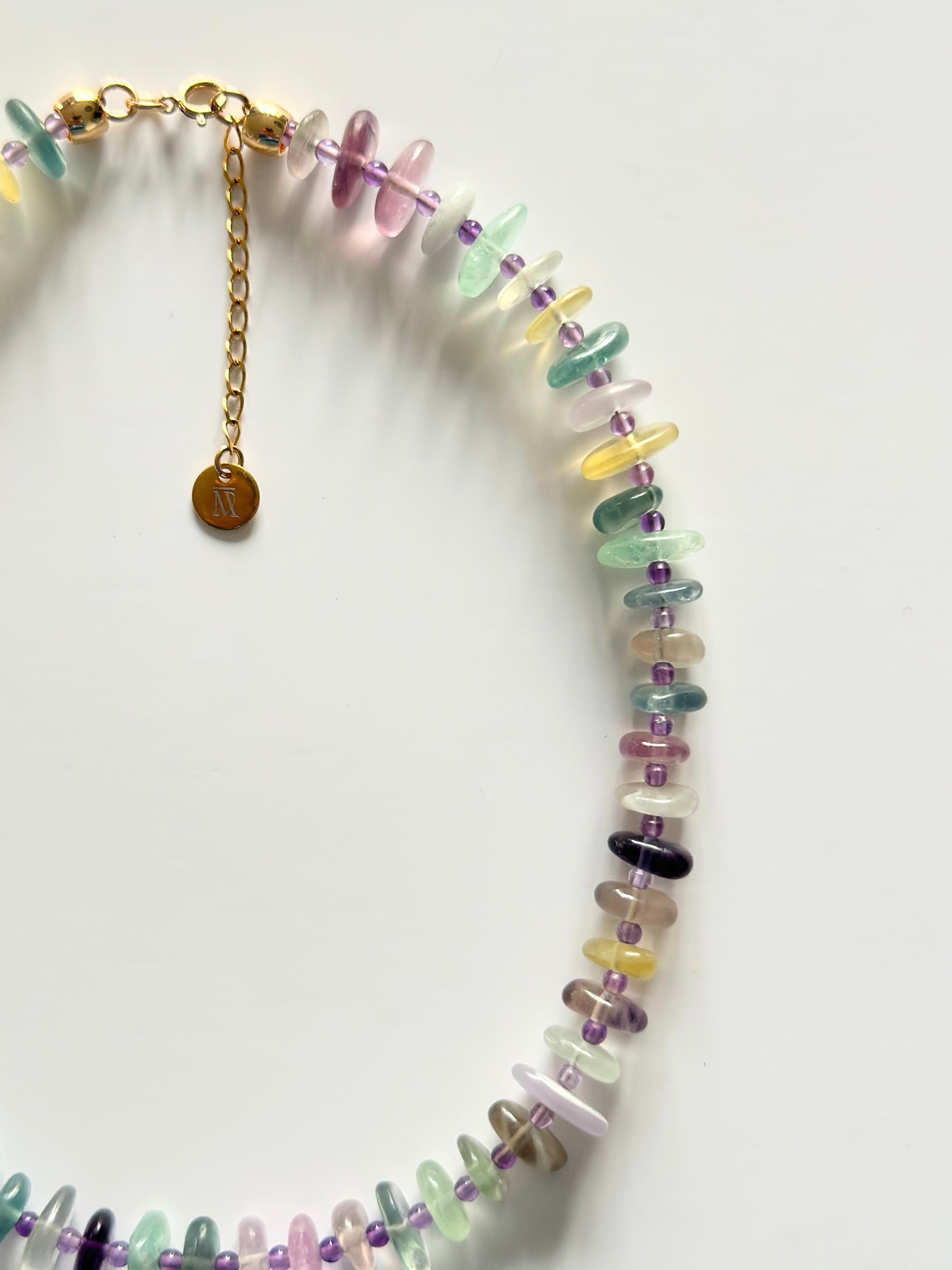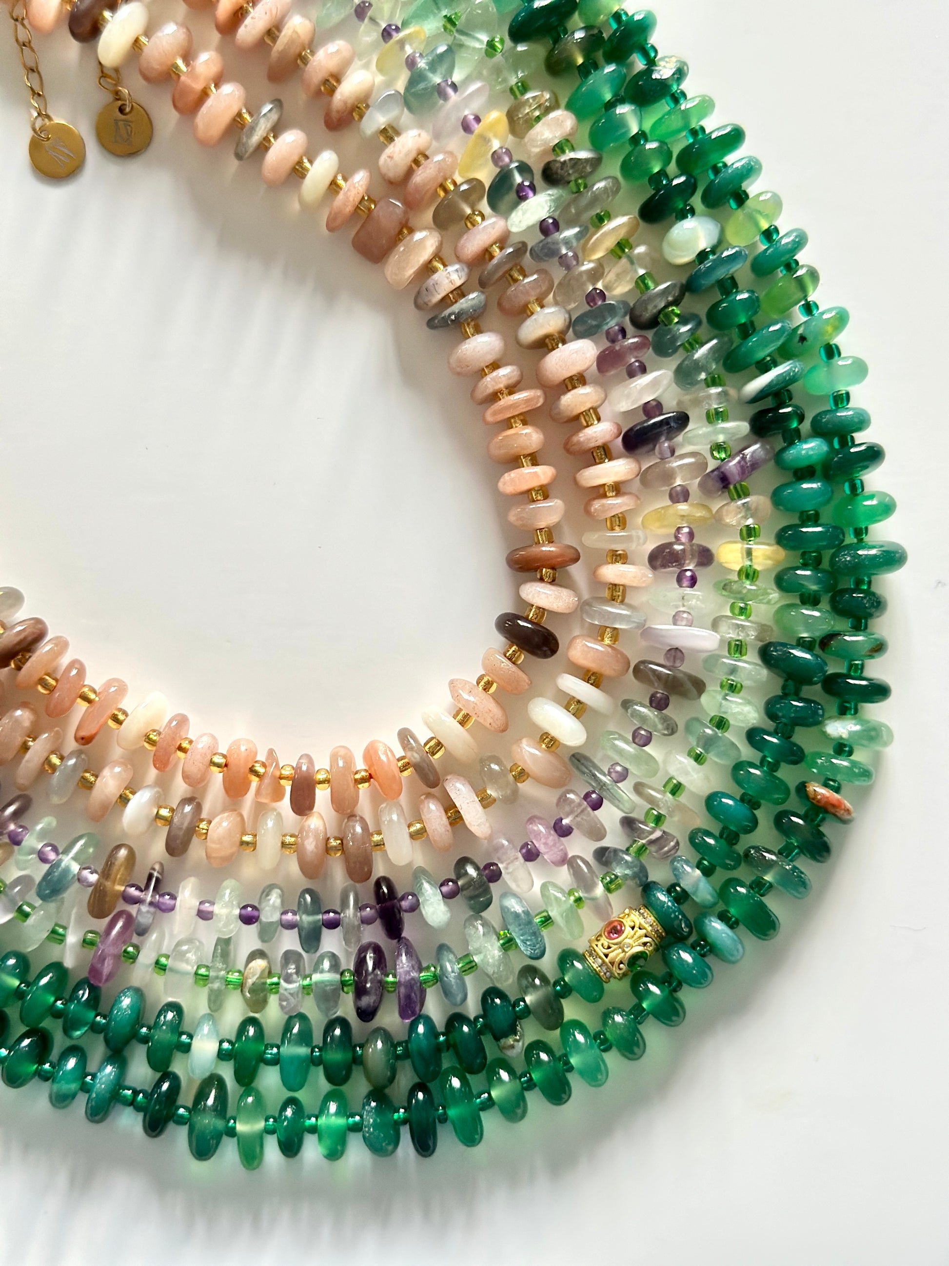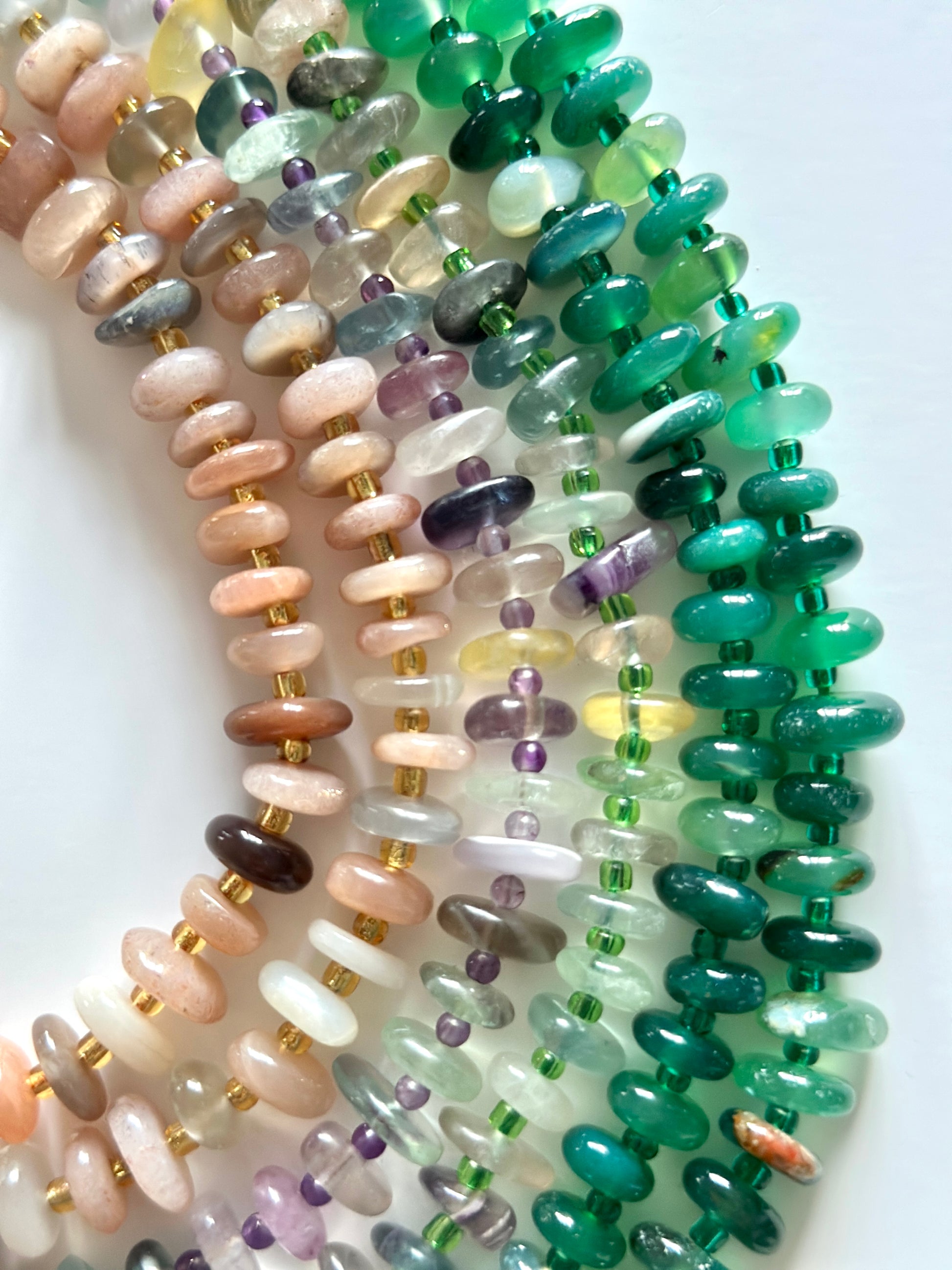 Des colliers aux perles soucoupes semblables aux anneaux de Saturne , déclinés en 3 pierres naturelles : •Onyx vert, •Fluorite entre violet, jaune et vert pâle ou •Pierre de soleil aux nuances oranges et blanches.