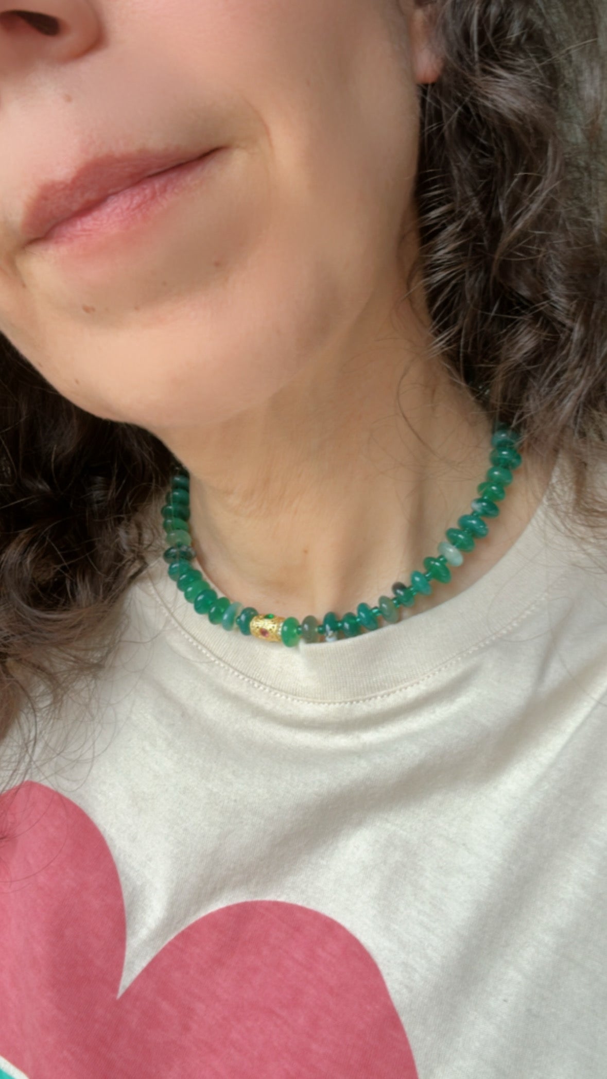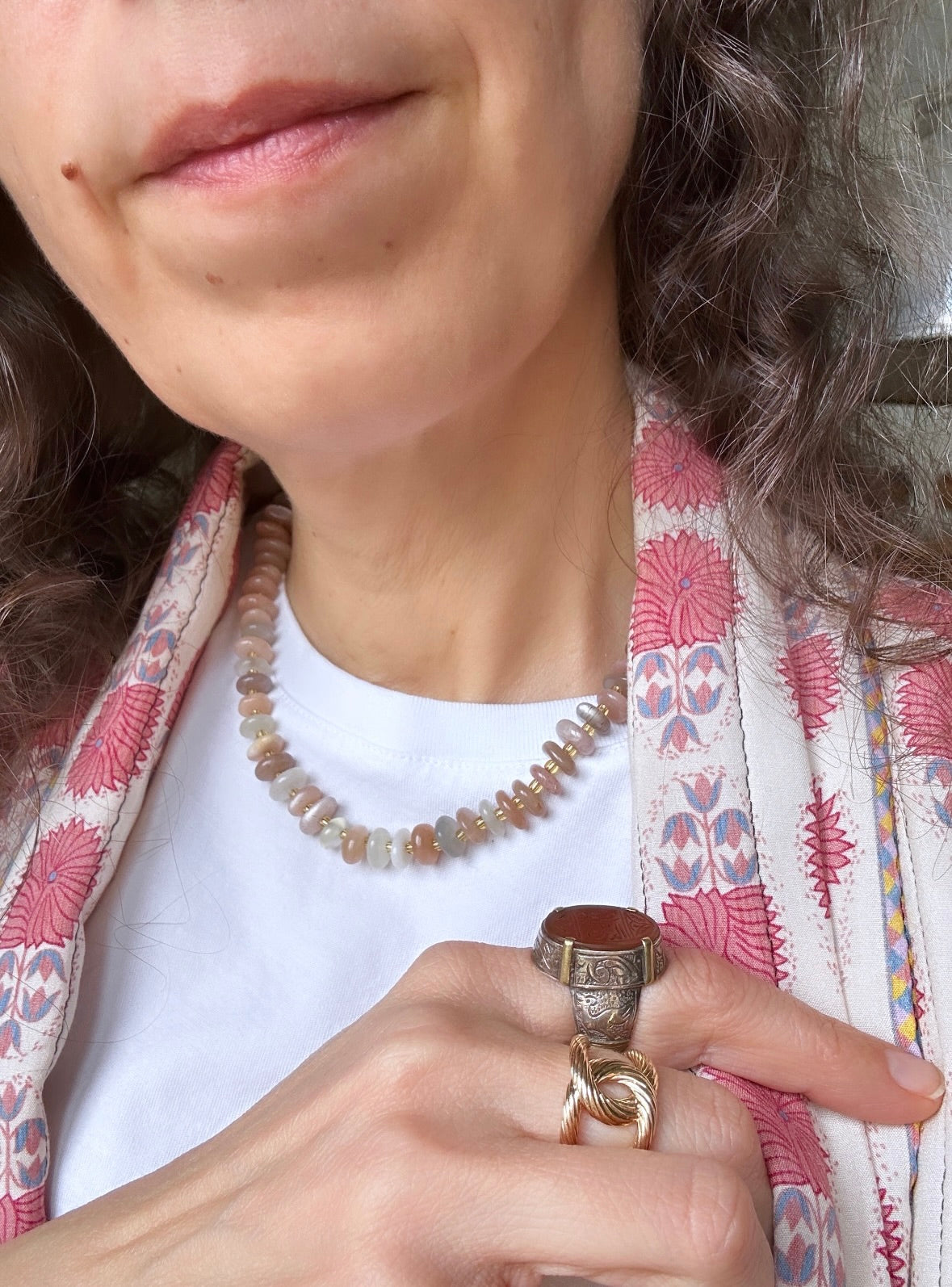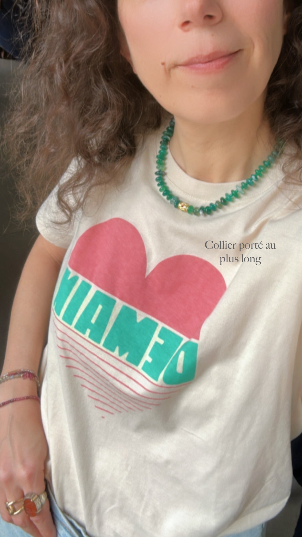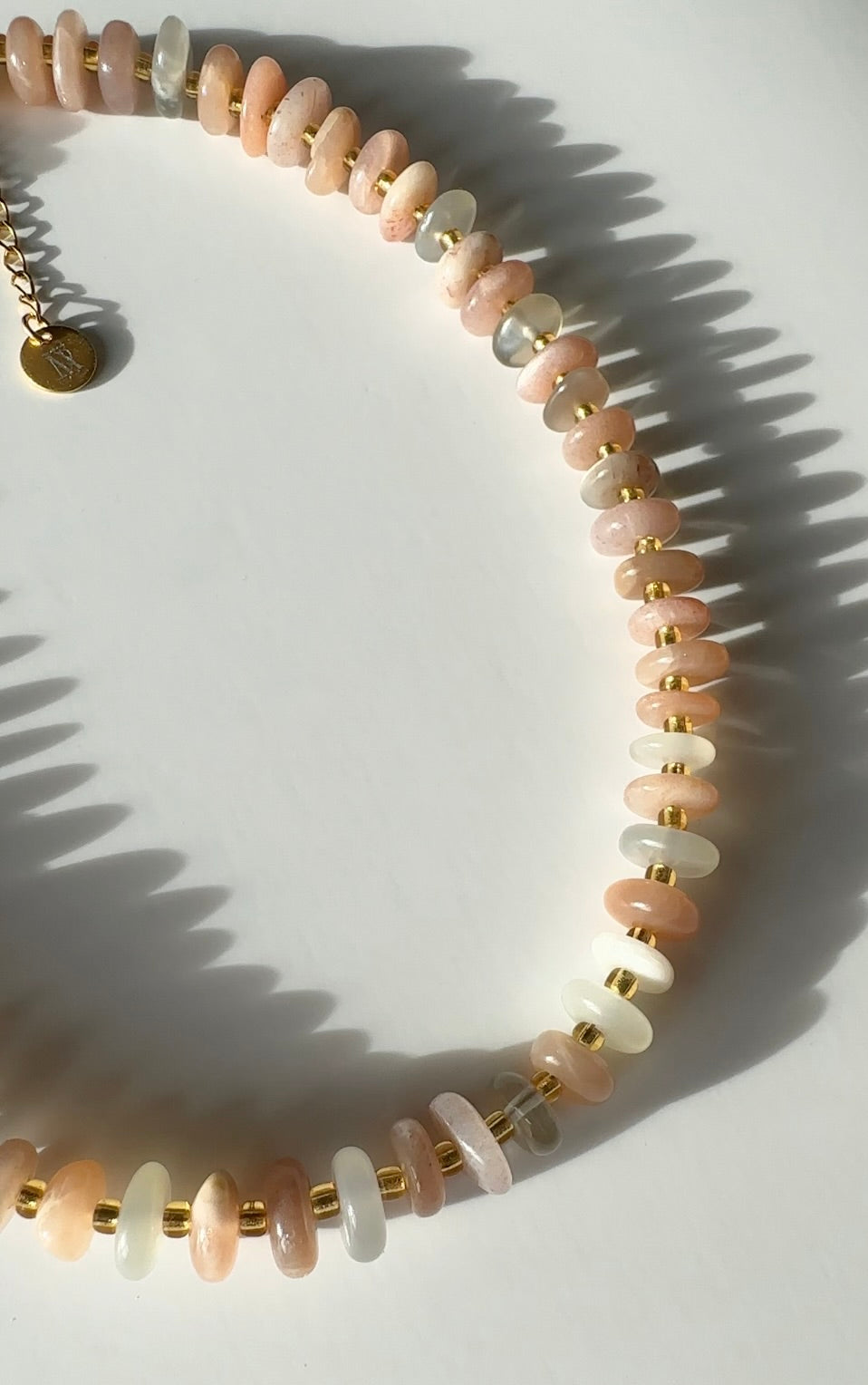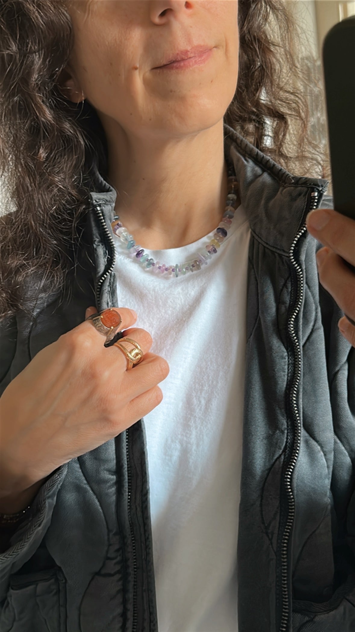 Des colliers aux perles soucoupes semblables aux anneaux de Saturne , déclinés en 3 pierres naturelles : •Onyx vert, •Fluorite entre violet, jaune et vert pâle ou •Pierre de soleil aux nuances oranges et blanches.
