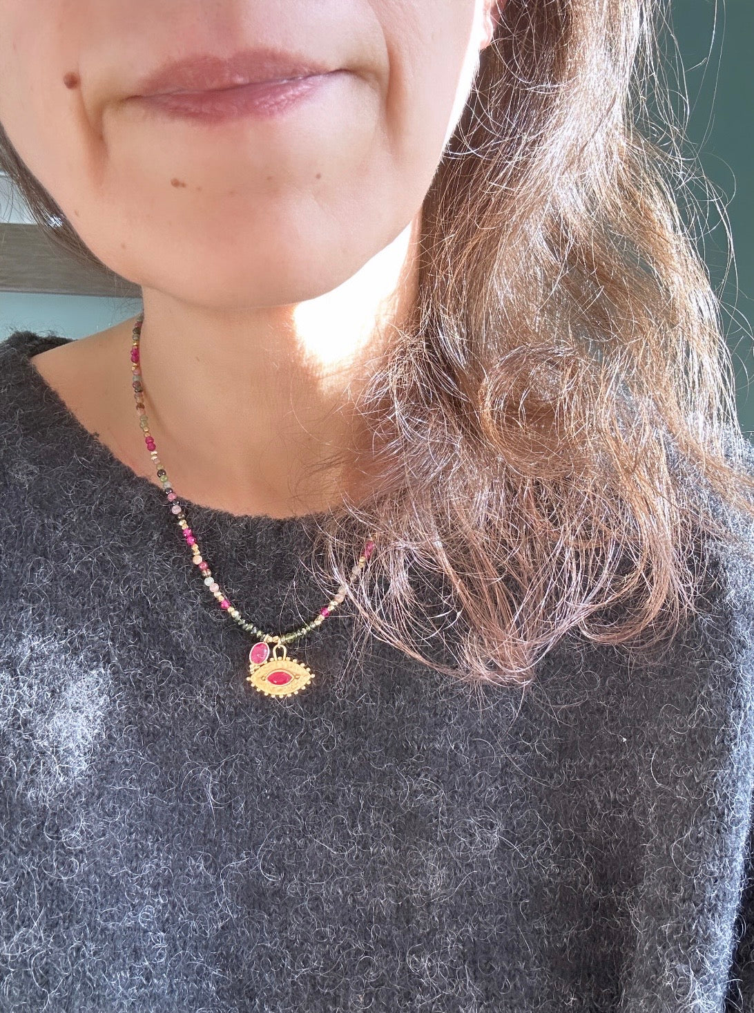 Collier 1 : pendentif Oeil avec rubis au milieu et motif ovale en rubis à côté. Perles tourmalines rondes multicolores 3mm, tourmalines vertes au centre, perles hématites dorées, perles rubellites rose vif. Longueur : 42,5cm +3 cm de chaine réglable.