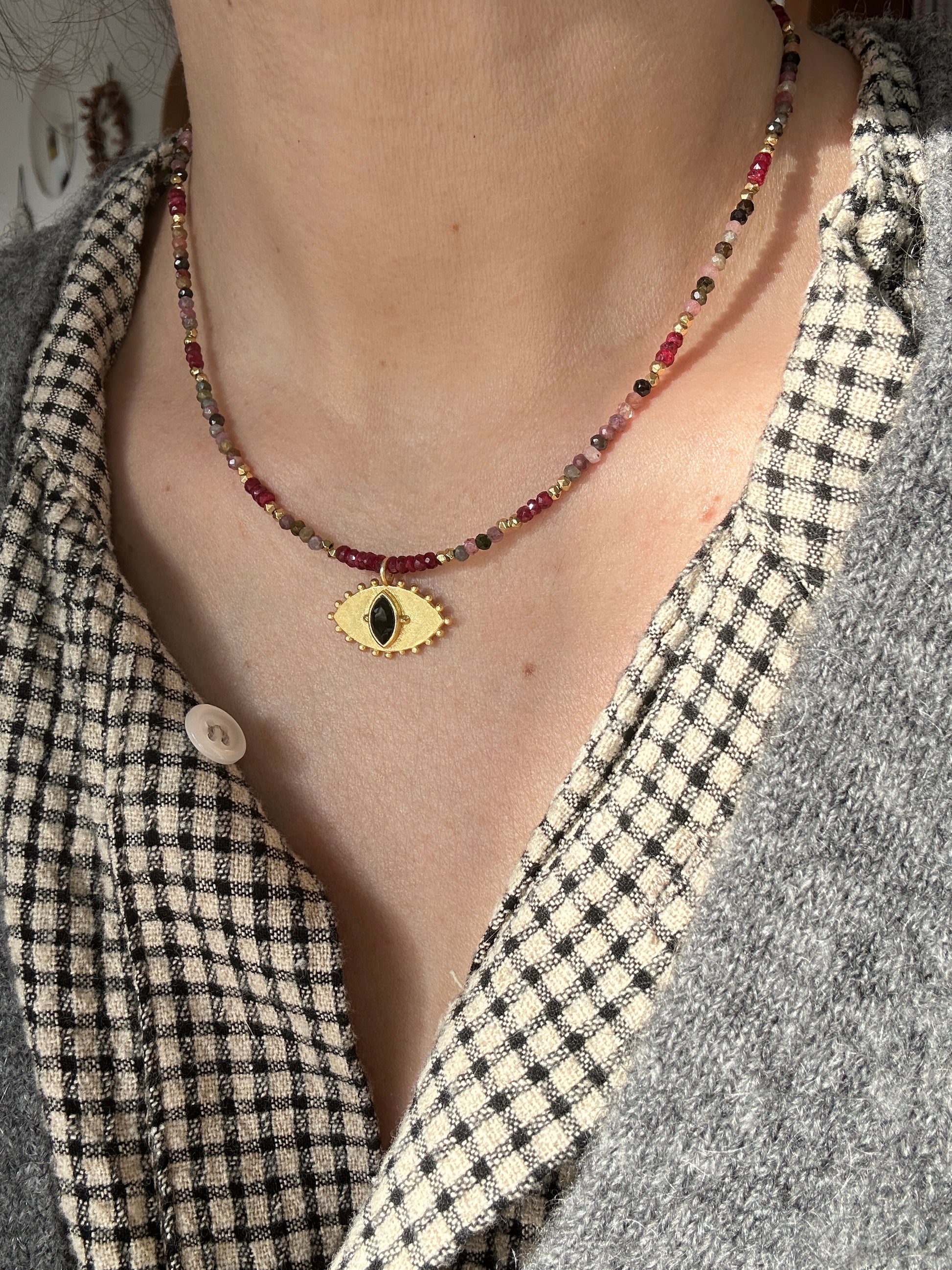 Collier 4 : pendentif Oeil avec agate noire au centre. Perles rubis en central. Perles tourmalines facetées multicolores 3mm, perles hématites dorées, perles rubellites rose vif. Longueur : 40,5 cm +3 cm de chaine réglable.