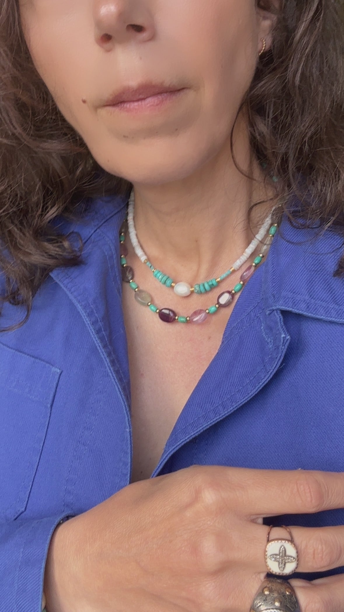 Collier 4 : Perles en fluorite ovales 9x12mm, perles tonneau en turquoise et perles dorées en acier inoxydable.