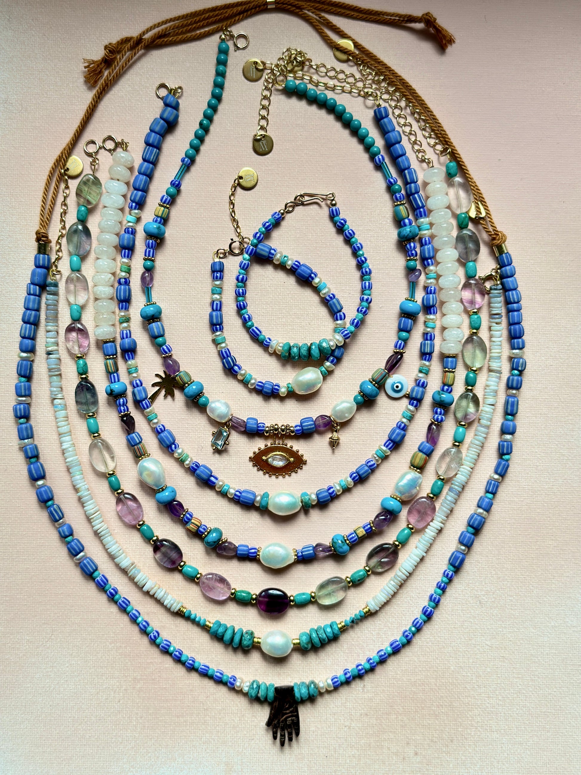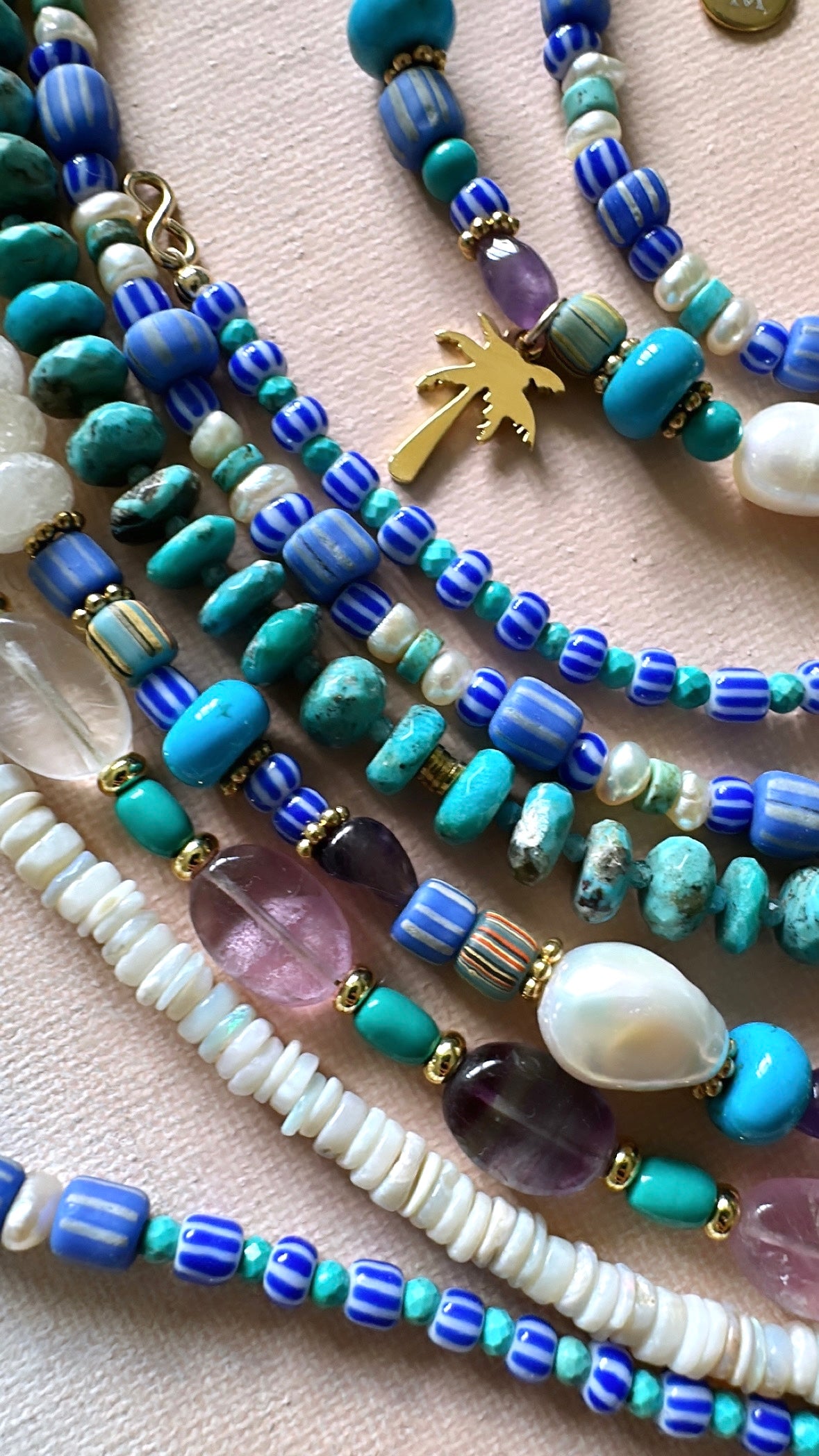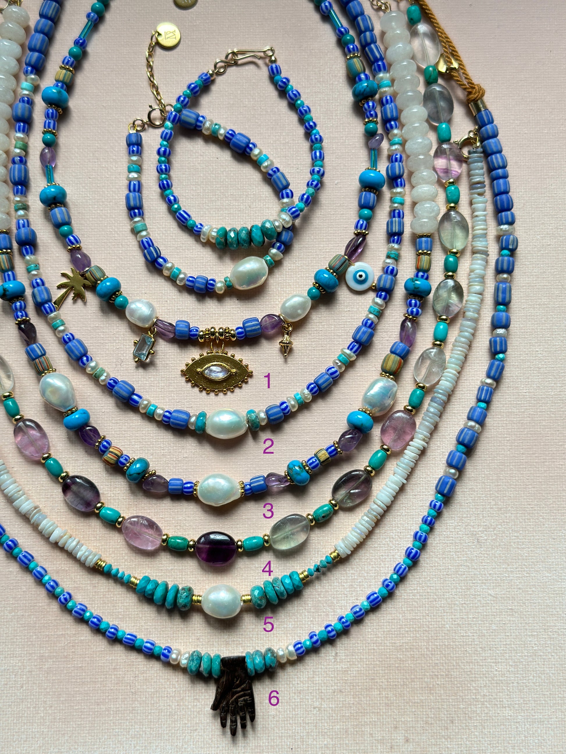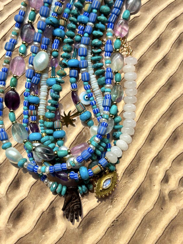 Collier 1 : Perles turquoises rondes et donuts, 2 perles d'eau douce au centre, perles d'eau douce, 2 types de perles rayées bleues et une bleue et jaune, pépites améthystes. 5 pendentifs dont Oeil au centre (moonstone), palmier, Aigue-marine rectangulaire sertie, toupie et oeil Ayin en nacre. Perles fleurs acier inoxydable.