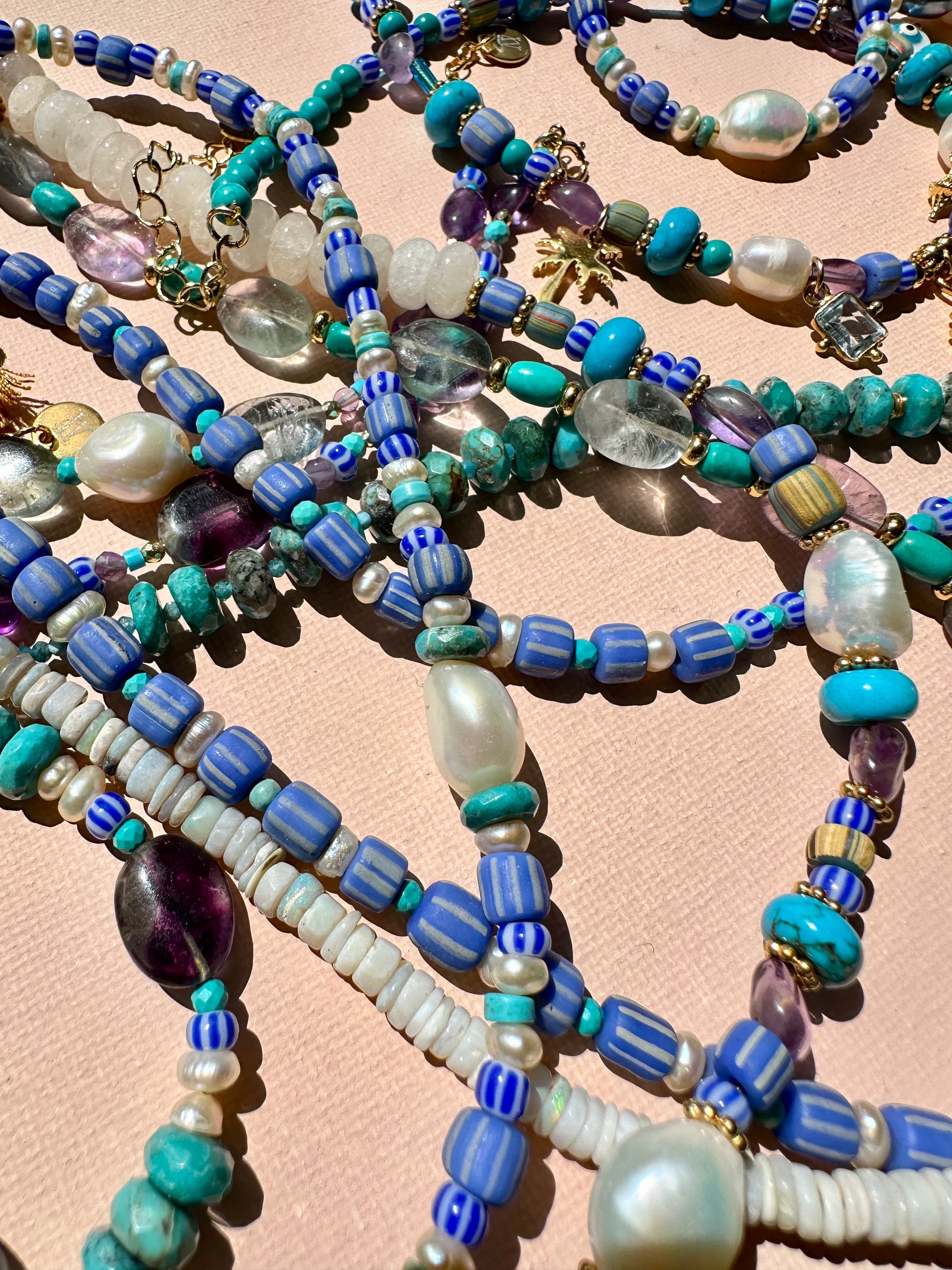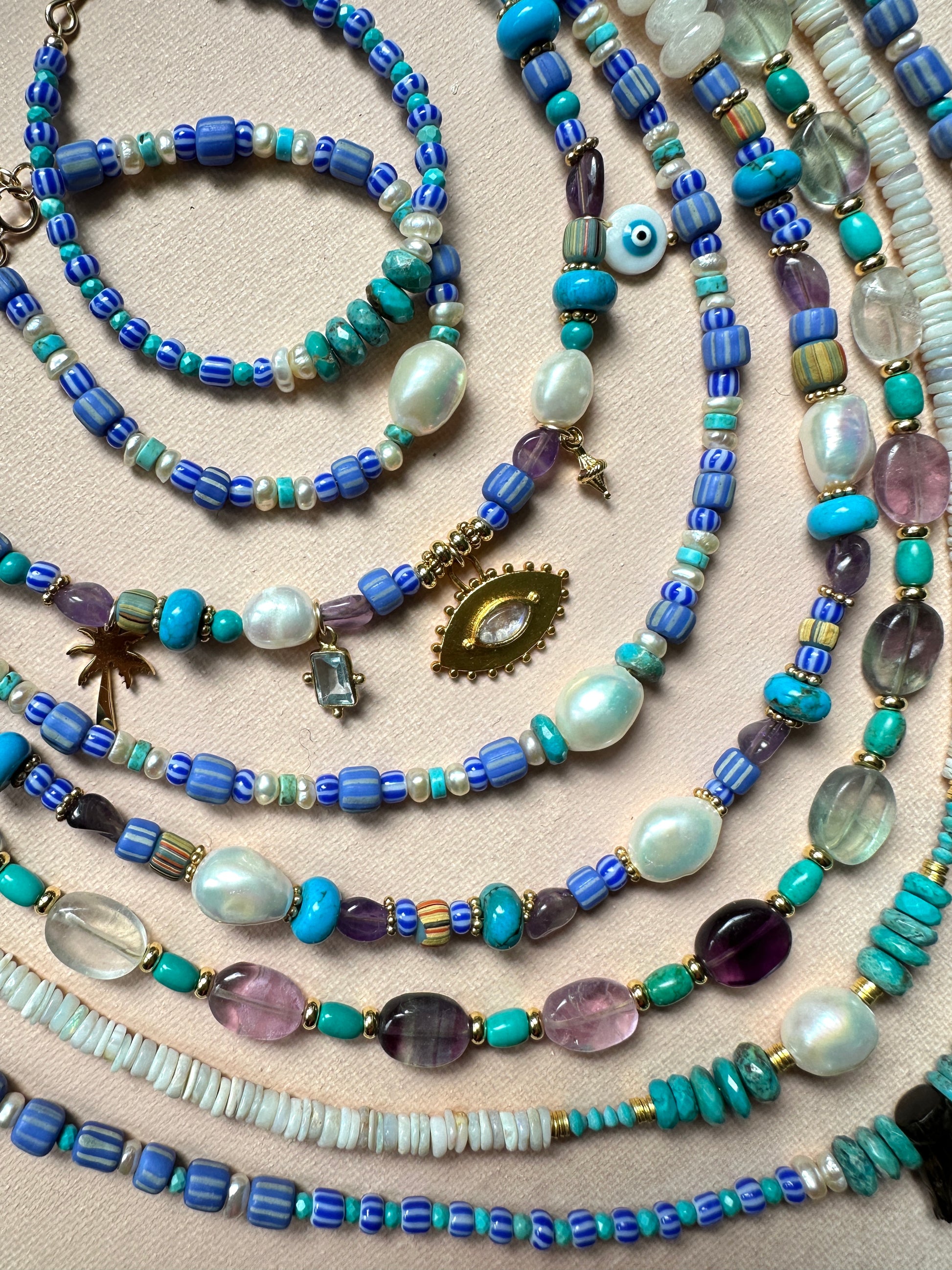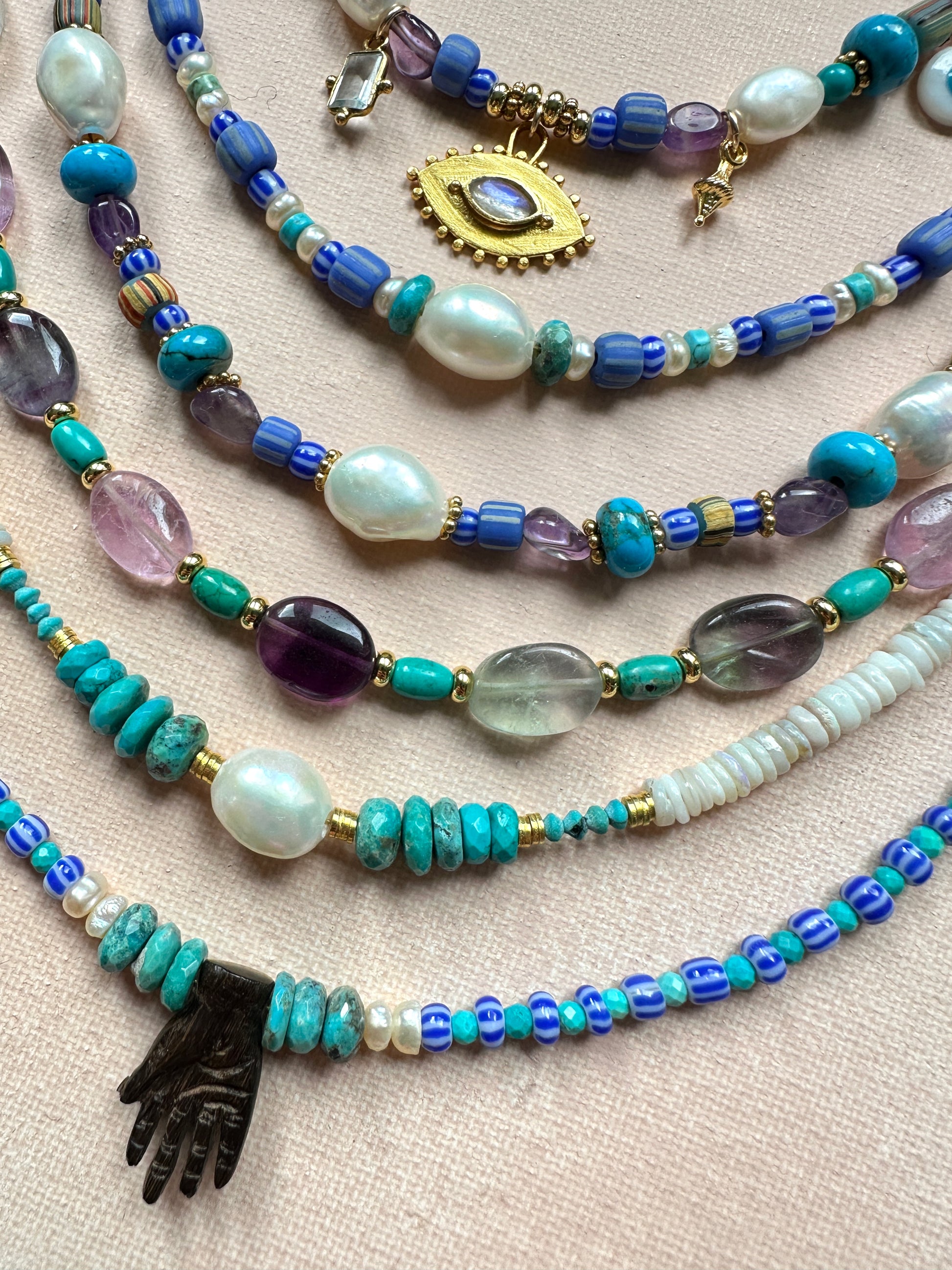 Collier 1 : Perles turquoises rondes et donuts, 2 perles d'eau douce au centre, perles d'eau douce, 2 types de perles rayées bleues et une bleue et jaune, pépites améthystes. 5 pendentifs dont Oeil au centre (moonstone), palmier, Aigue-marine rectangulaire sertie, toupie et oeil Ayin en nacre. Perles fleurs acier inoxydable.