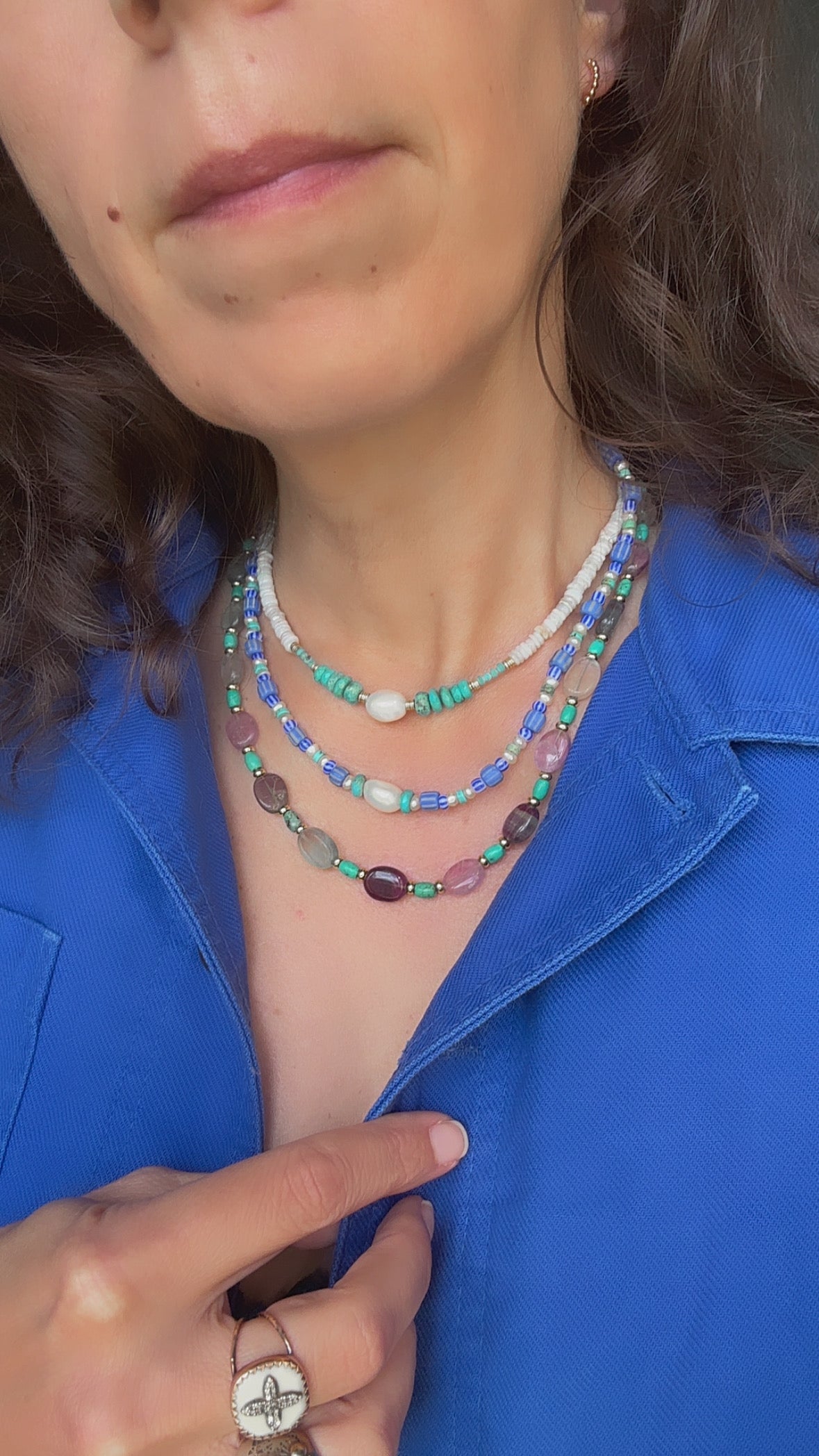 Des colliers aux nuances de bleus et perles marinières parfaits pour porter après la plage et pour les soirs d'été. Grosses perles d'eau douce blanches ou gris foncé ou perles ovales en fluorite viennent compléter la gamme pour rappeler l'élément mer.