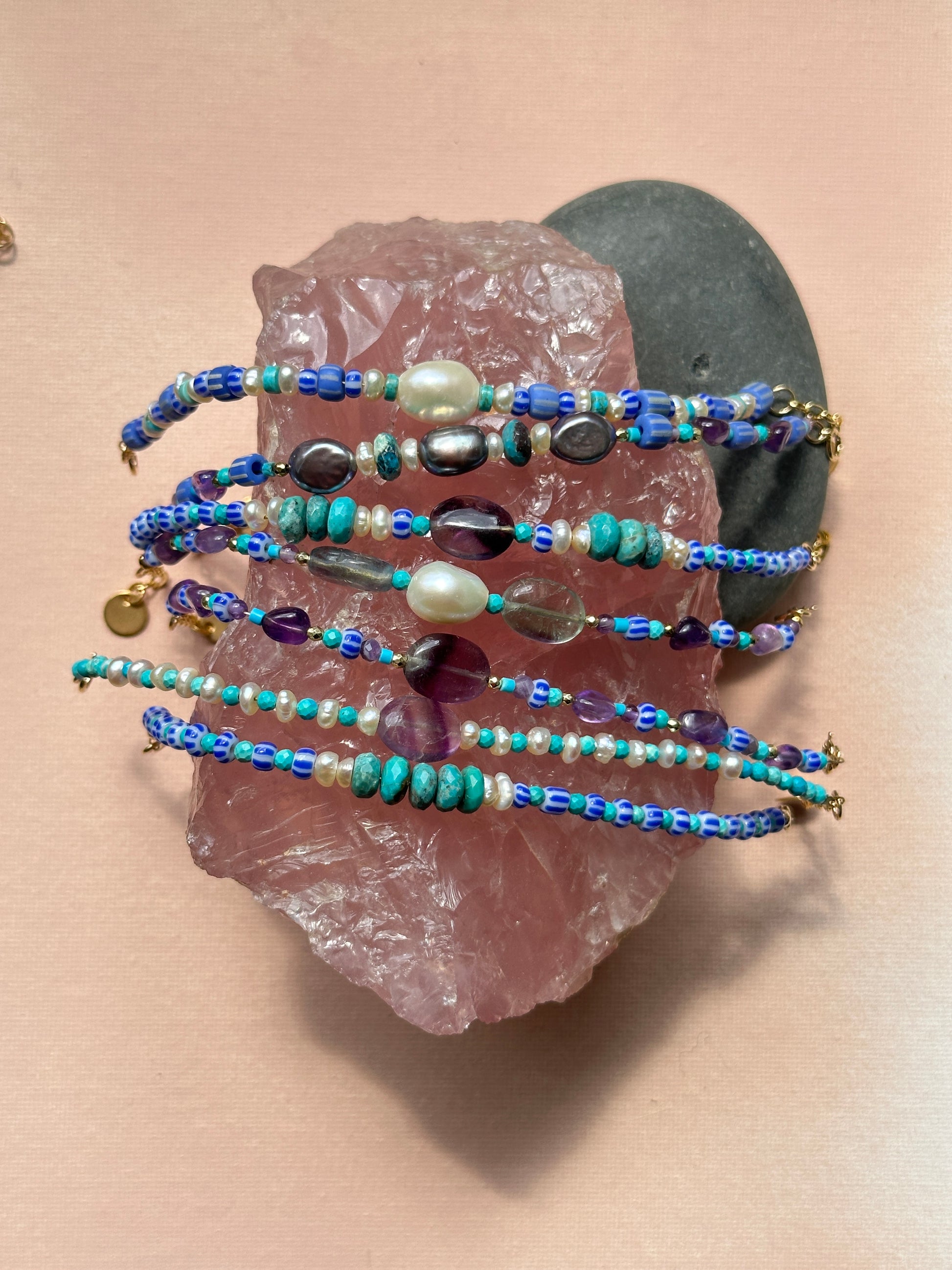 La Turquoise est considérée comme une pierre sacrée. Sa puissante énergie permettrait de protéger son porteur des énergies négatives et de les convertir en énergies positives. Elle réduit le stress et anxiété. La Fluorite est une des rares pierres multicolores à structure rayée, appelée aussi " pierre du 3ème oeil", elle a comme vertu de développer l'intuition et l'éveil spirituel. Elle réorganise les corps physiques, émotionnels et mentaux. Elle structure l'esprit et aide à l'organisation des pensées et à l'ouverture sur les autres. La Perle d'eau douce est liée à l'énergie féminine et maternelle et diffuse une douce énergie de réconfort.
