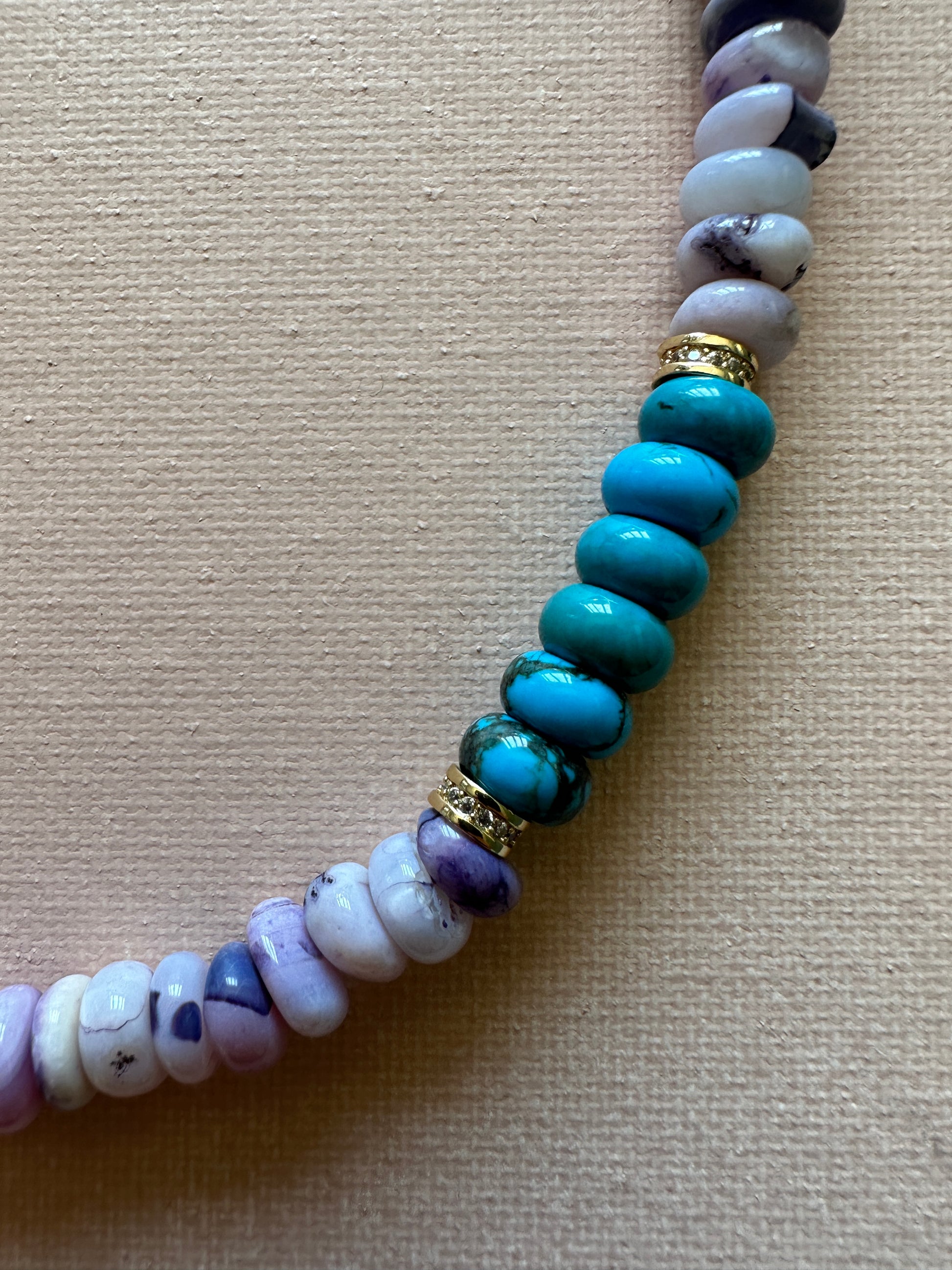 Collier 4 : Opales parmes-roses, Turquoises naturelles et Quartz blanc. 8 Rondelles plaquées or 14 carats strassées cristal. Longueur totale : 44cm