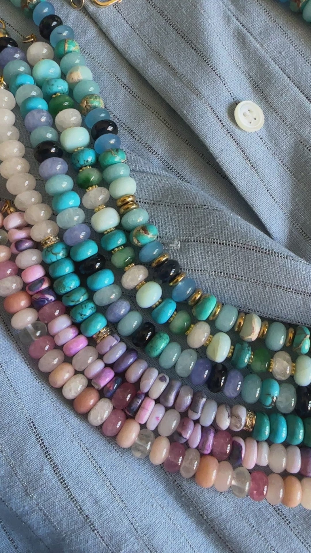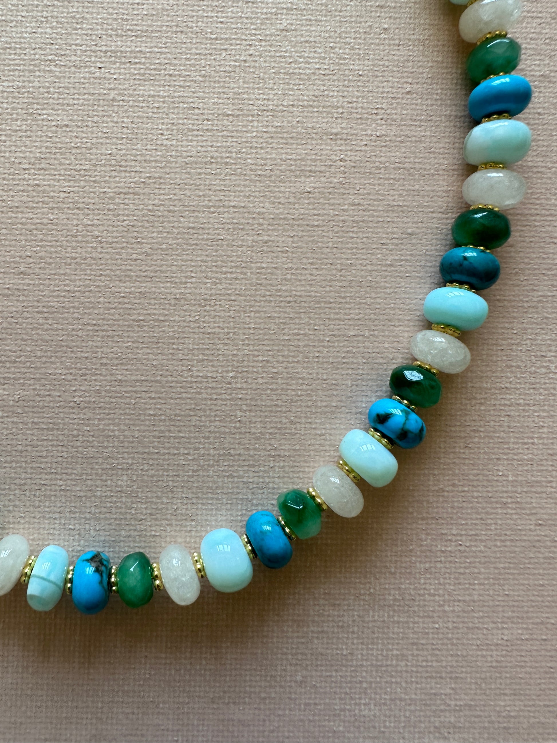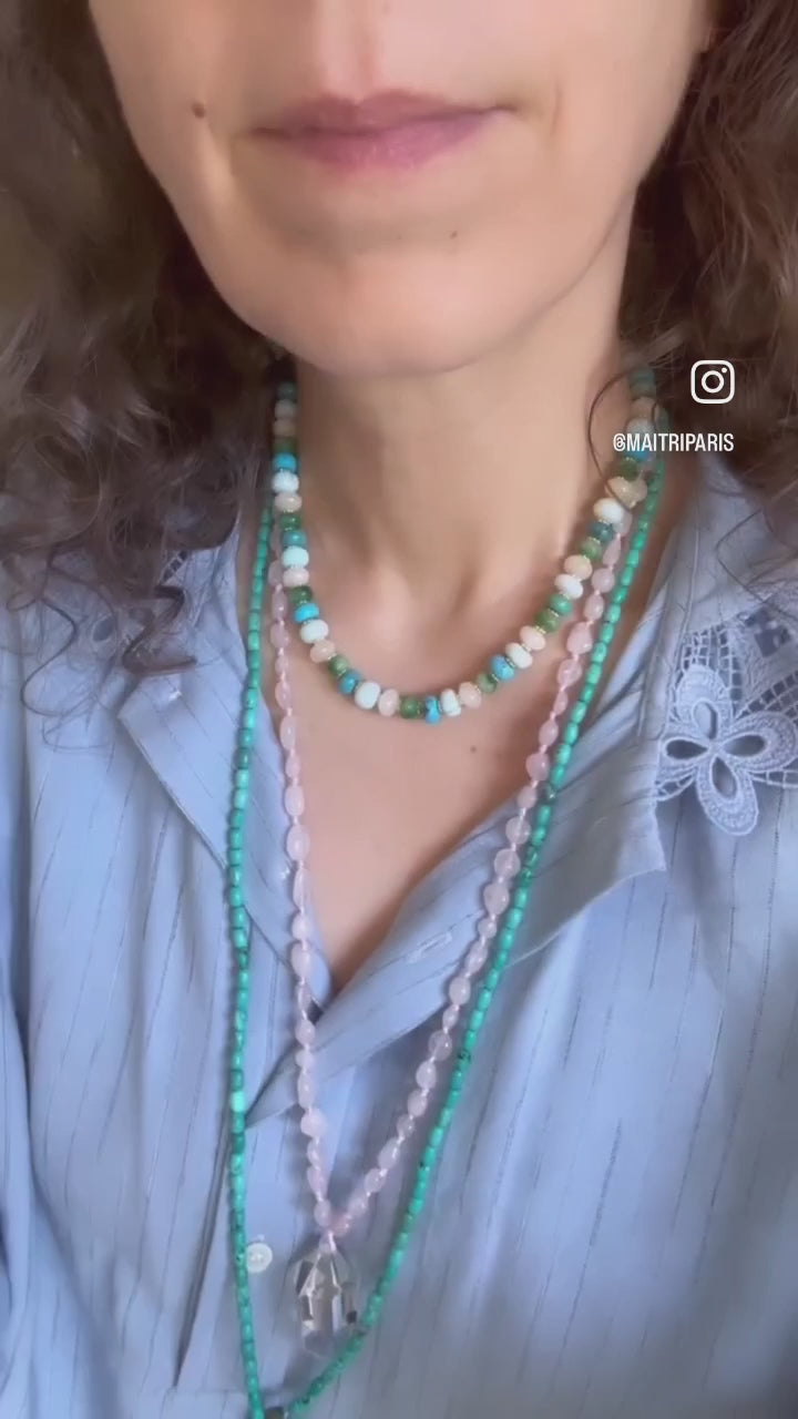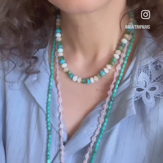 Toute la beauté naturelle des opales communes parmes et vert d'eau mêlés de turquoises, d'agates vertes, d'agates roses et de quartz blanc.