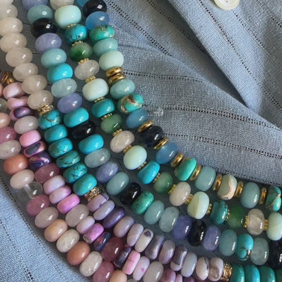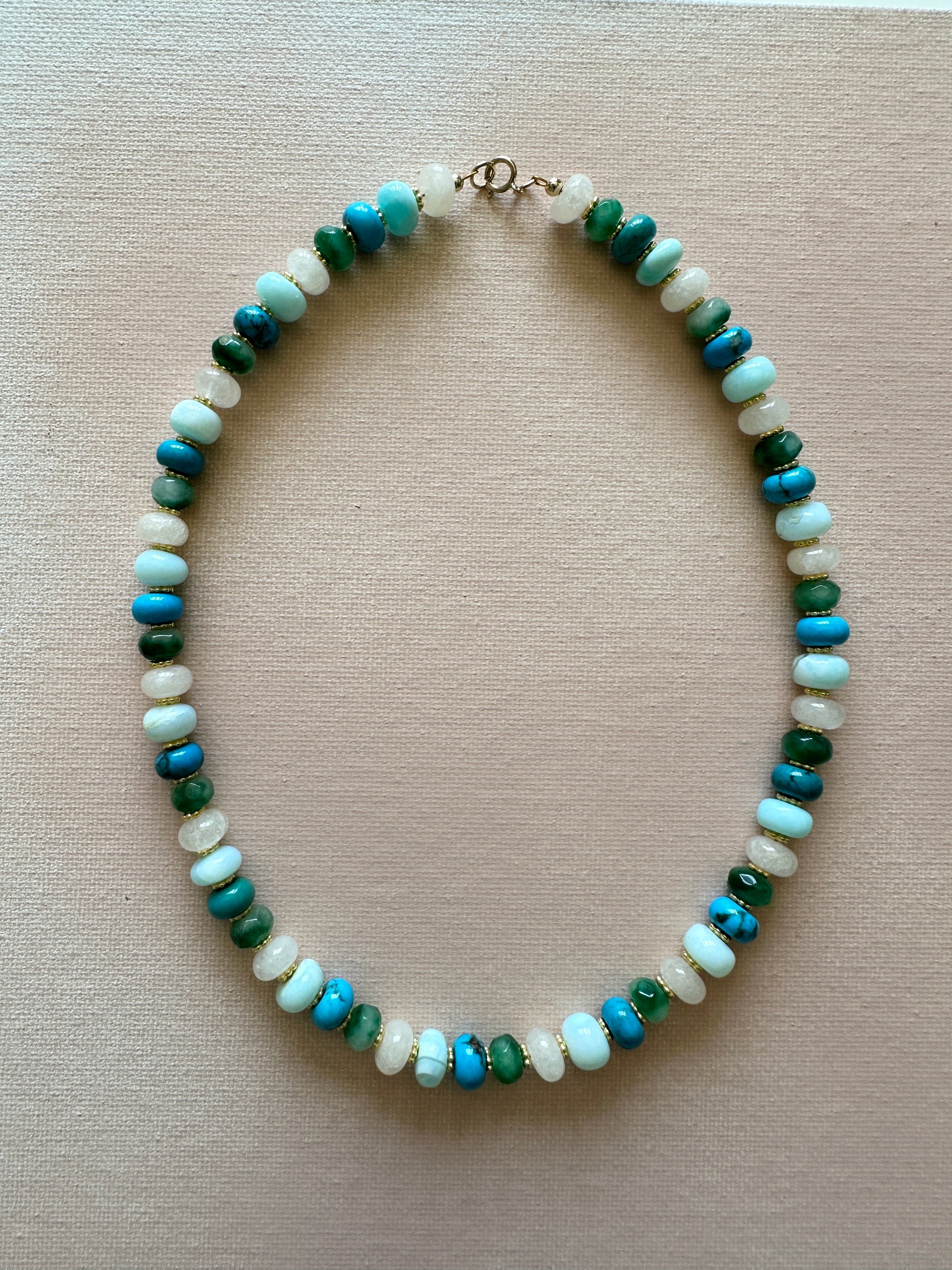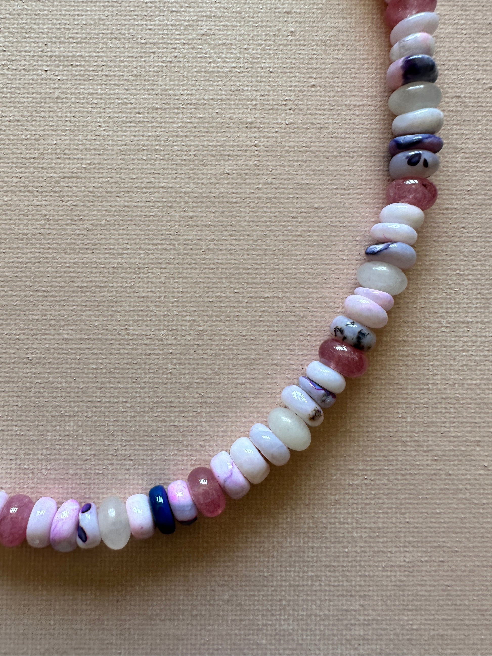 Toute la beauté naturelle des opales communes parmes et vert d'eau mêlés de turquoises, d'agates vertes, d'agates roses et de quartz blanc.