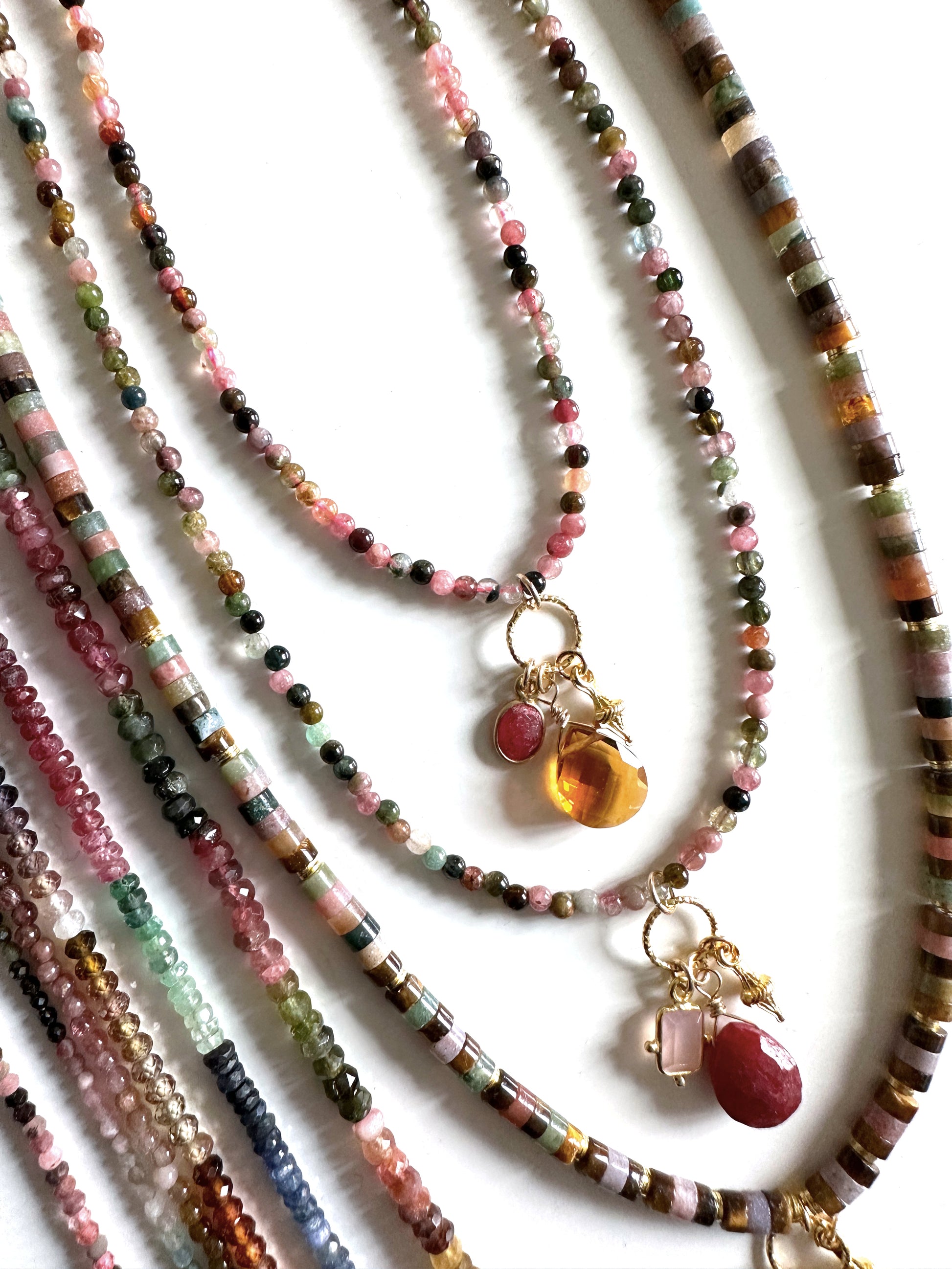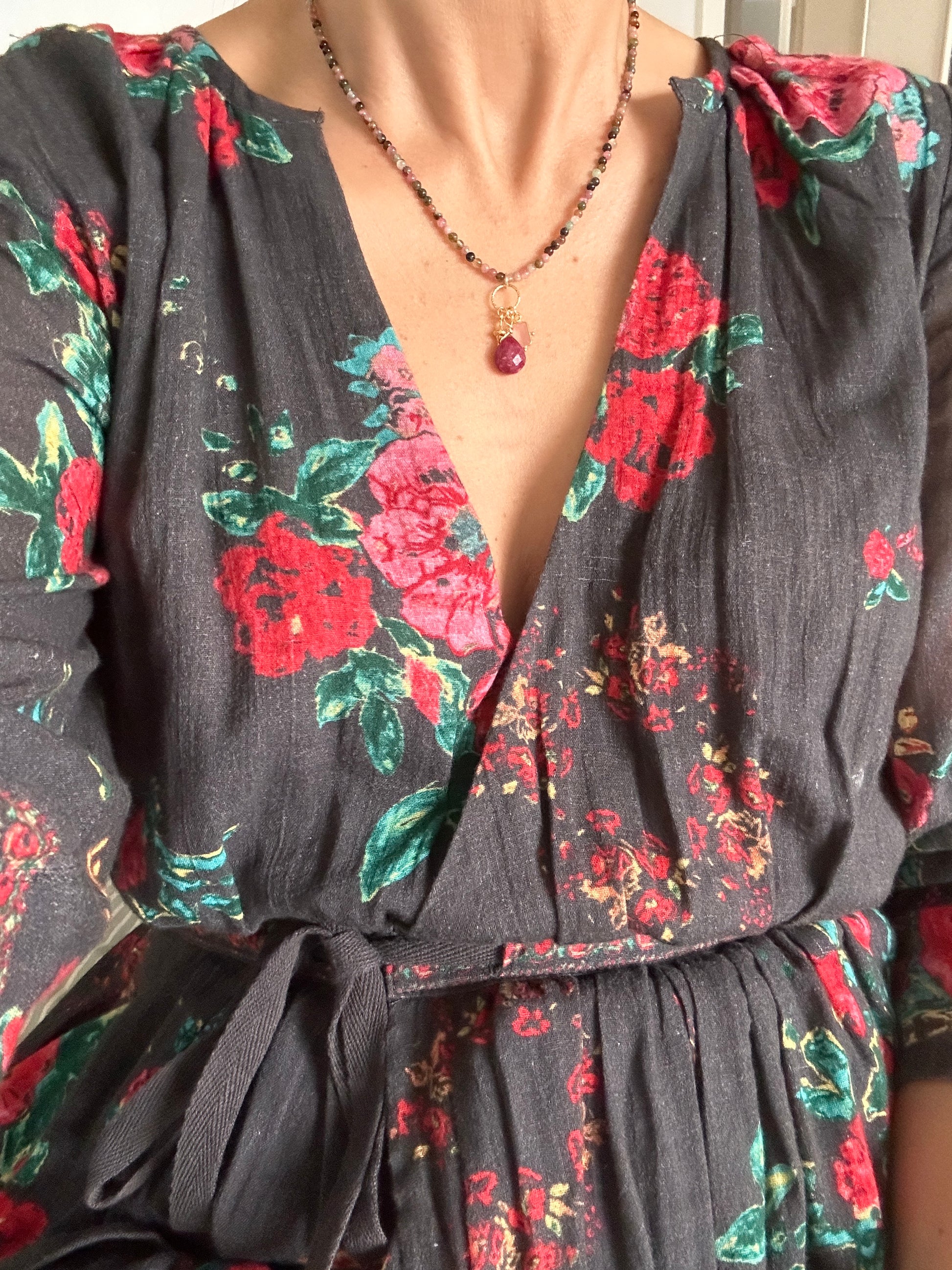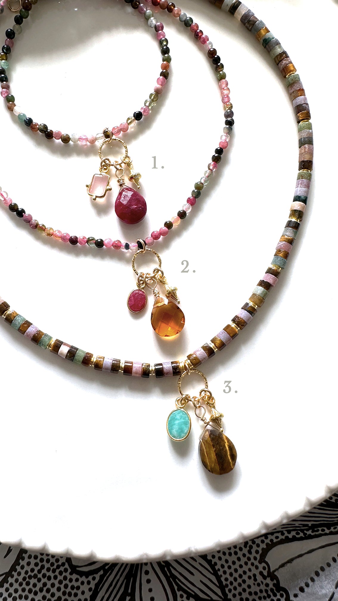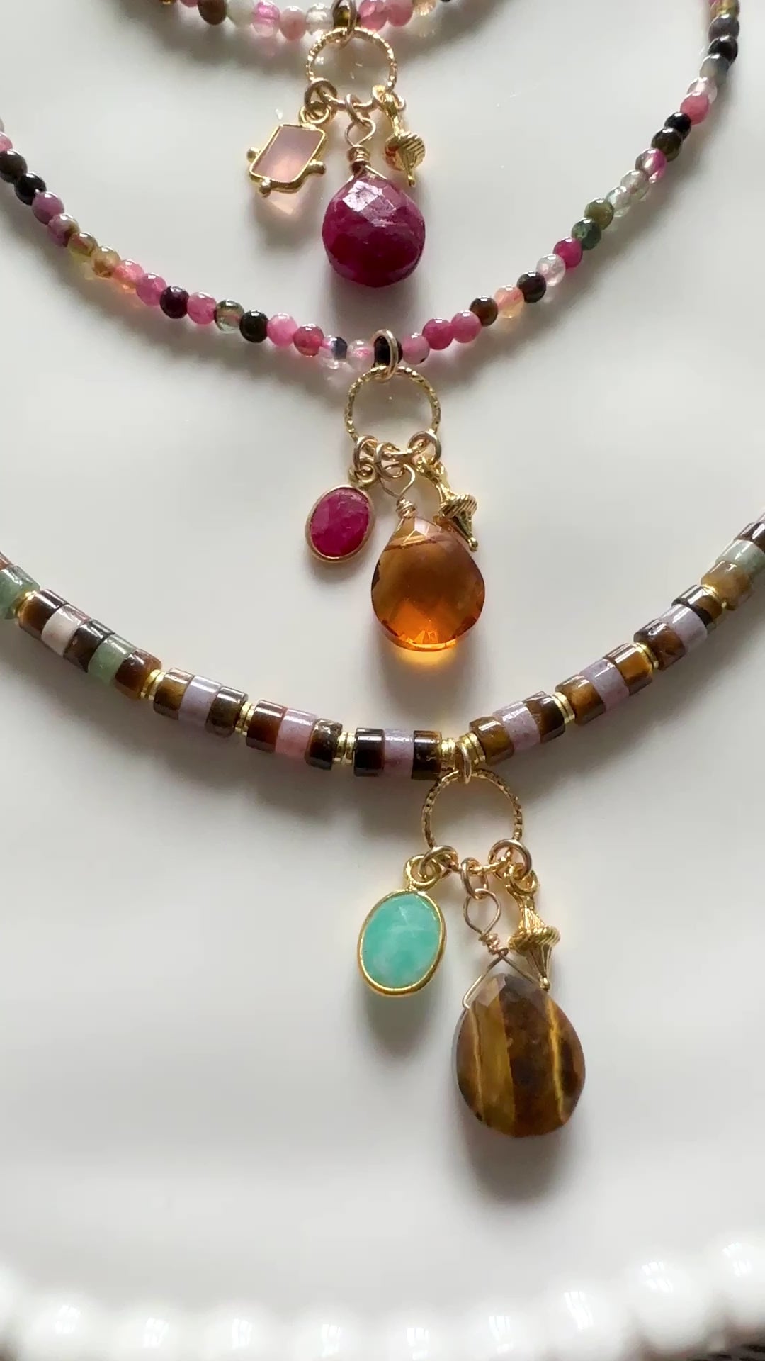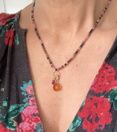• Collier 2 : Perles tourmalines multicolores 3mm, briolette en calcite miel, rubis serti en argent 925 plaqué or et petit pendant toupie - Longueur : 43cm