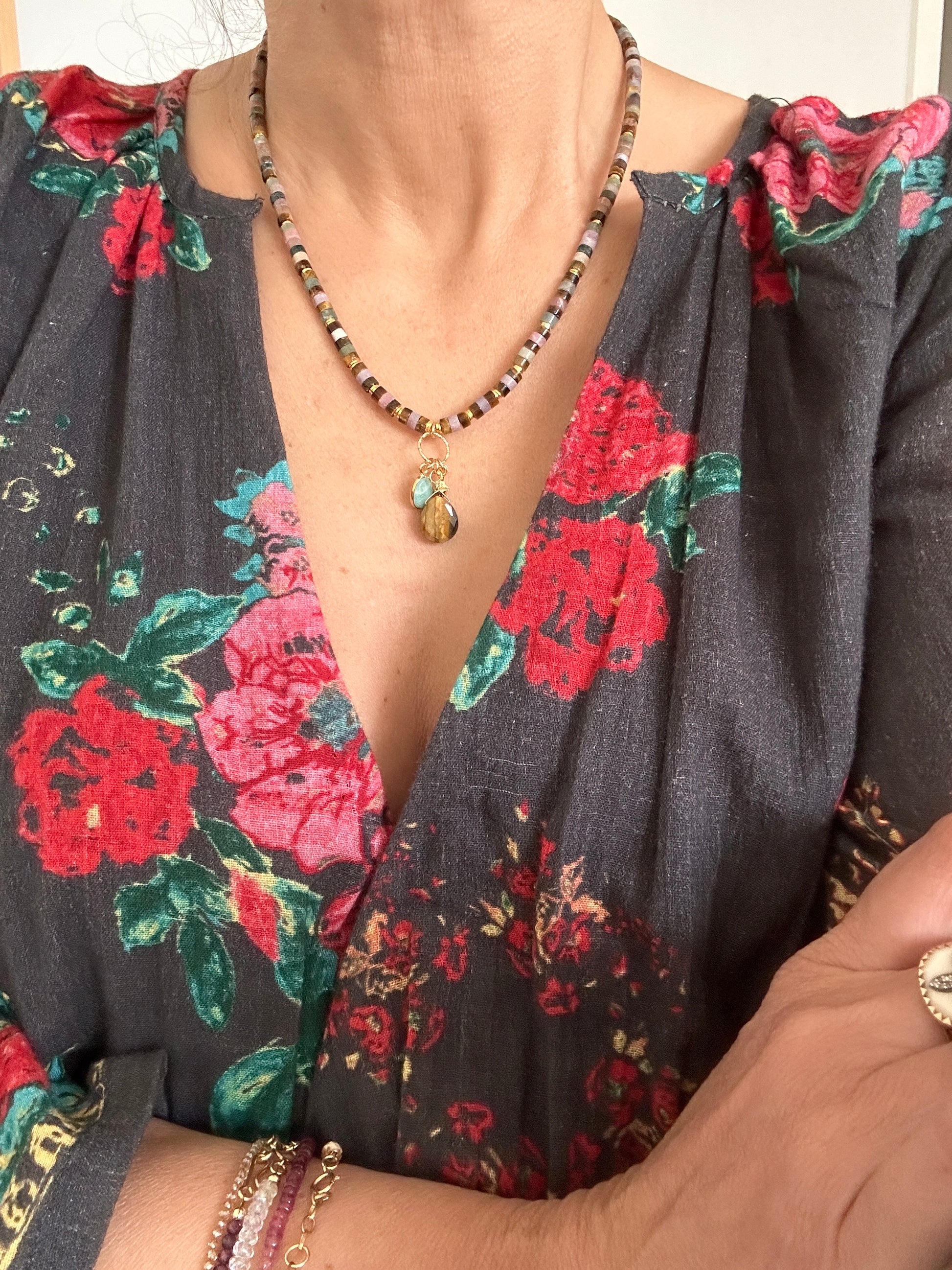 • Collier 3 : Perles heishi oeil de tigre et agates multicolores 4mm, briolette en oeil de tigre, amazonite sertie en argent 925 plaqué or et petit pendant toupie - Longueur : 44,5cm