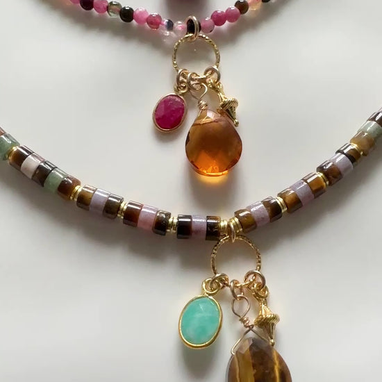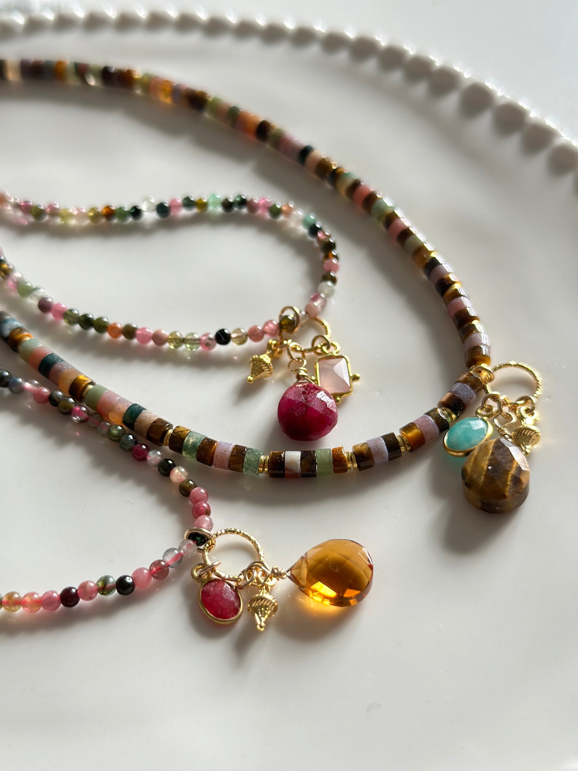 Perles de tourmalines et oeil de tigre rythment ce modèle orné d'une briolette finement facetée, déclinée en 3 pierres naturelles :