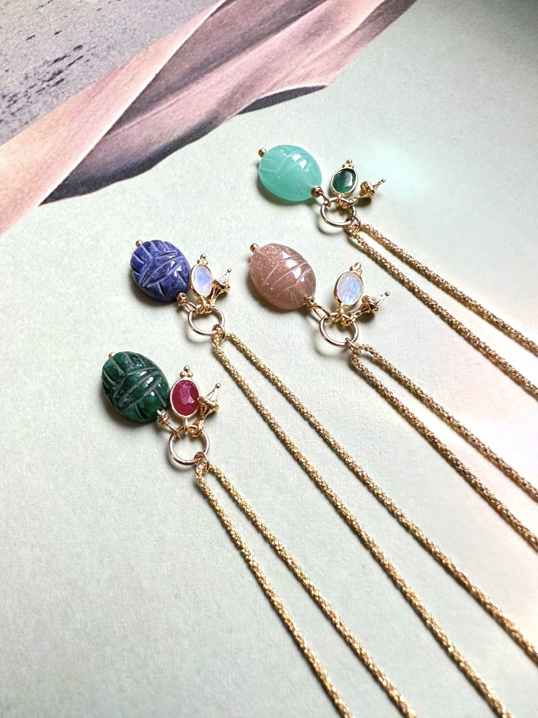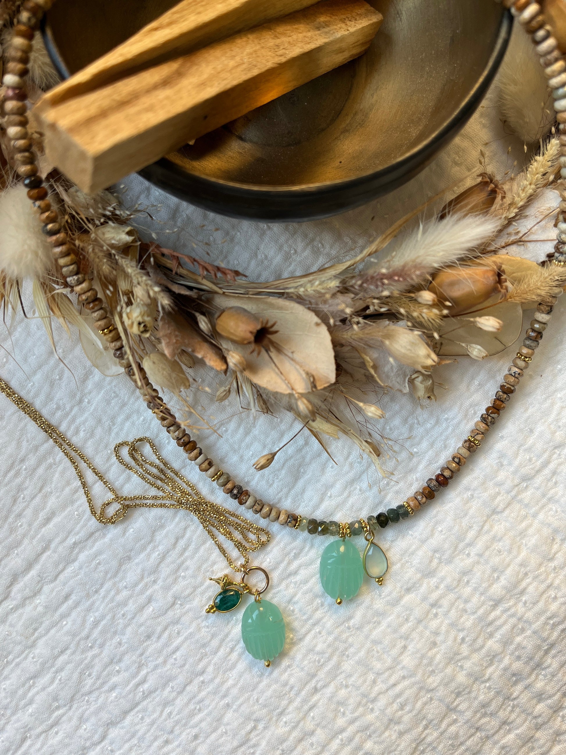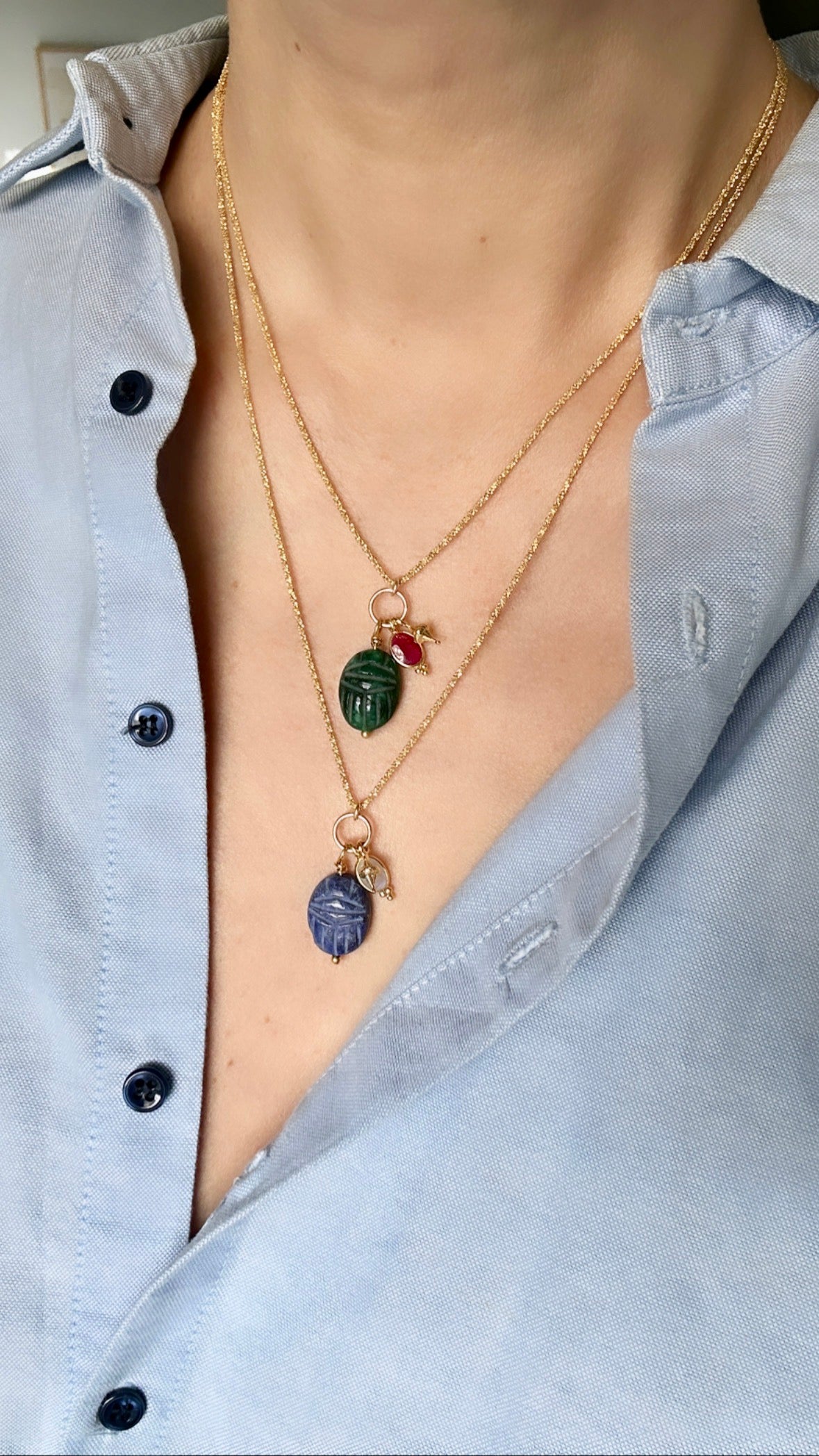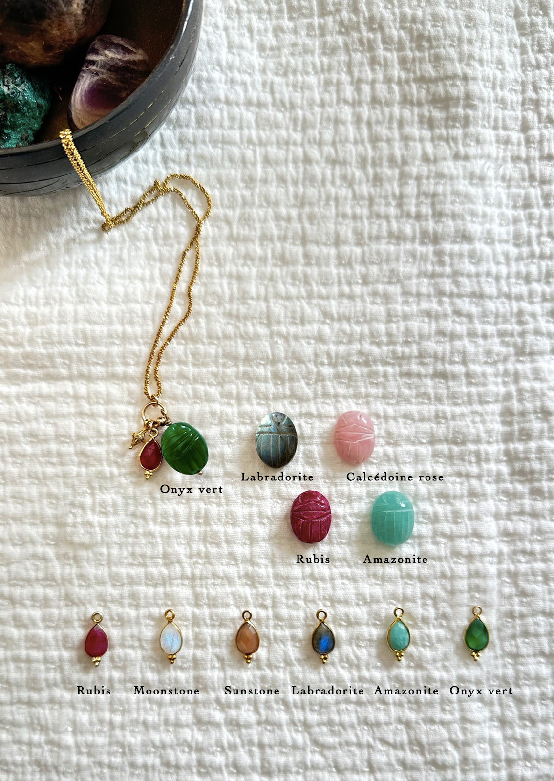 Colliers sur chaine 1mm diamantée finement : Scarabée montée sur tige boule, petite poire sertie en pierre naturelle et petit pendant toupie en métal doré.