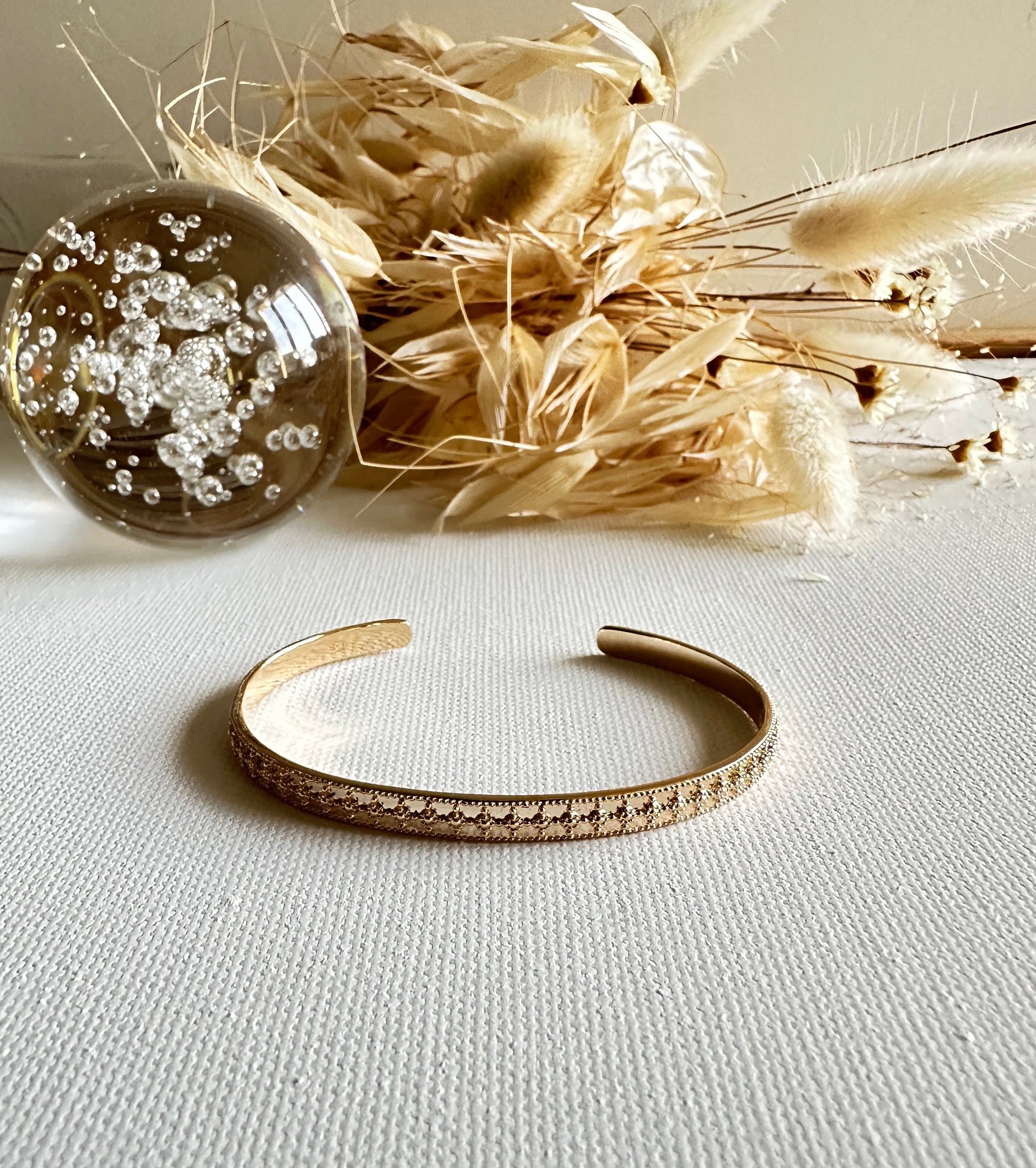 Le jonc ILA a ce petit coté ethnique que je chéris . Il est en laiton plaqué or 18 carats 750/000 - 3 microns.
