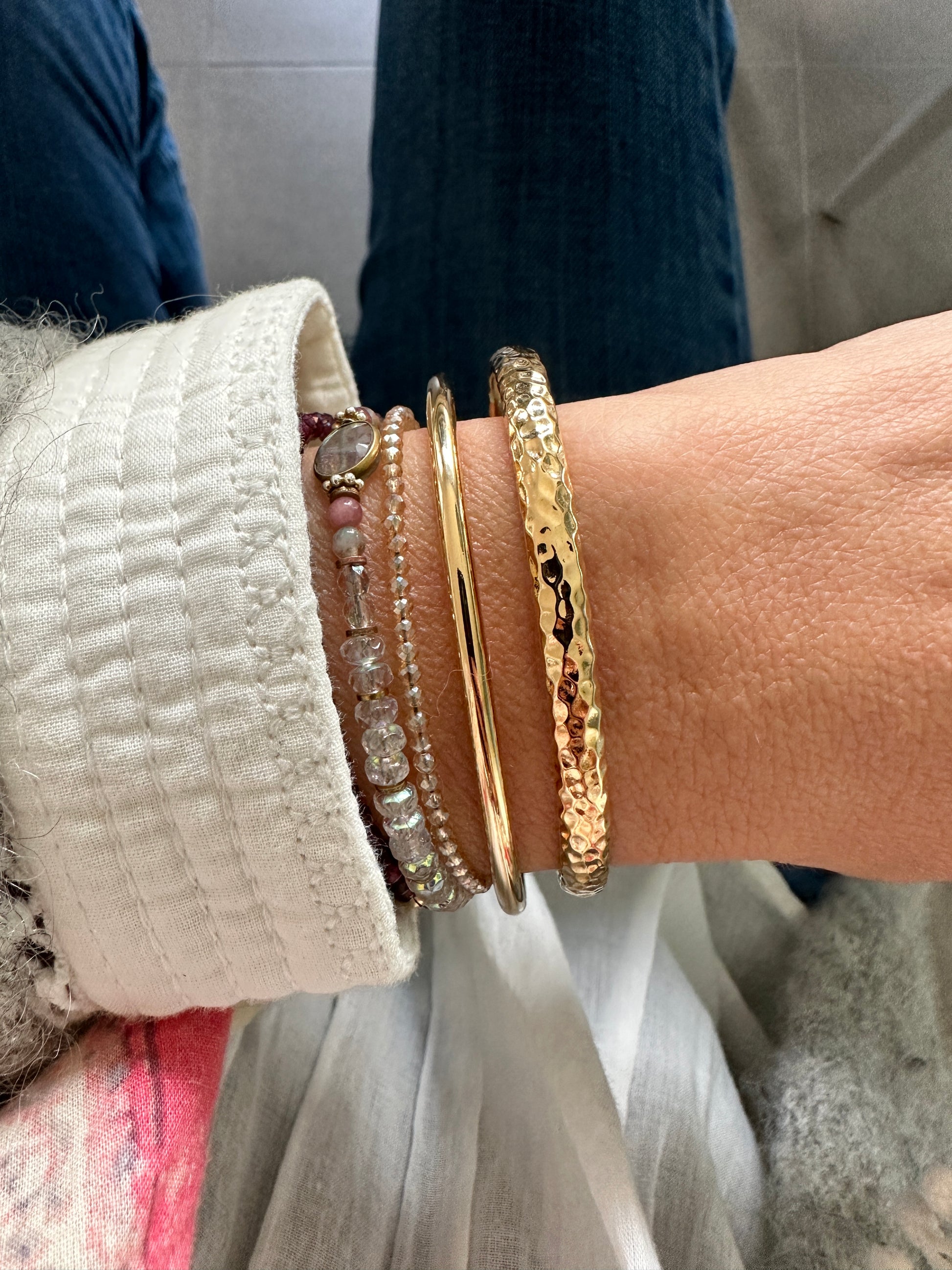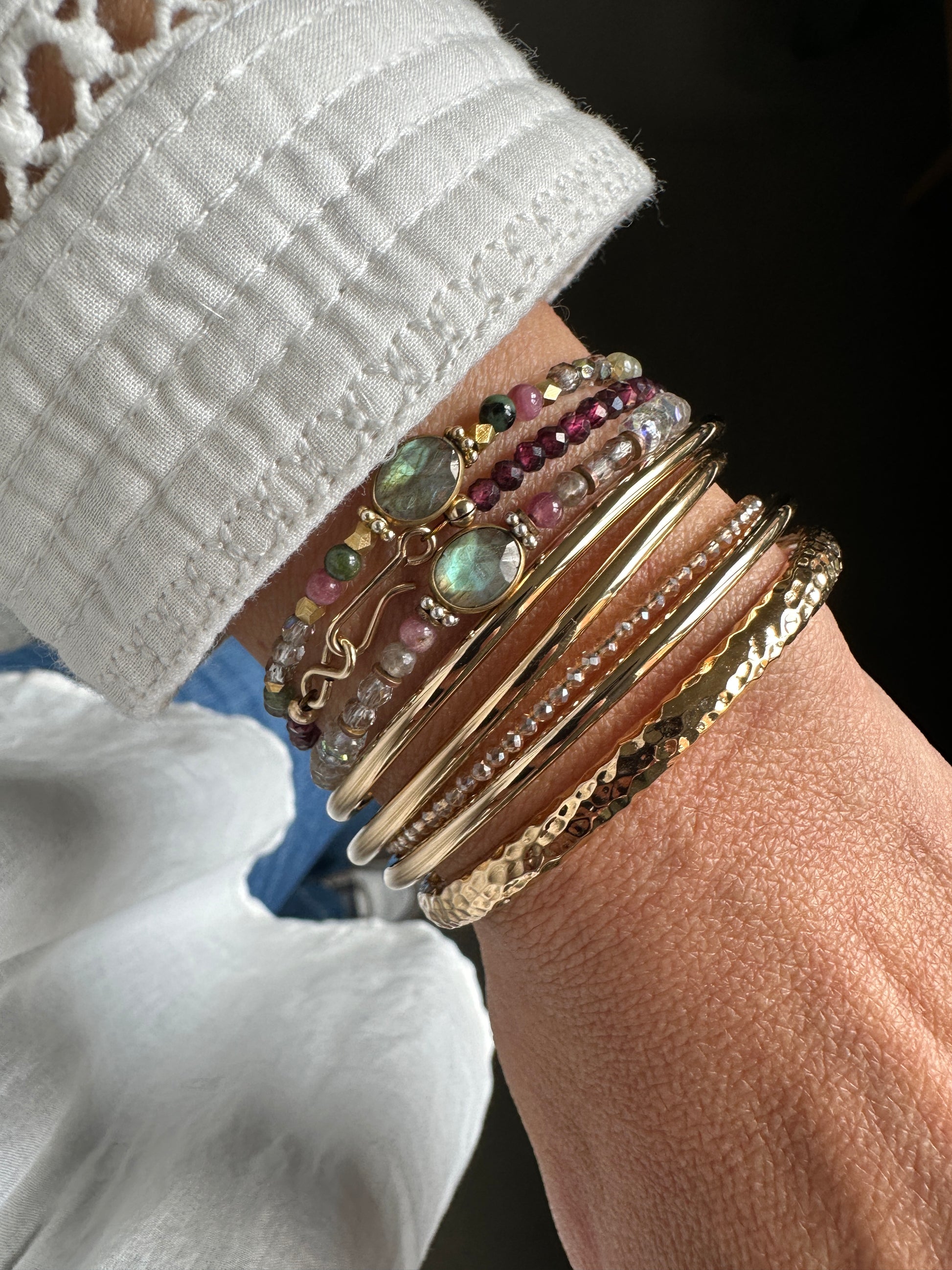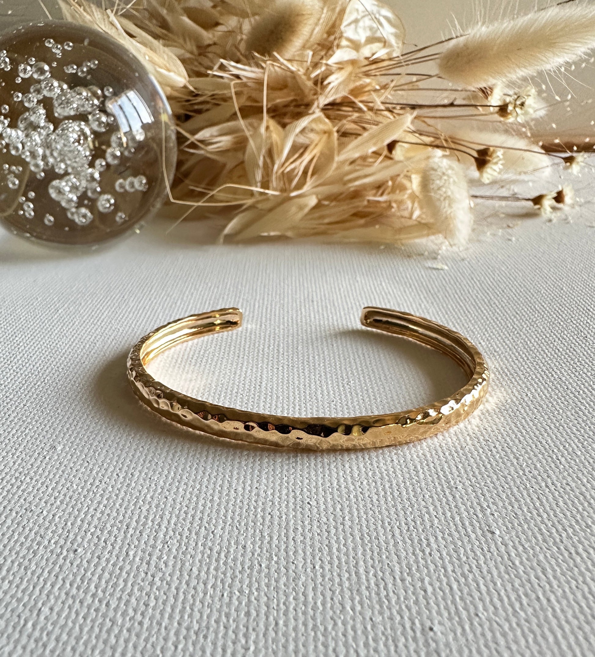 Le jonc JAIN révèle la beauté simple du métal martelé . Il est en laiton plaqué or 18 carats 750/000 - 3 microns.