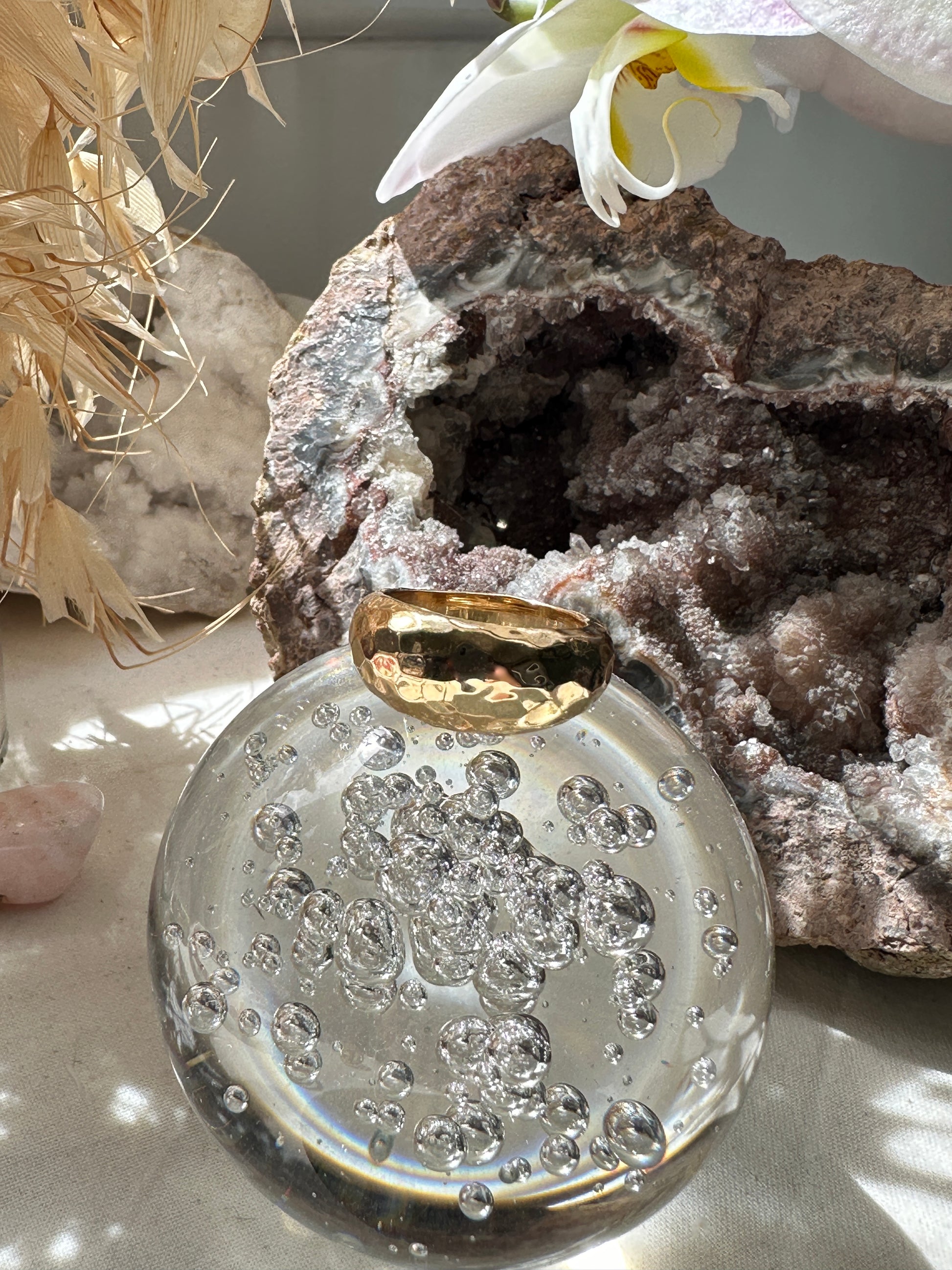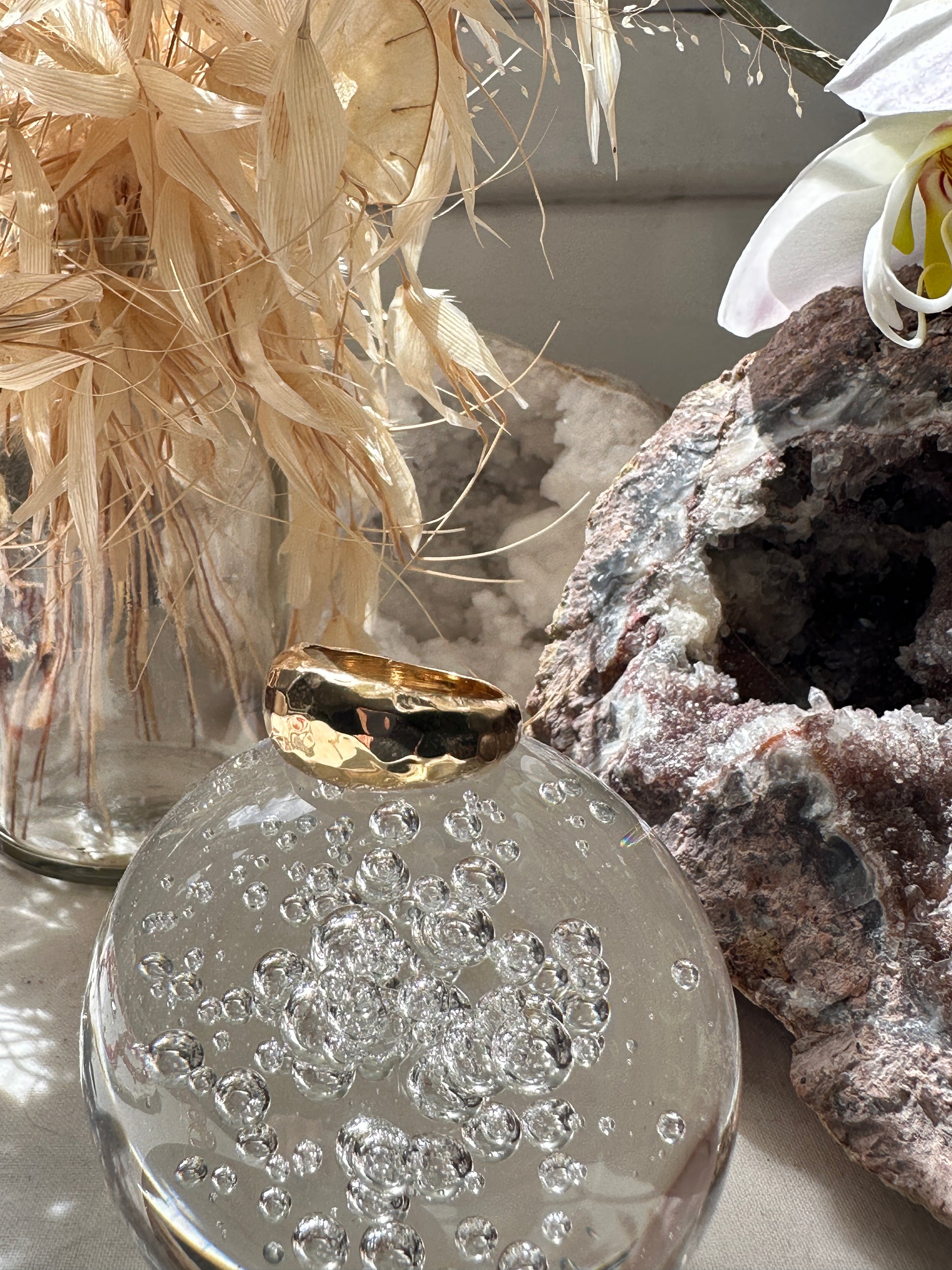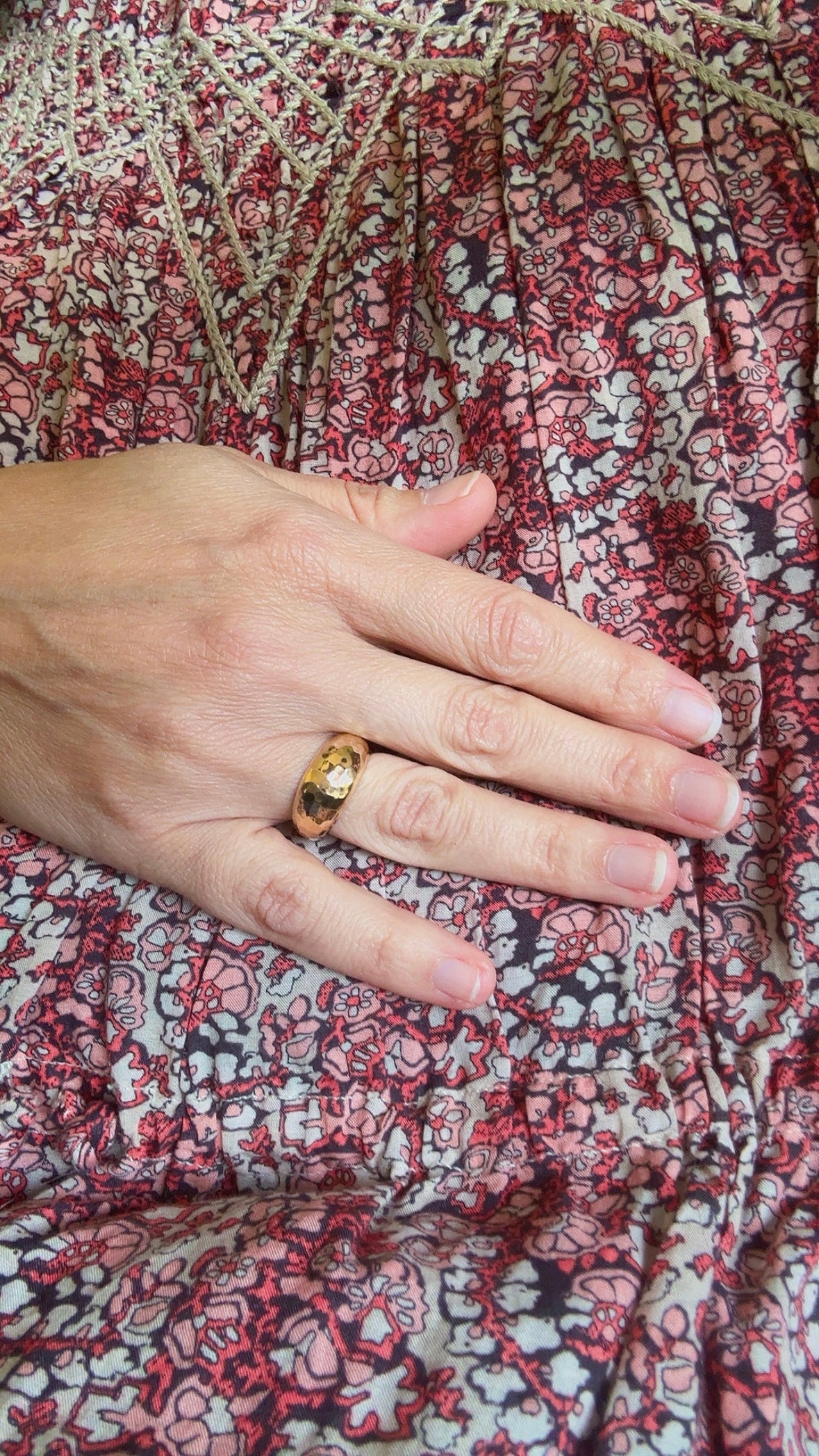 Une bague anneau bombée et martelée assortie au jonc et aux boucles d'oreille Jain de la même collection.