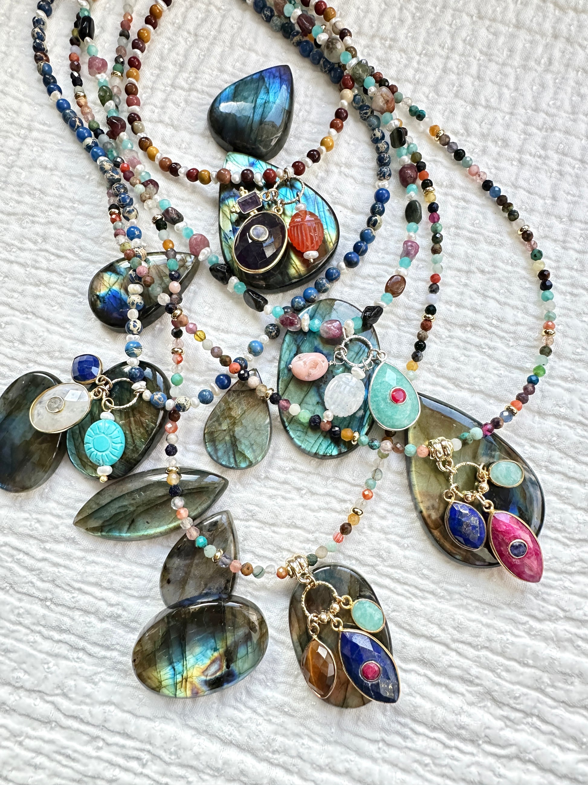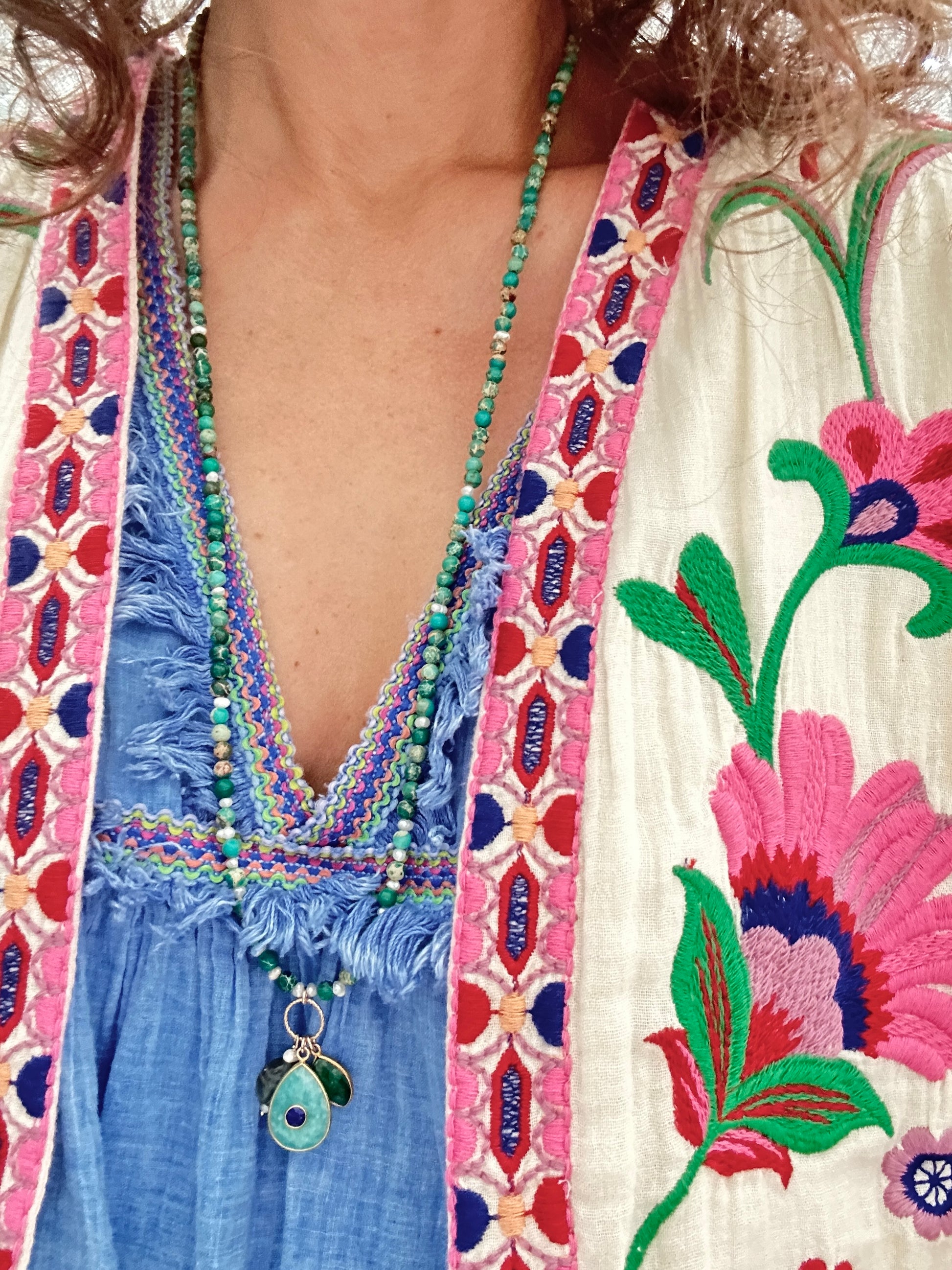 • Sautoir Surya Jaspe Impérial Vert : perles jaspe imperial vert, perles d'eau douce, pendentif poire amazonite avec lapis-lazuli au centre, goutte en malachite et scarabée en labradorite.