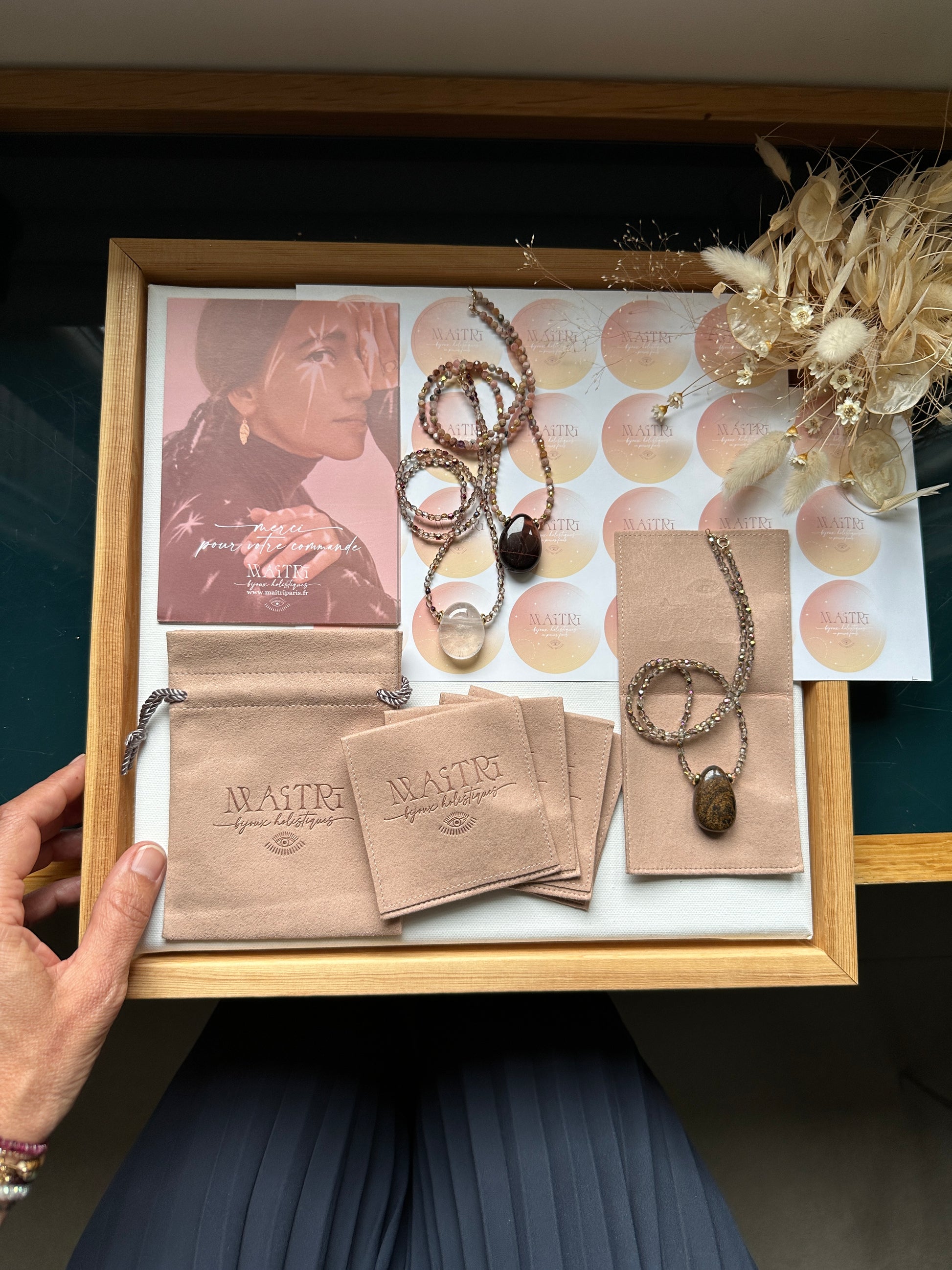 Chaque sautoir sera livré dans un pochon blush au logo de la marque et 3 cartes, le tout emballé dans une délicate pochette en calque translucide.