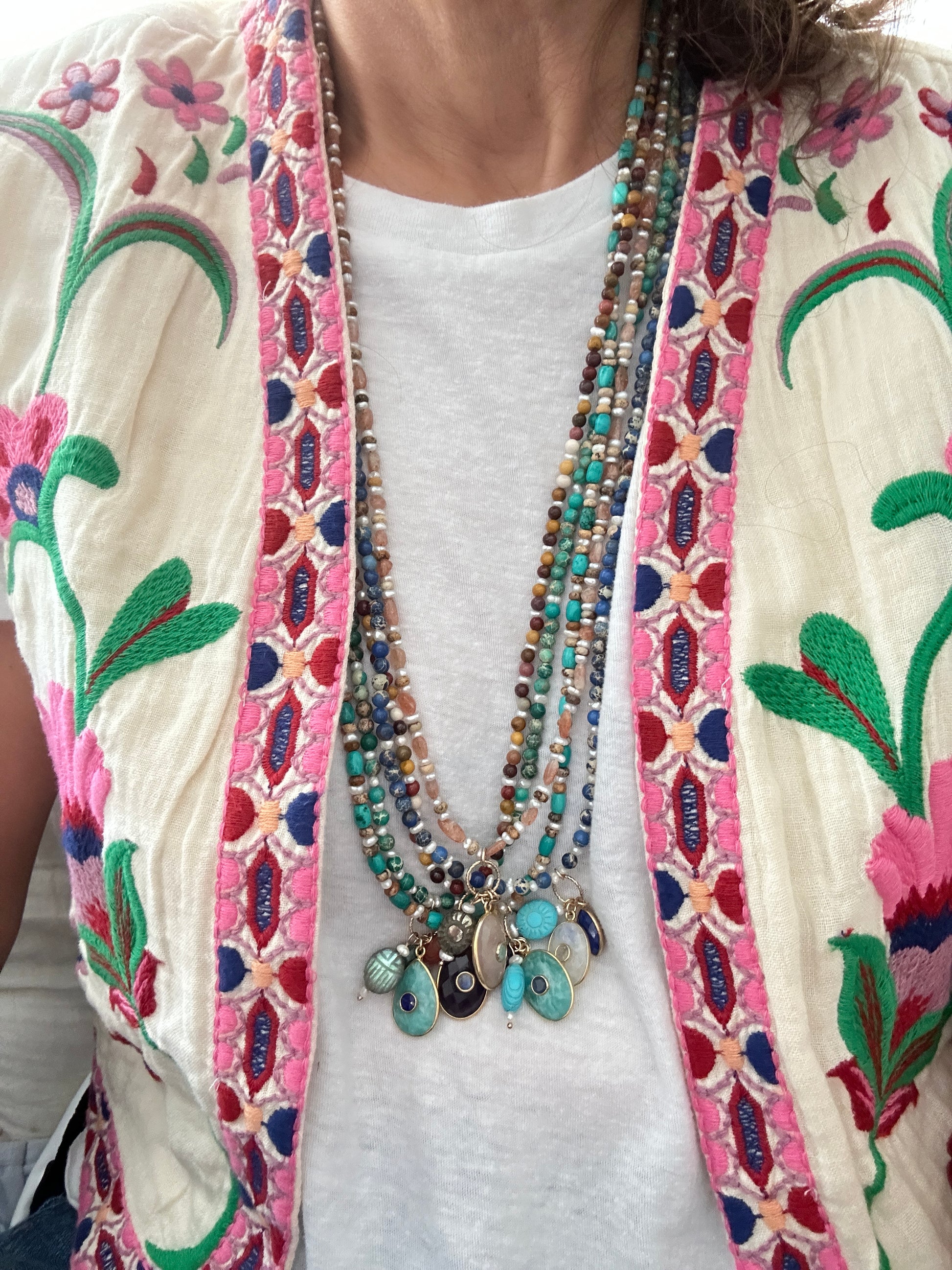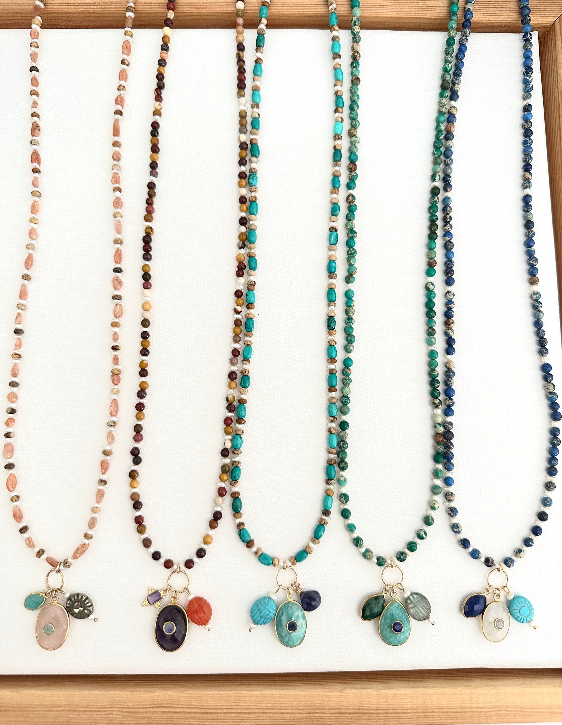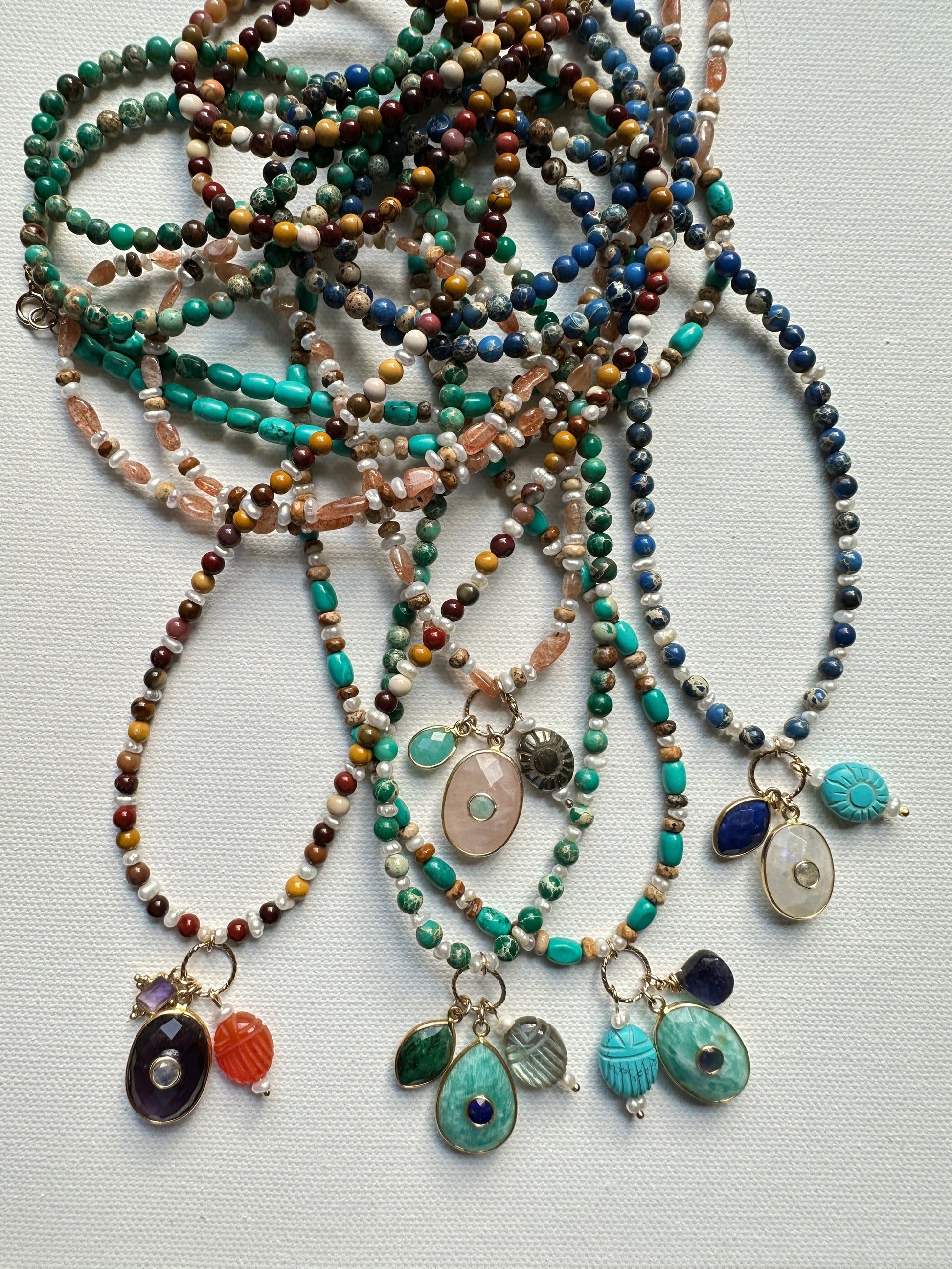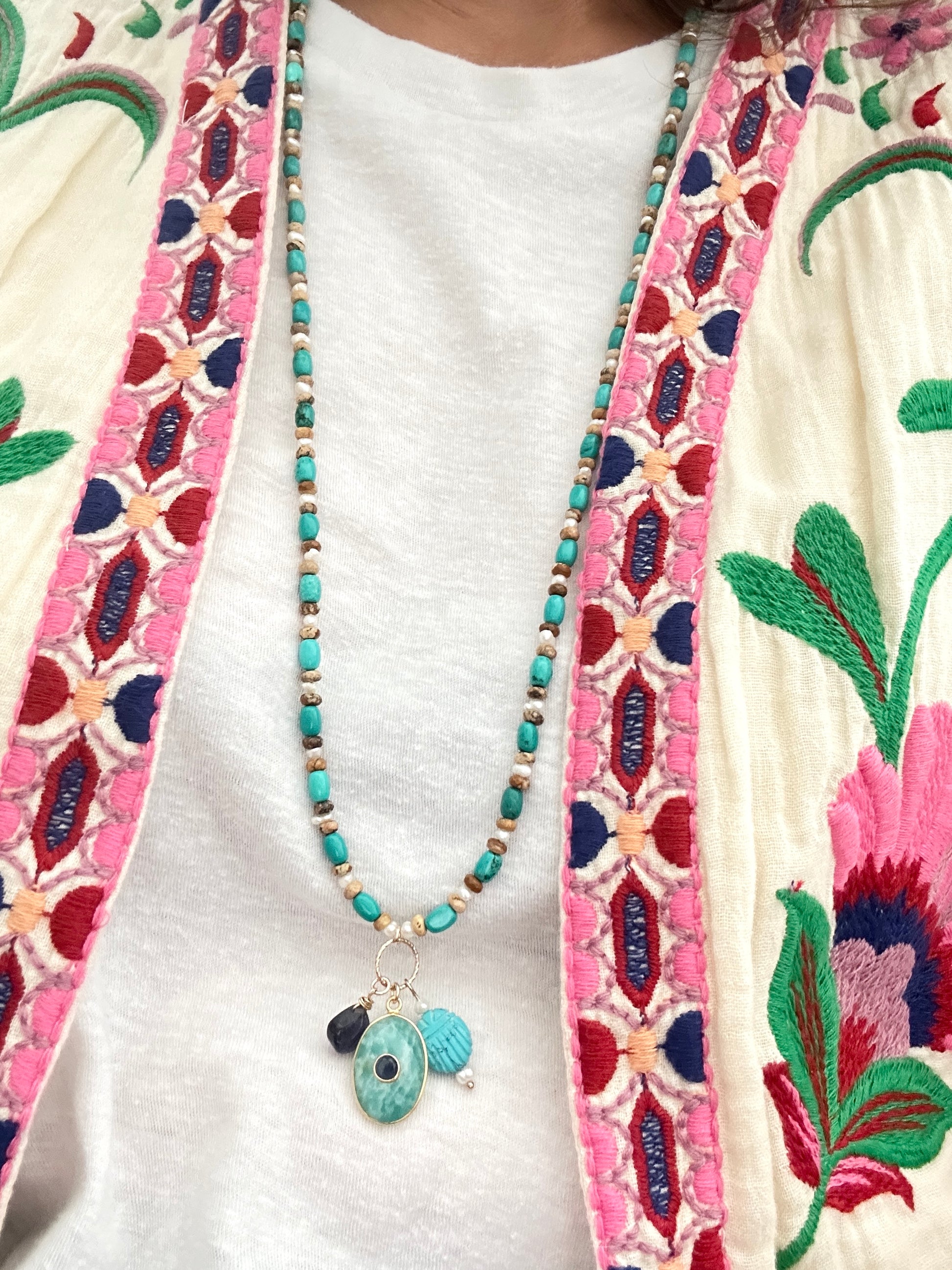 • Sautoir Surya Turquoise : perles Turquoises premium, perles d'eau douce, perles jaspe paysage, pendentif ovale en amazonite avec calcédoine au centre, goutte en iolite violette, scarabée en howlite turquoise.