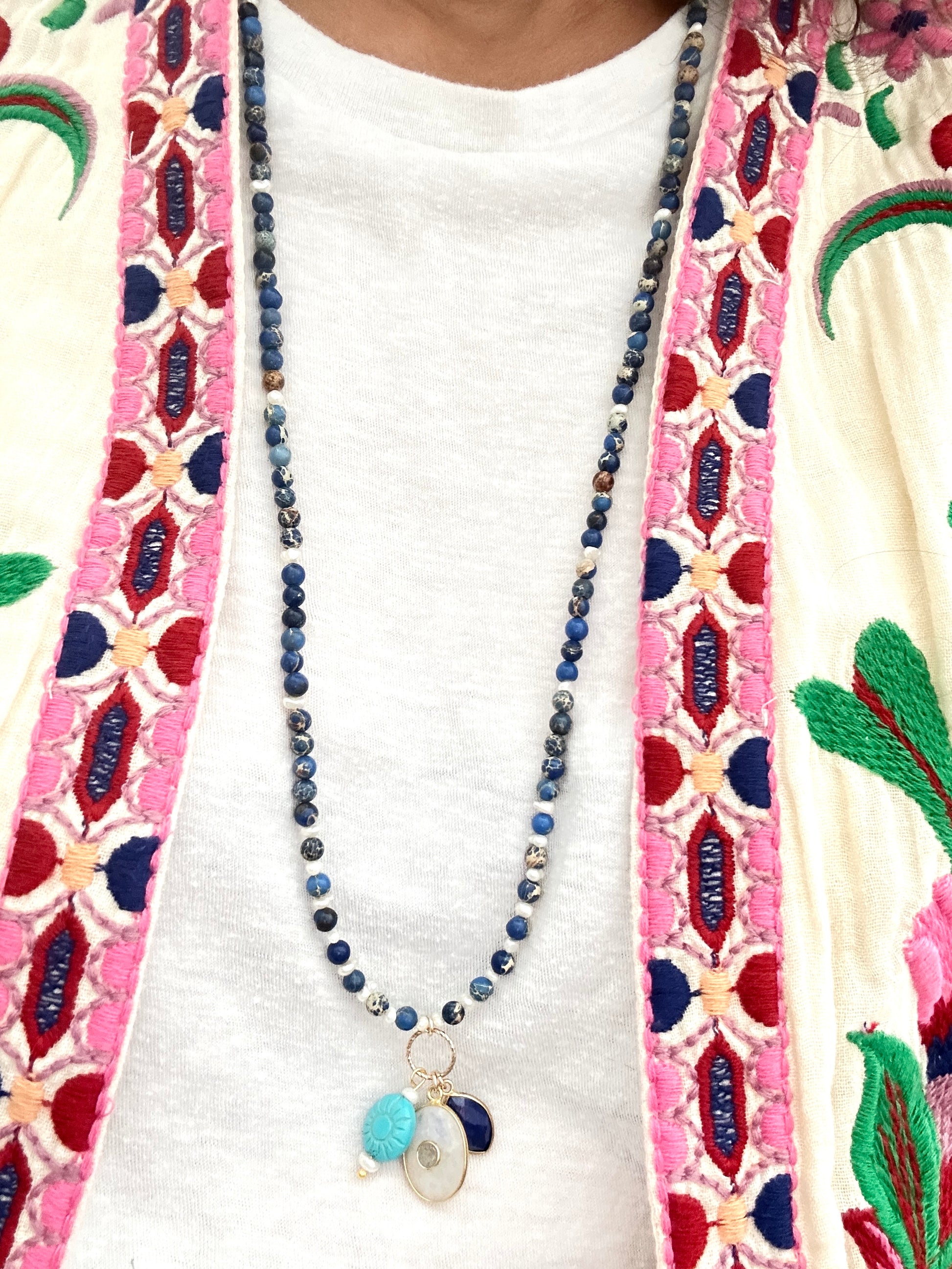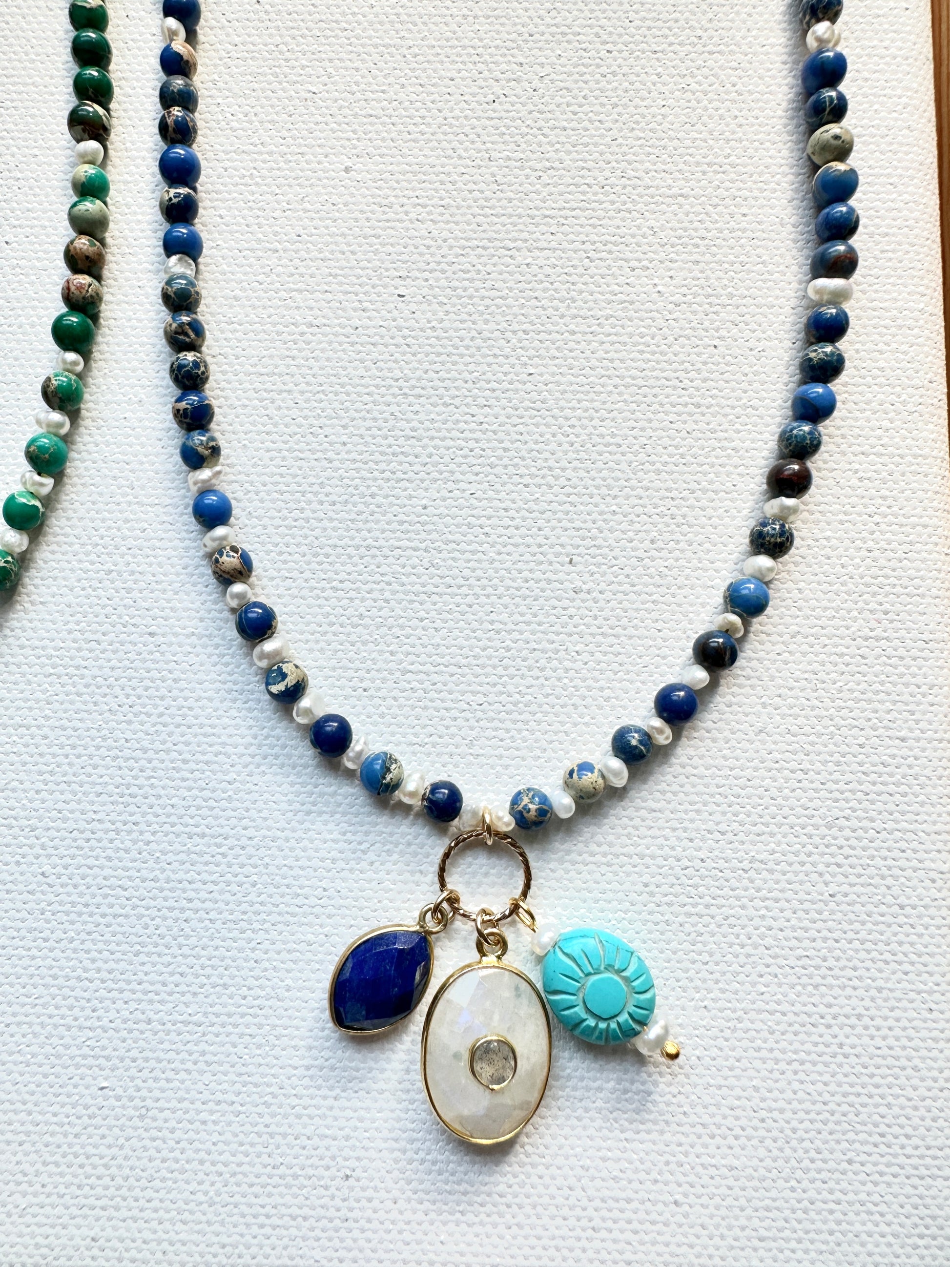• Sautoir Surya Jaspe Impérial Bleu : perles jaspe impérial bleu, perles d'eau douce, pendentif ovale en moonstone avec labradorite au centre, goutte en lapis-lazuli et soleil en Howlite turquoise.