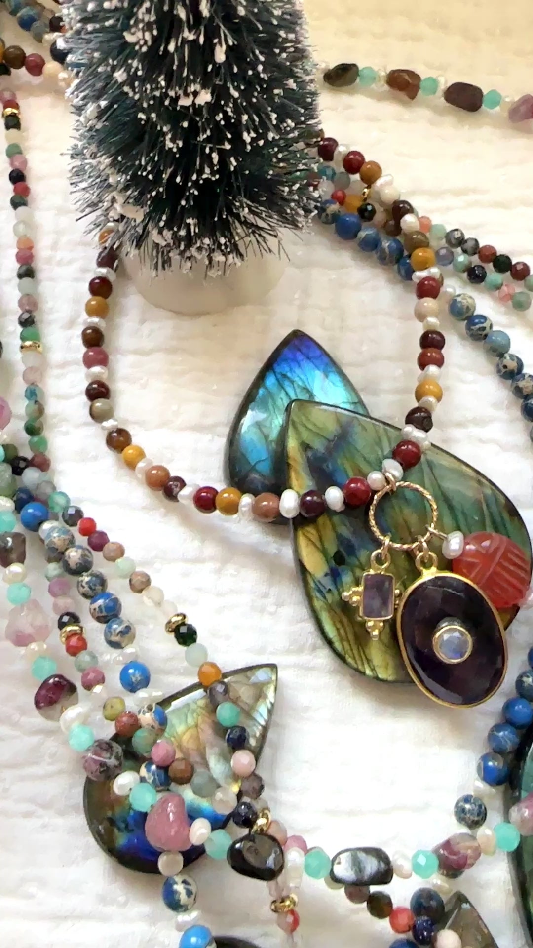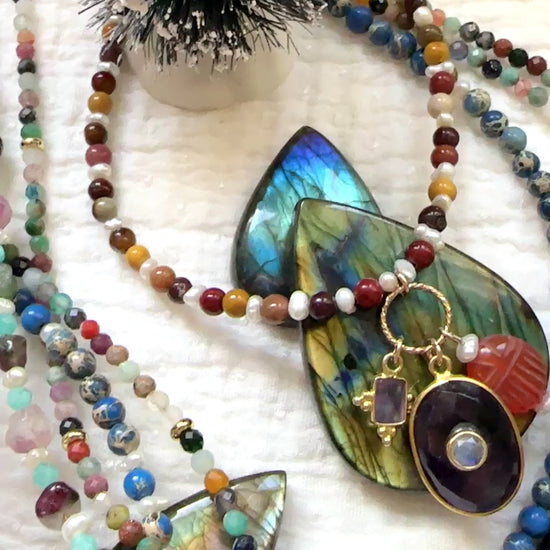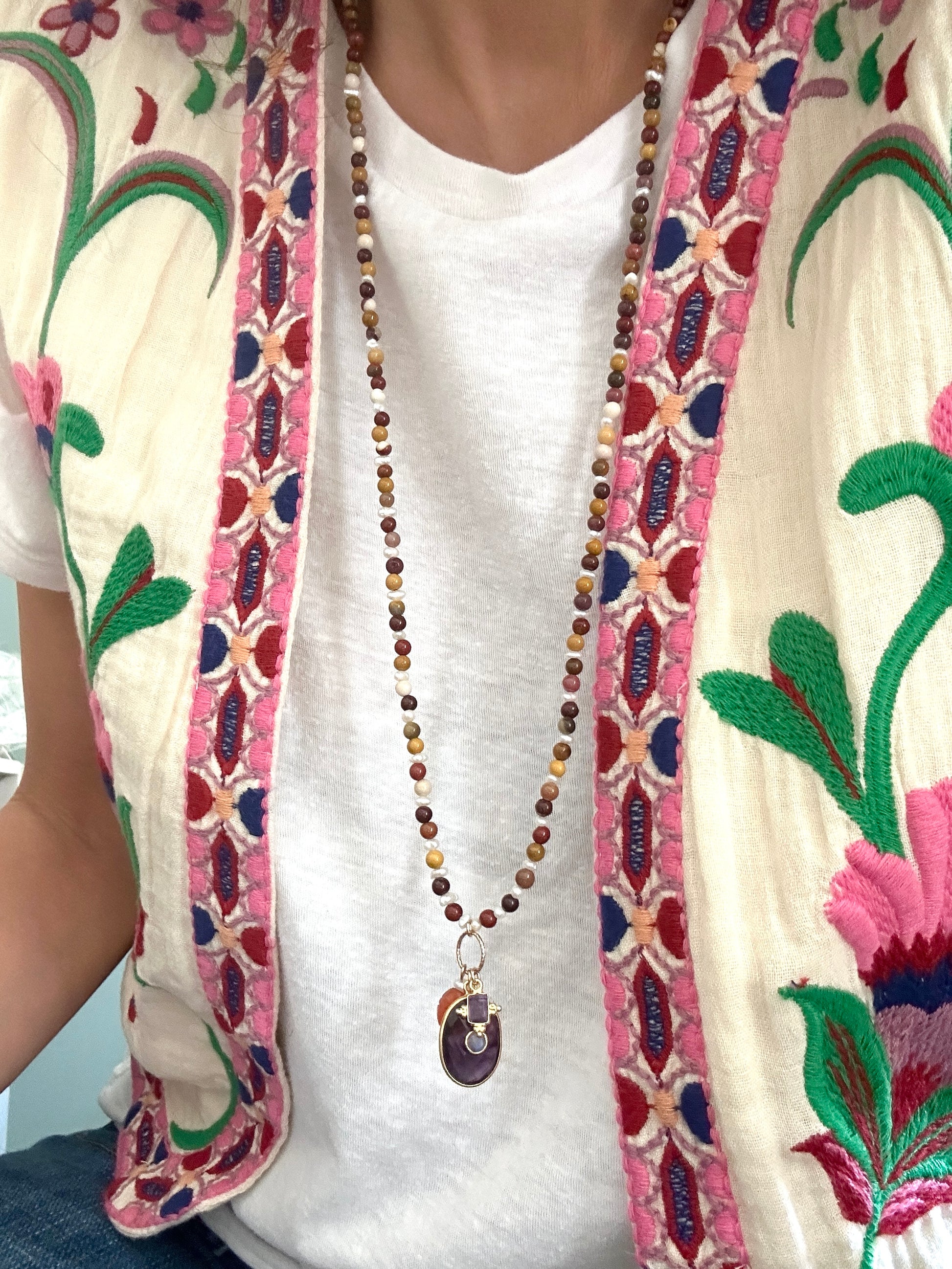 • Sautoir Surya Mokaïte : perles en Mokaïte, perles d'eau douce, pendentif ovale en améthyste avec moonstone au centre, rectangle serti en améthyste et scarabée en cornaline