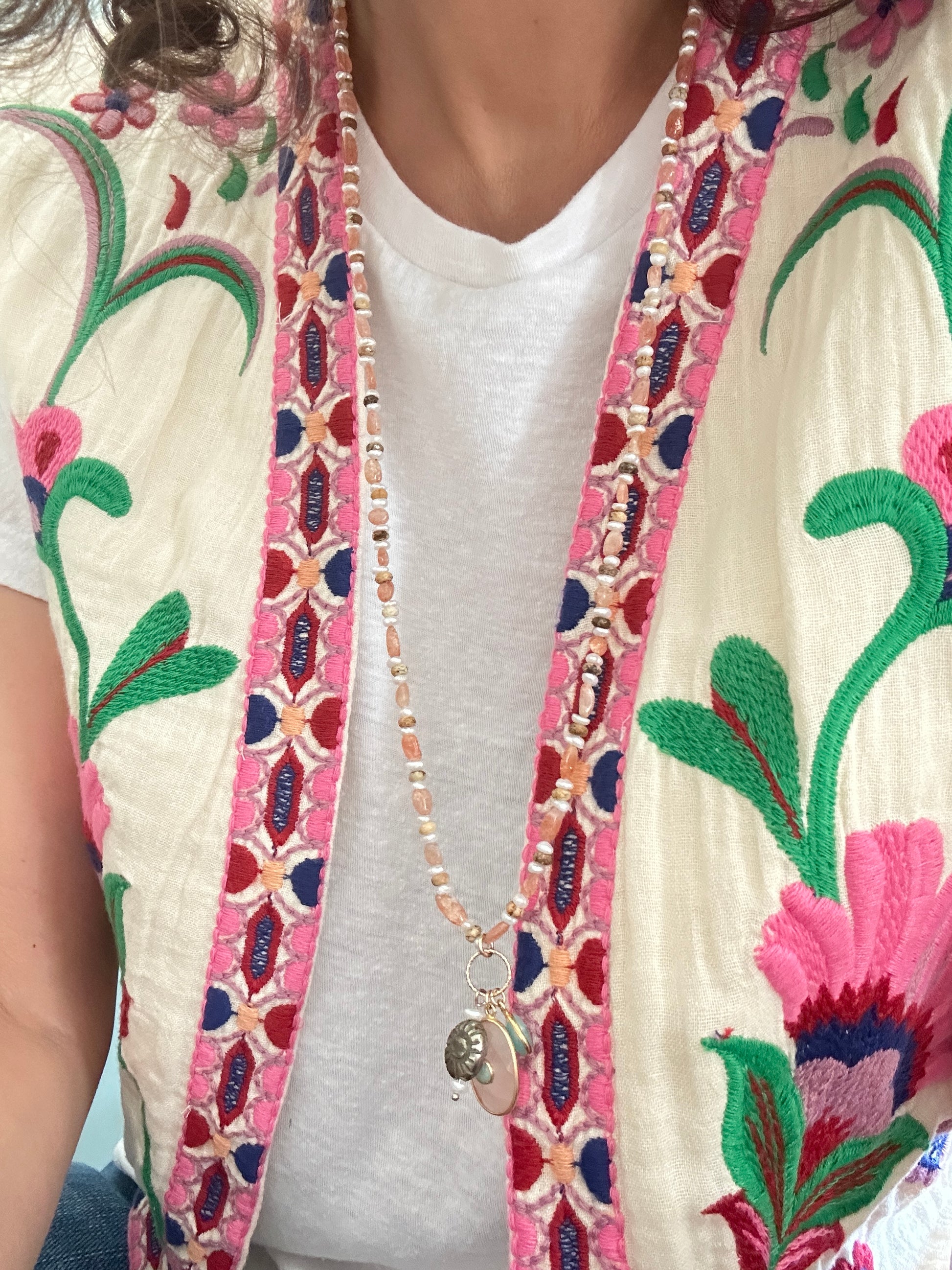 • Sautoir Surya Pierre de soleil : perles pépite en pierre de soleil, perles d'eau douce et perles en jaspe paysage, pendentif ovale en quart rose avec amazonite au centre, ovale en amazonite et soleil gravé sur pyrite.